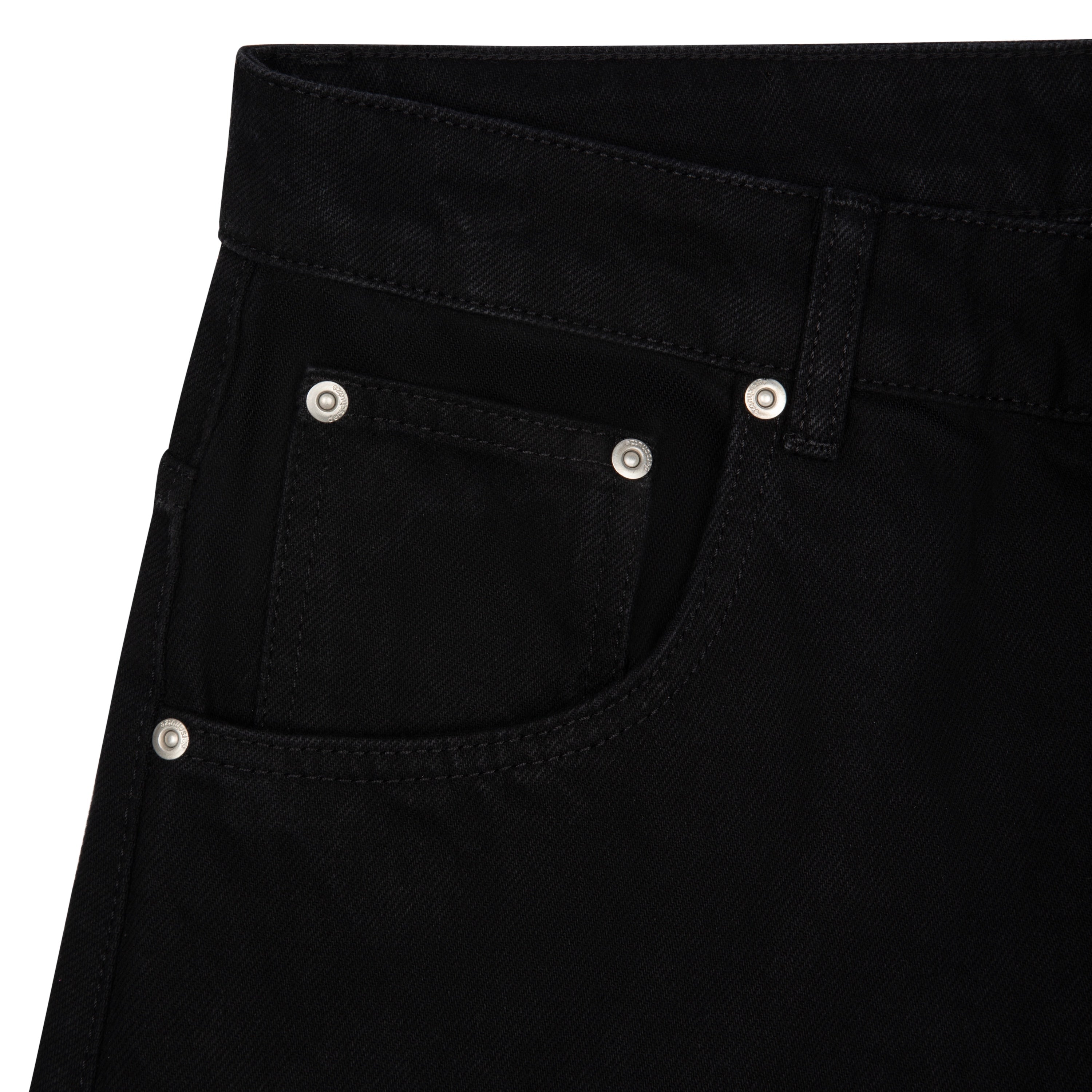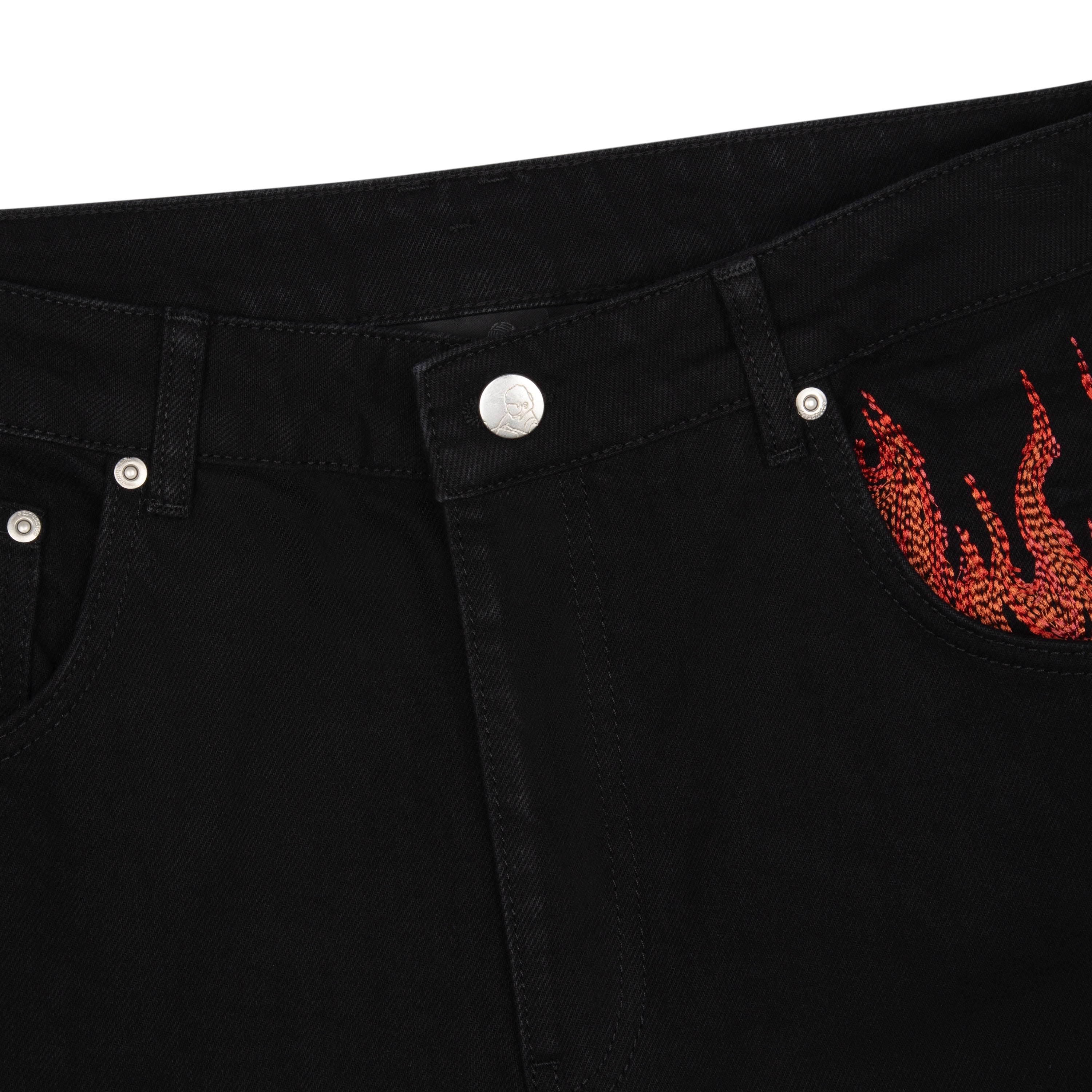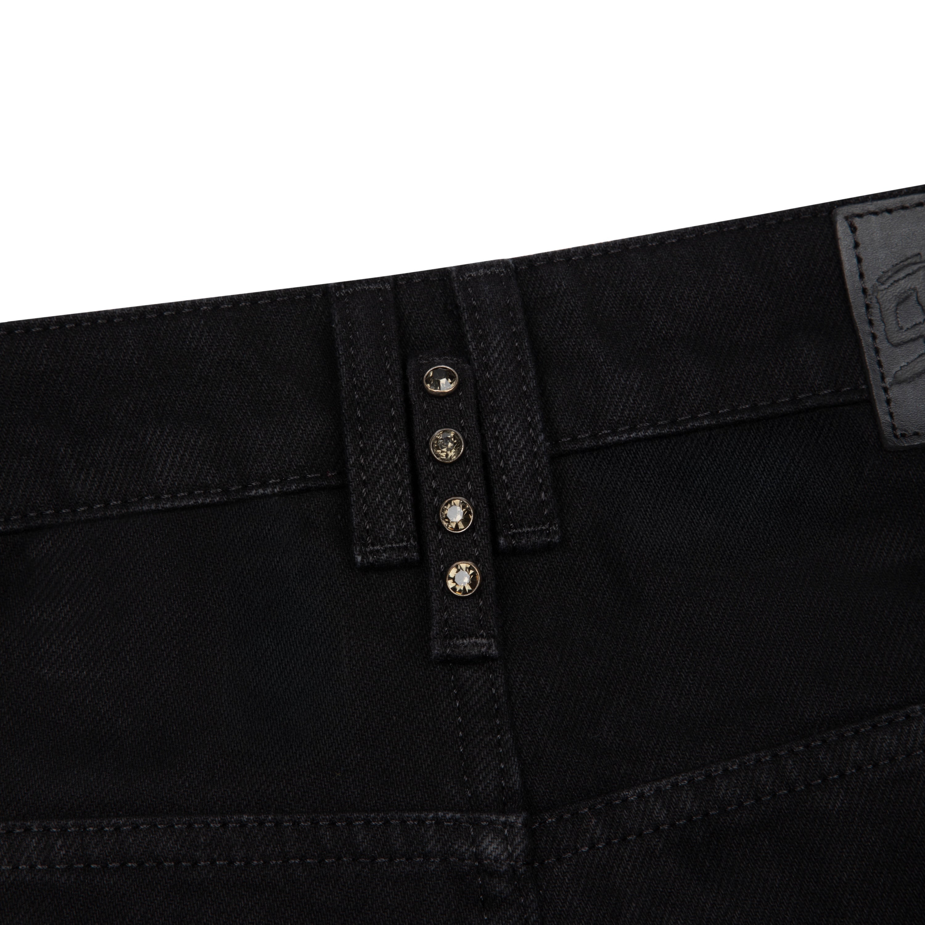 14,5oz denim / 100% cotton / embroidery on left side and front pocket inside / embossed printed leather patch / rhinestone application details on loop / wash inside out / balloon fit / fits true to size