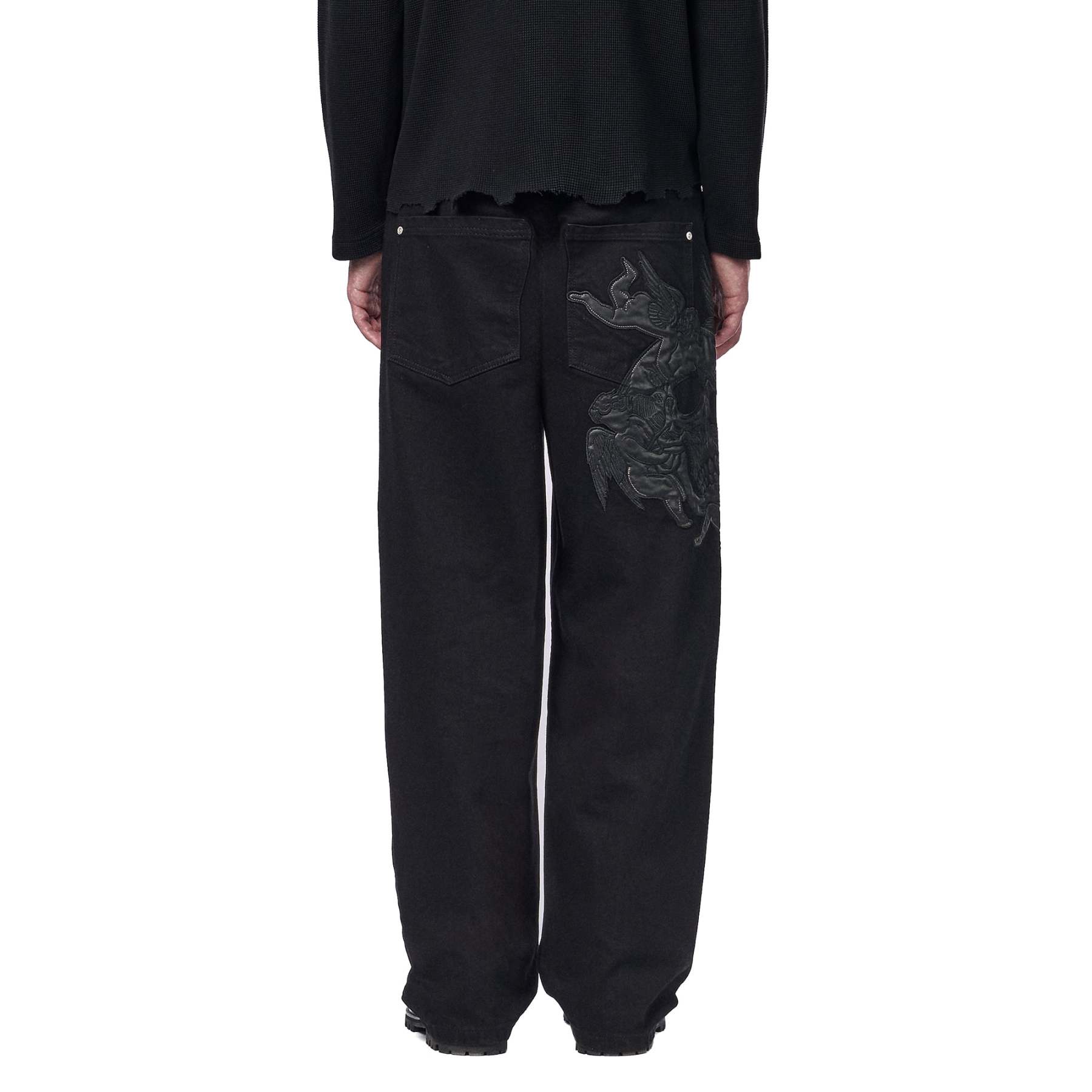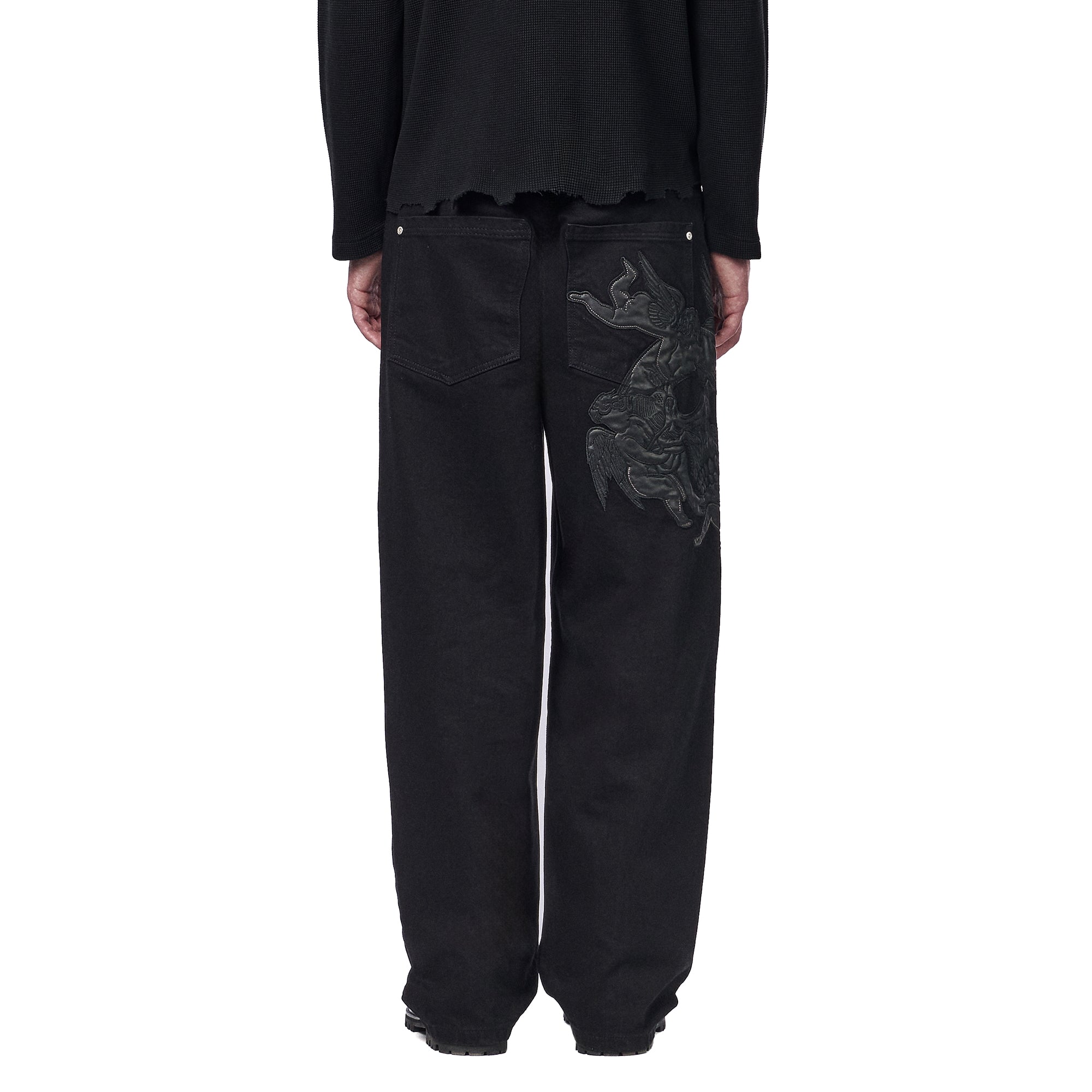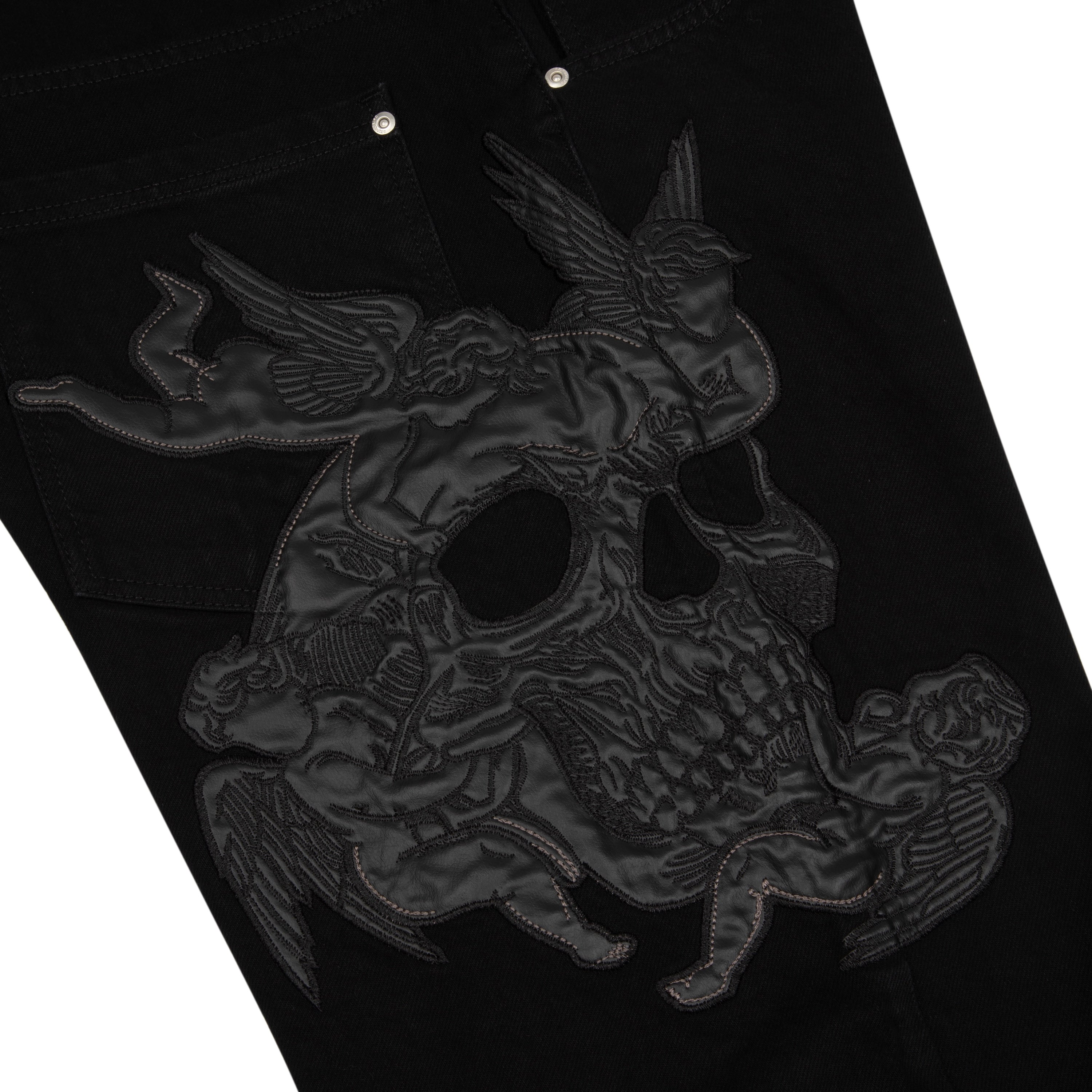 14,5oz denim / 100% cotton / leather embroidery appliqué on front and back / embossed printed leather patch / wash inside out / balloon fit / fits true to size