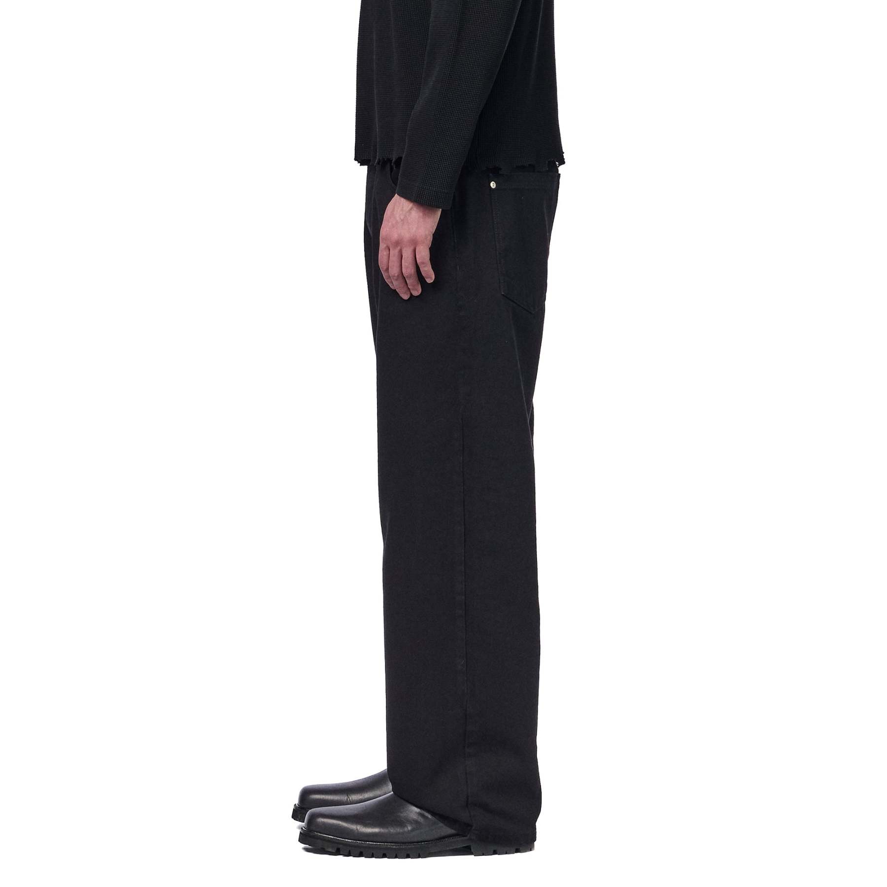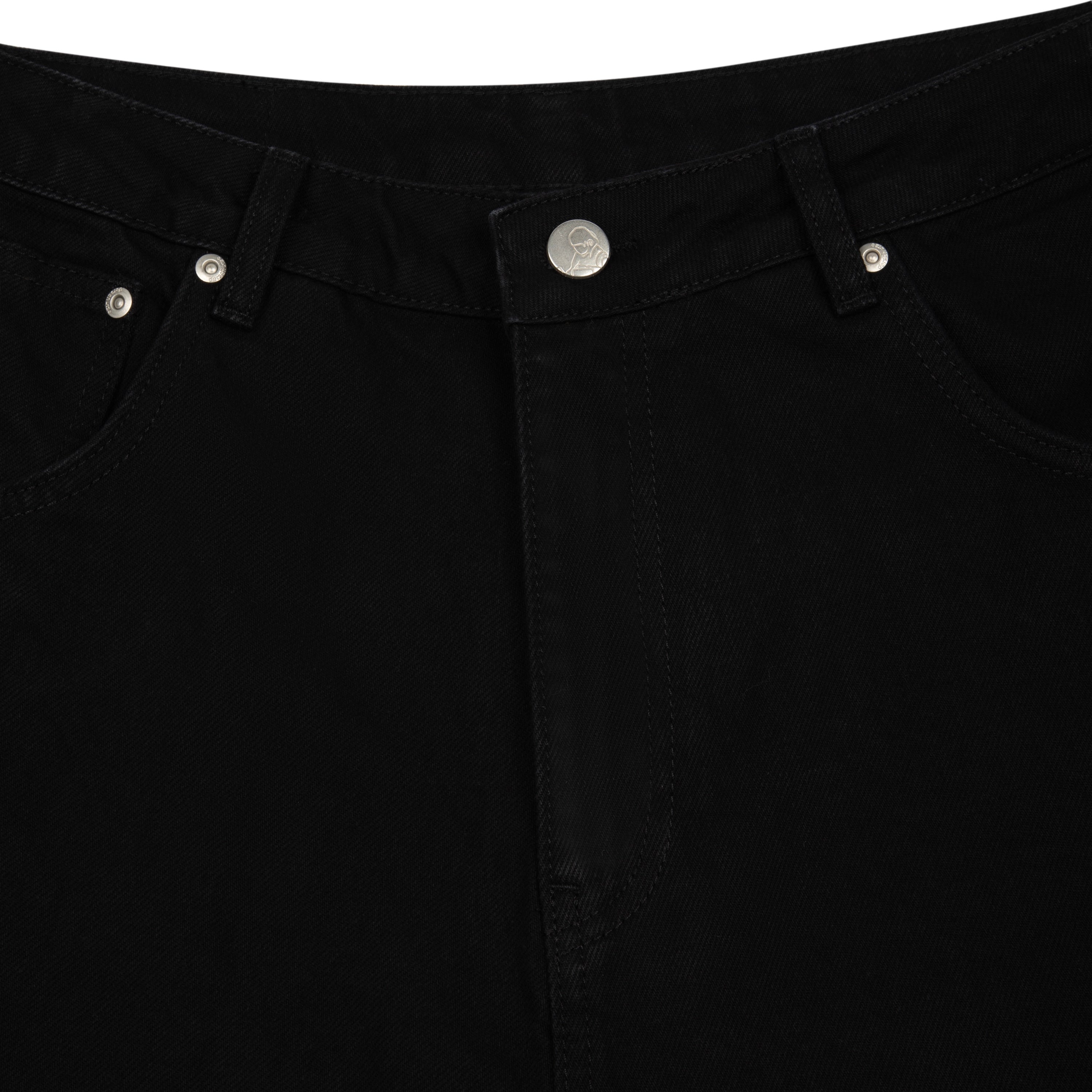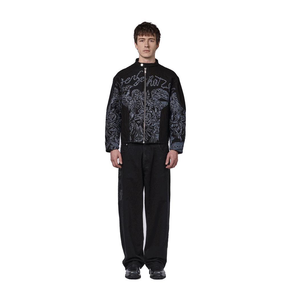 14,5oz denim / 100% cotton / leather embroidery appliqué on front and back / embossed printed leather patch / wash inside out / balloon fit / fits true to size