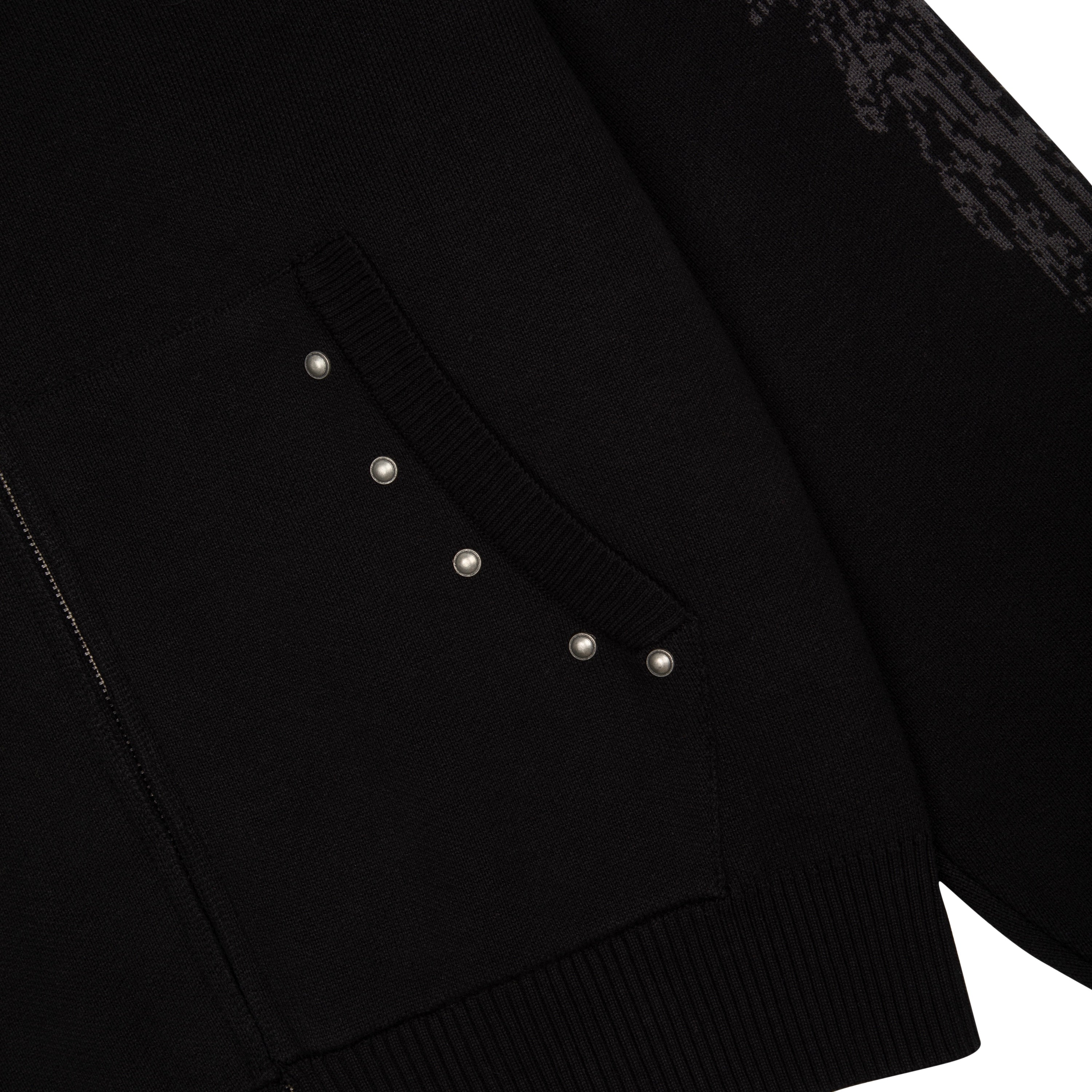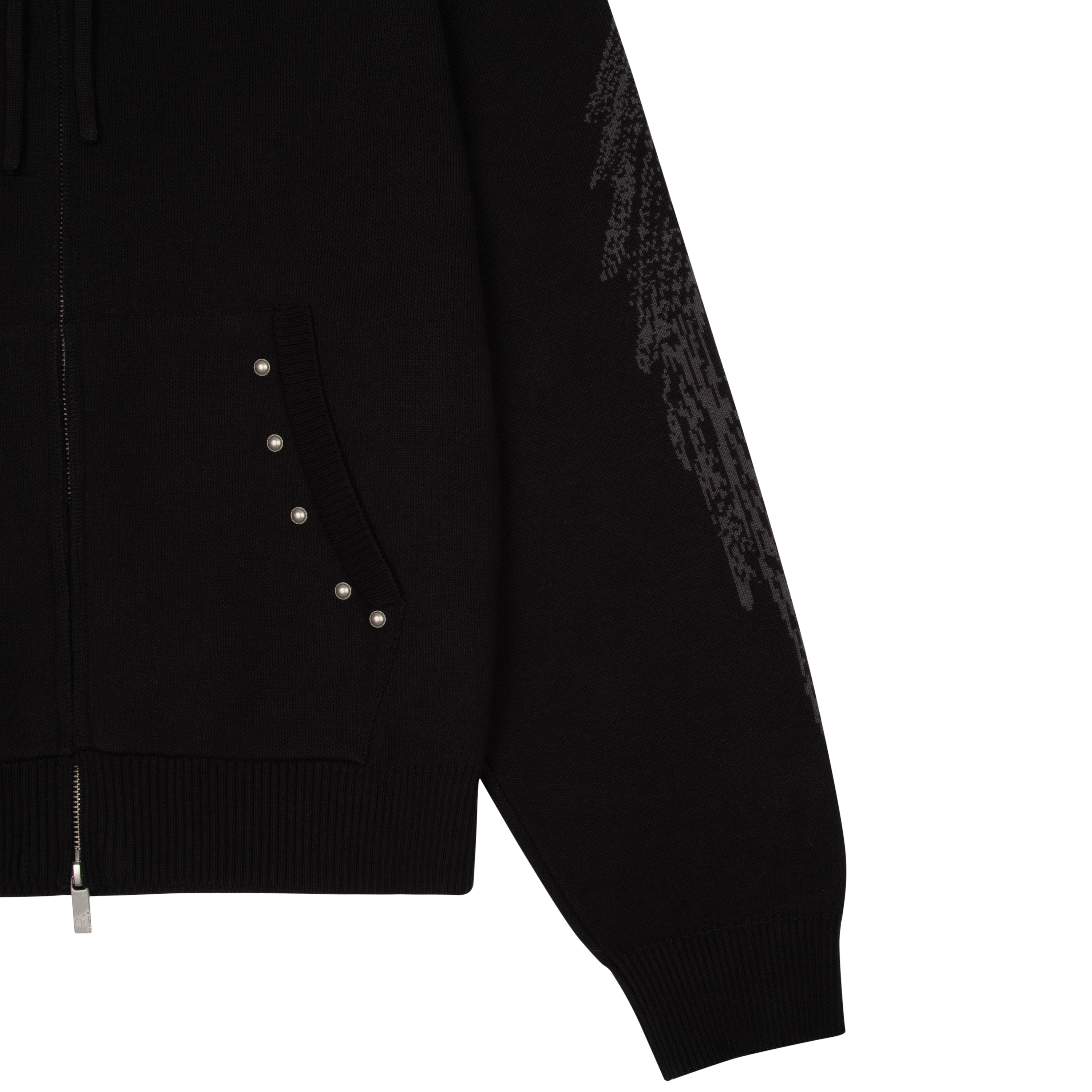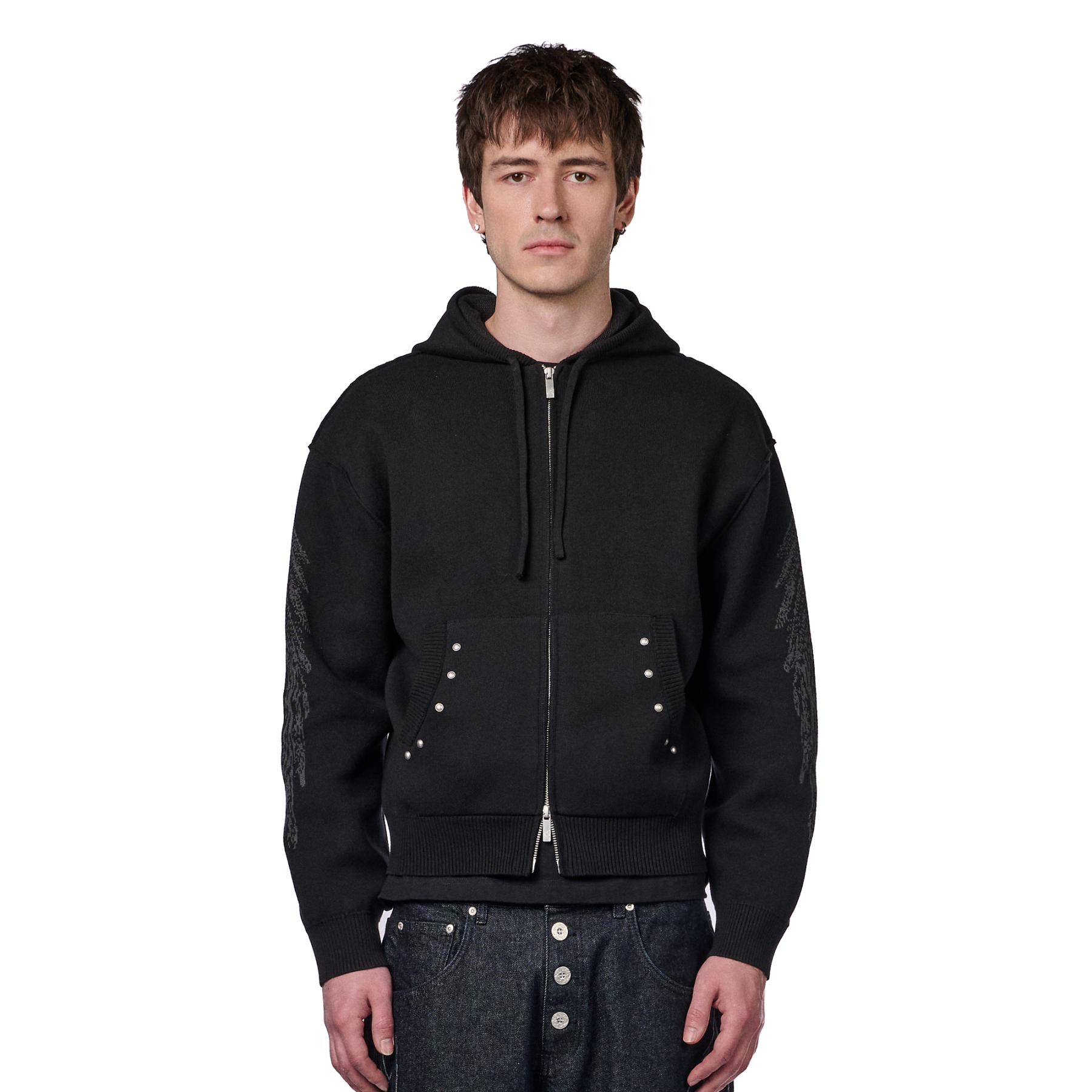 100% cotton / heavy weight knit / jacquard pattern on back and sleeves / with double-slided YKK zipper / stone application on pockets / fits true to size