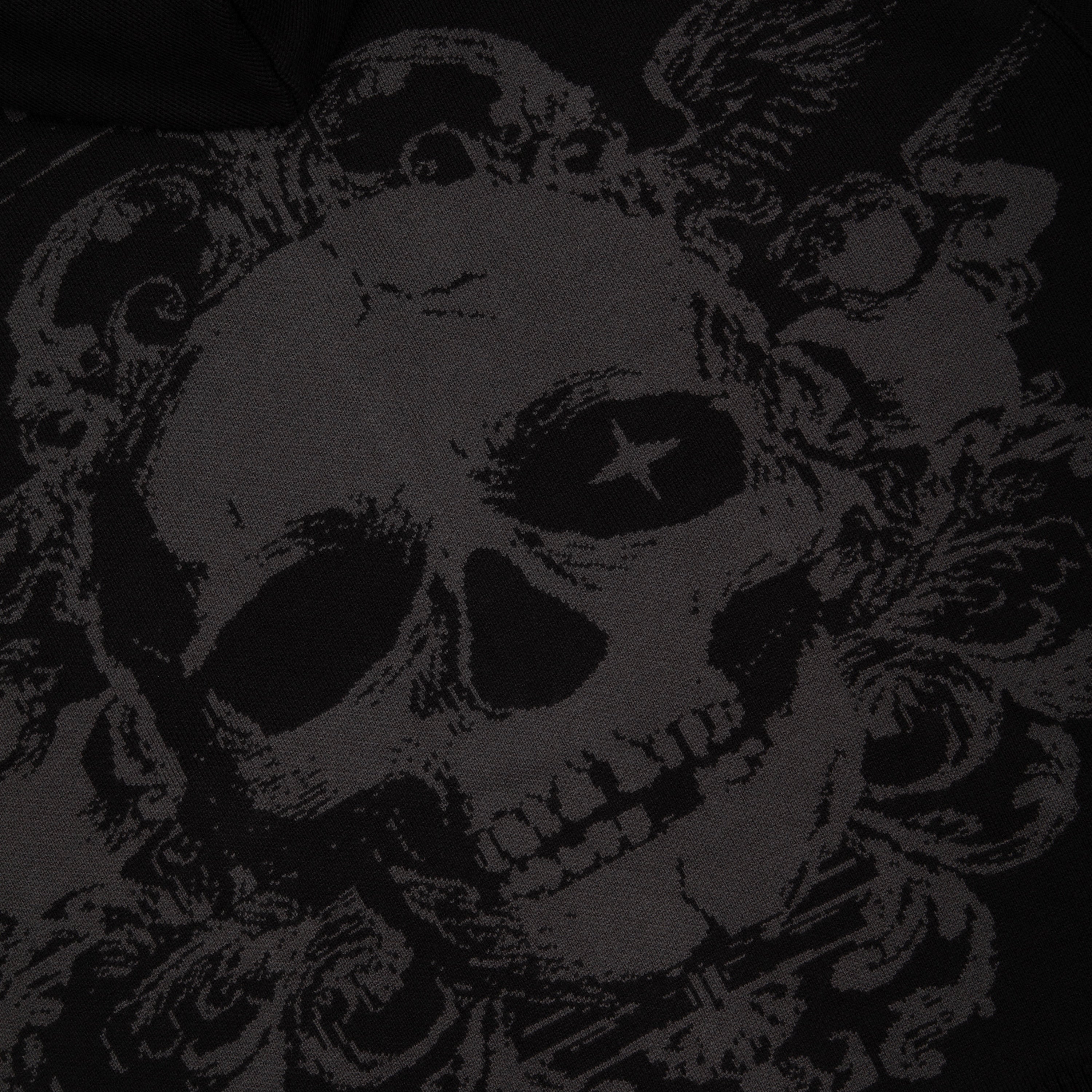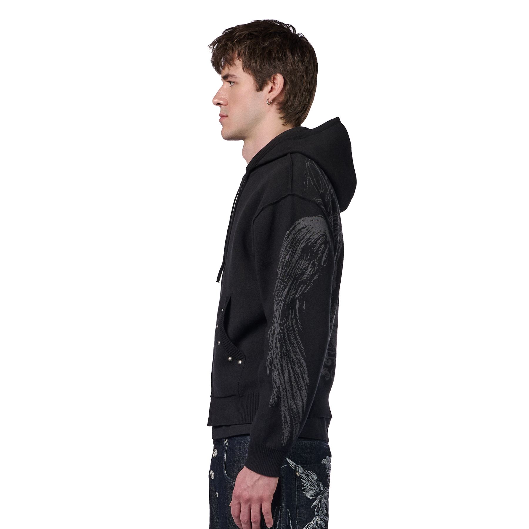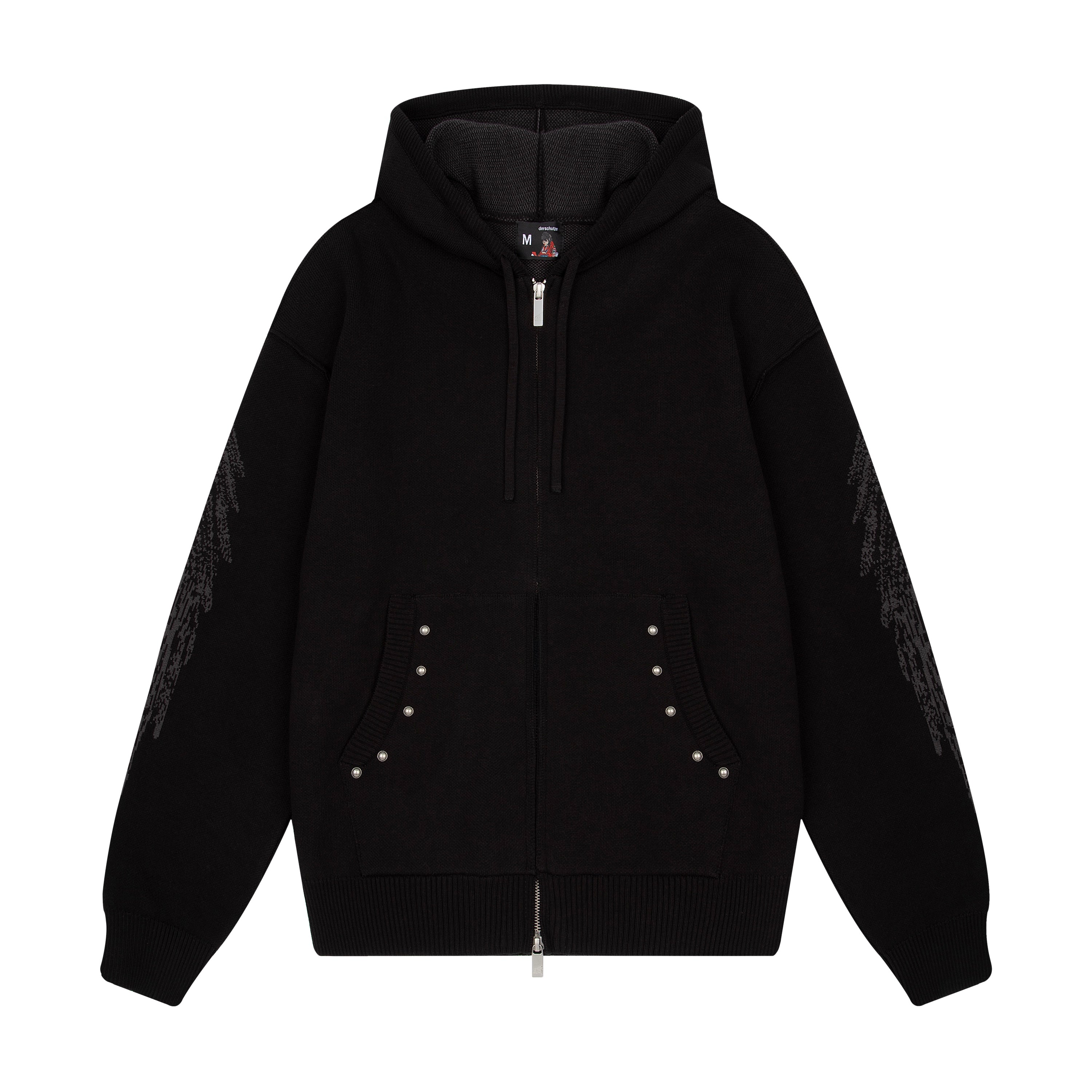 100% cotton / heavy weight knit / jacquard pattern on back and sleeves / with double-slided YKK zipper / stone application on pockets / fits true to size