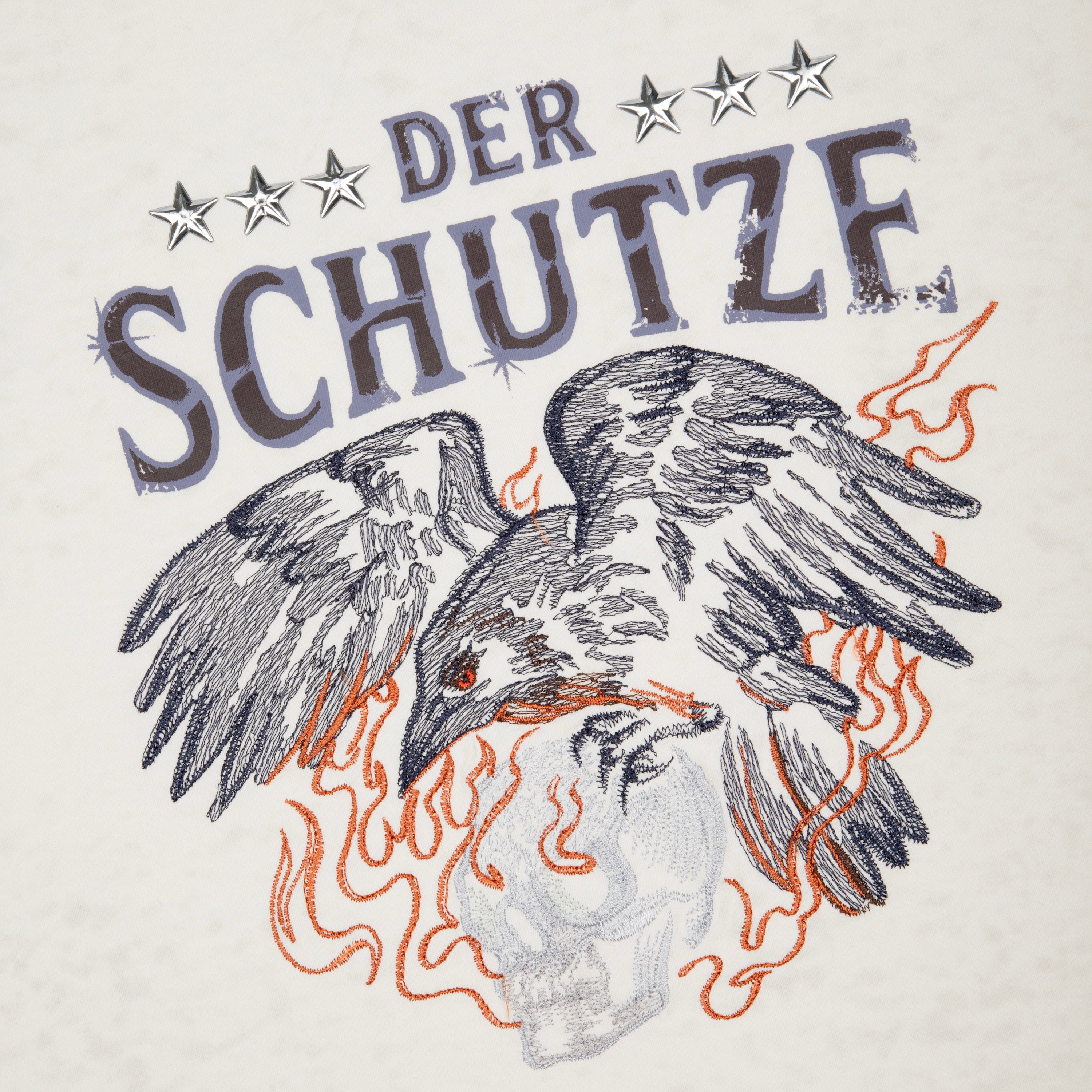 260gsm fabric / 100% preshrunk cotton / print and high-frequency embossing on front / embroidery on front and sleeves / effect washing / fits true to size