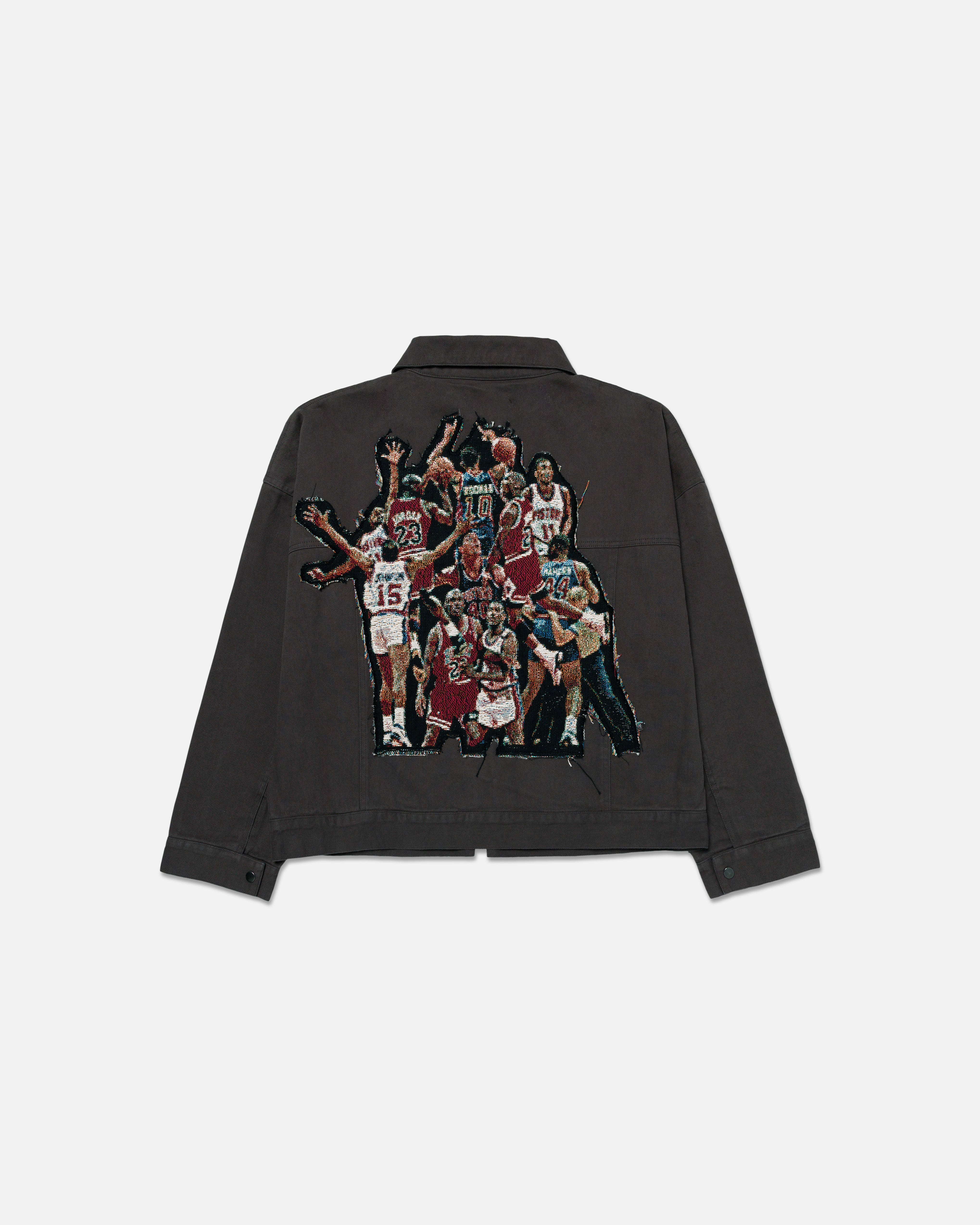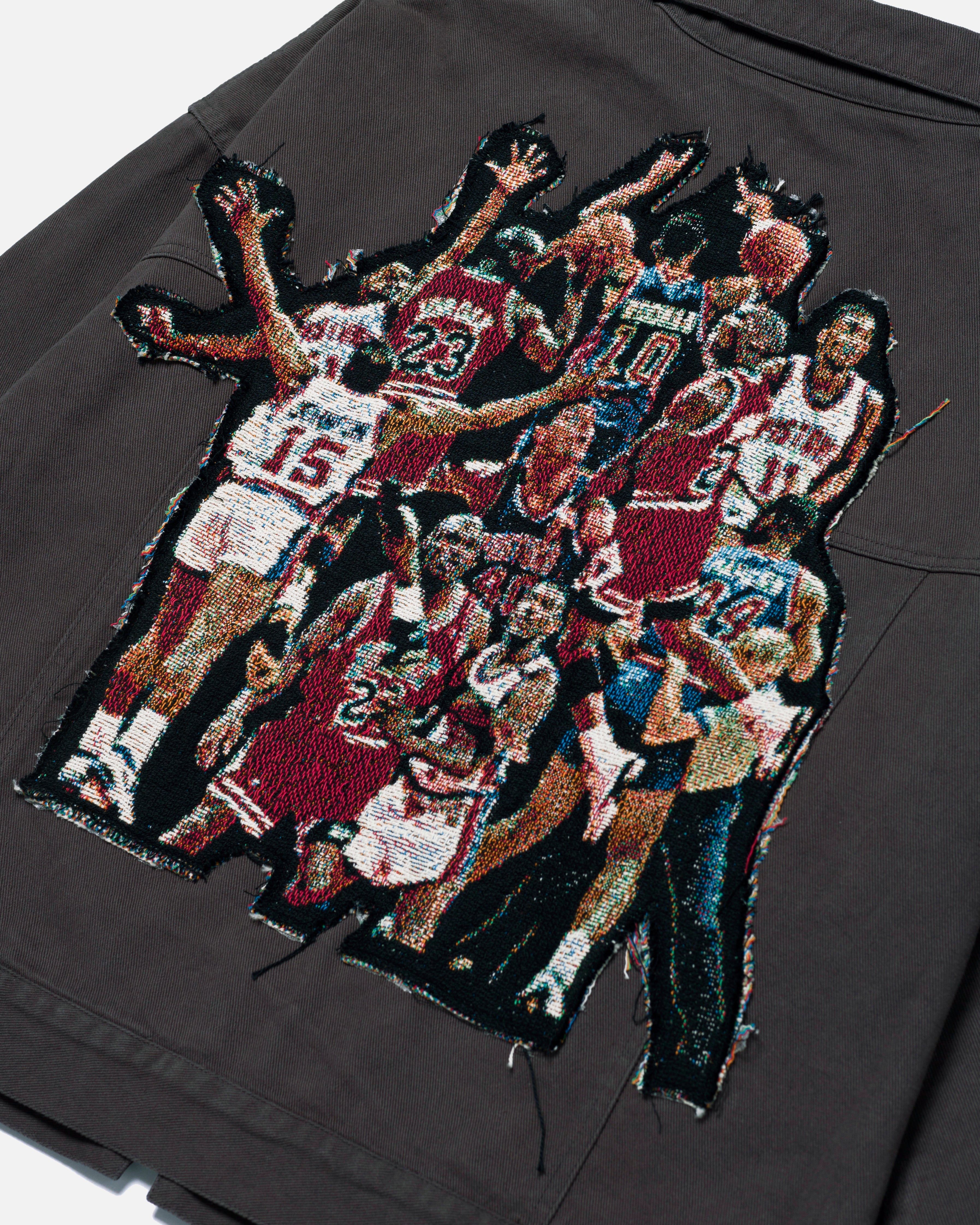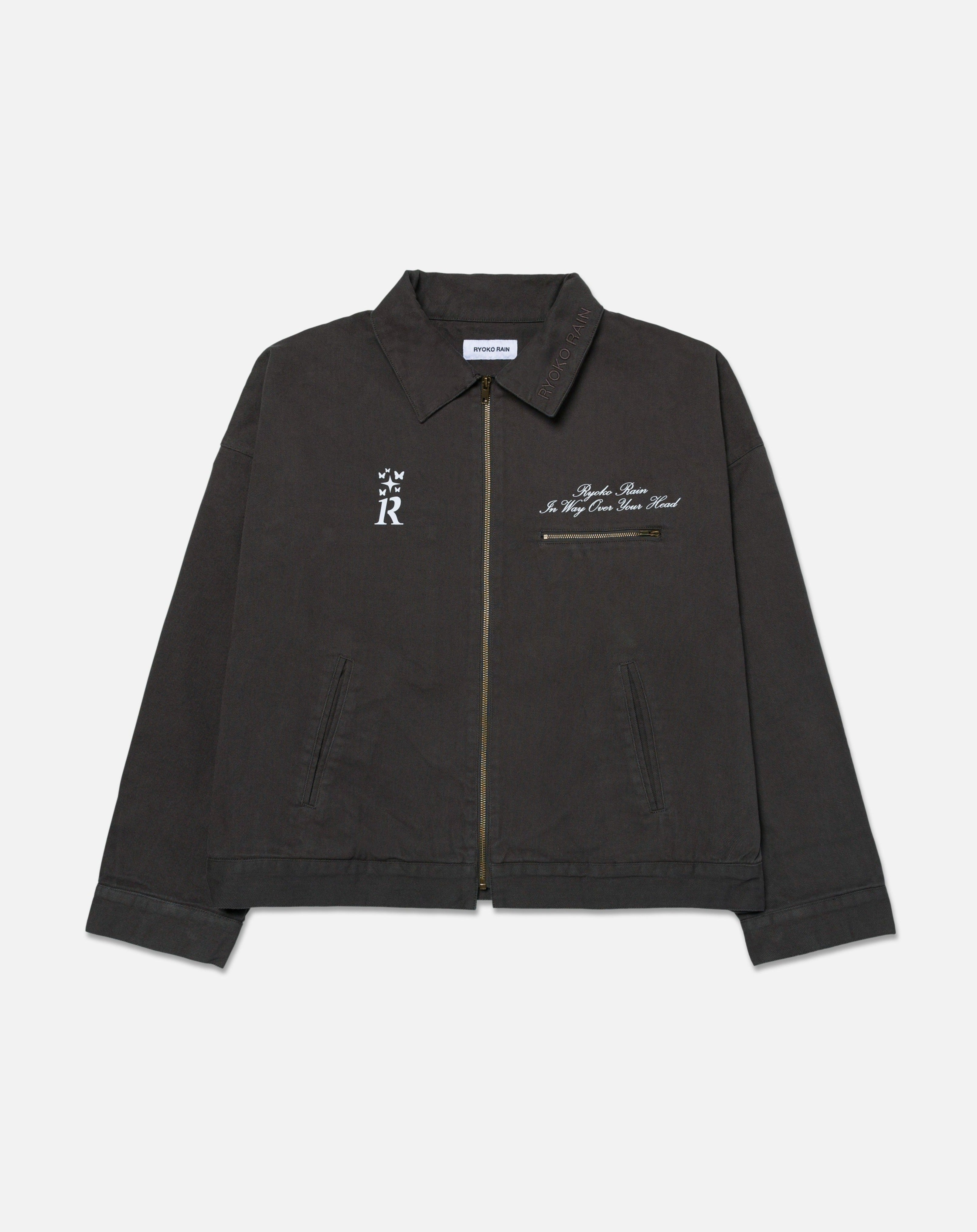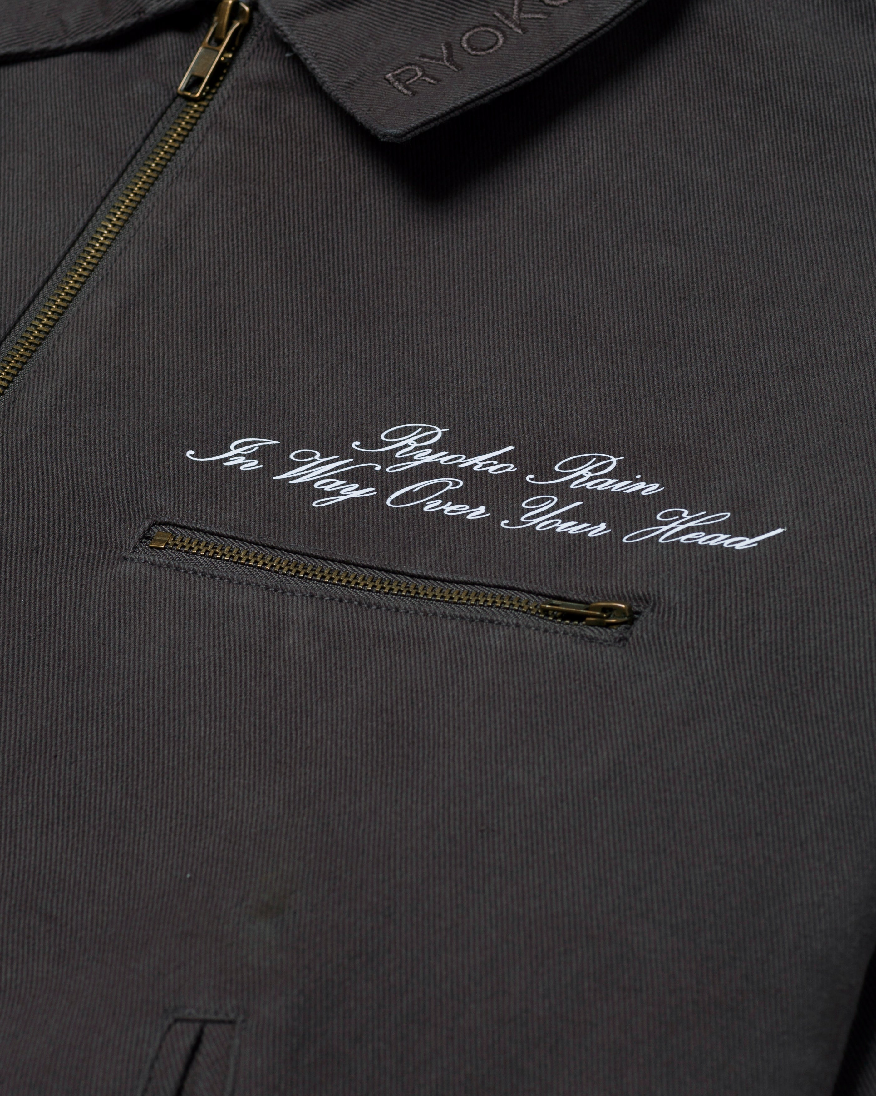 100% Cotton. Imported. Grey RR work jacket with custom Ryoko Rain x inwayoveryourhead dtg logos on both sides of the chest. Hand-cut and sewn vintage collage tapestry on the back. Ryoko Rain embroidered collar.
