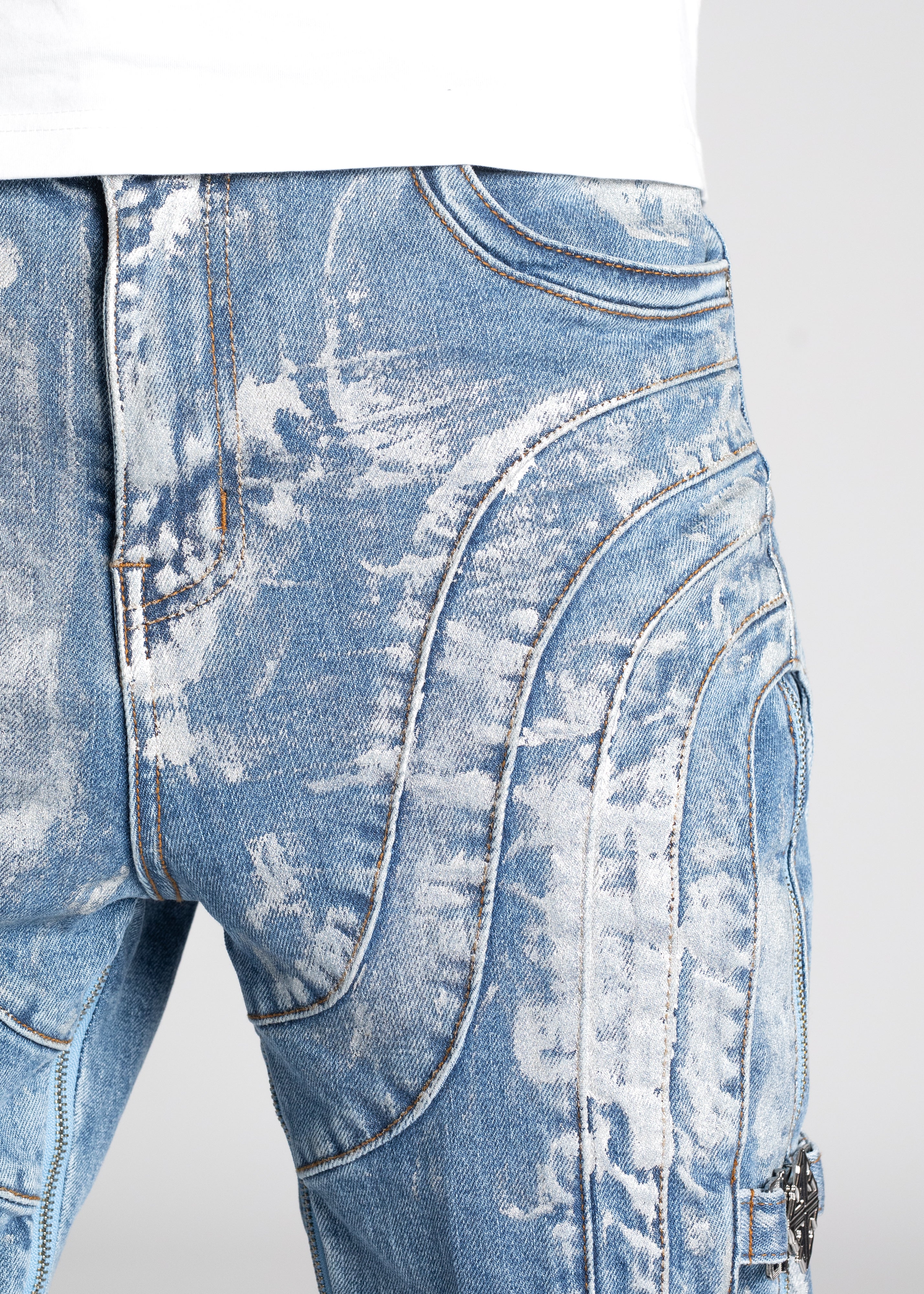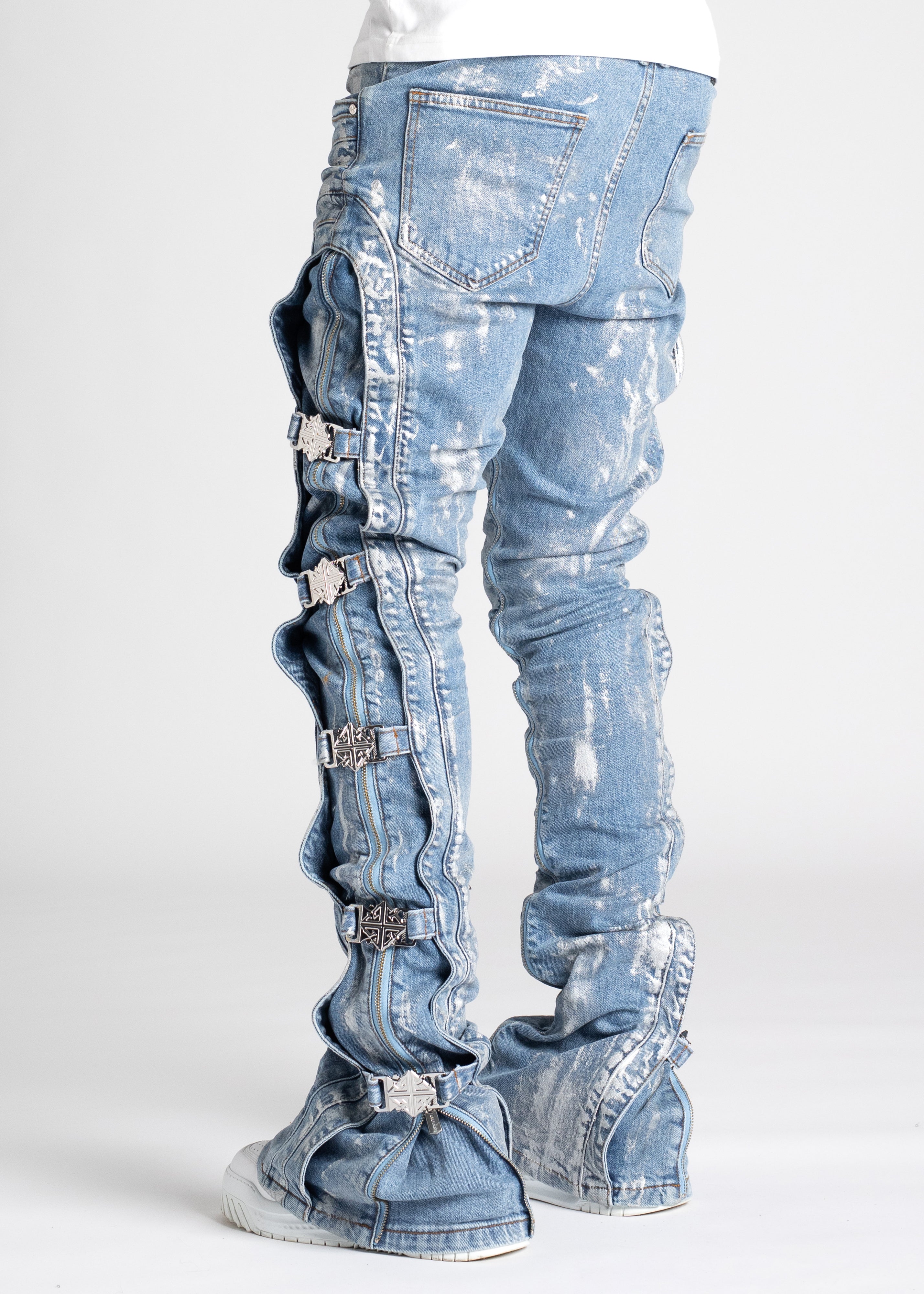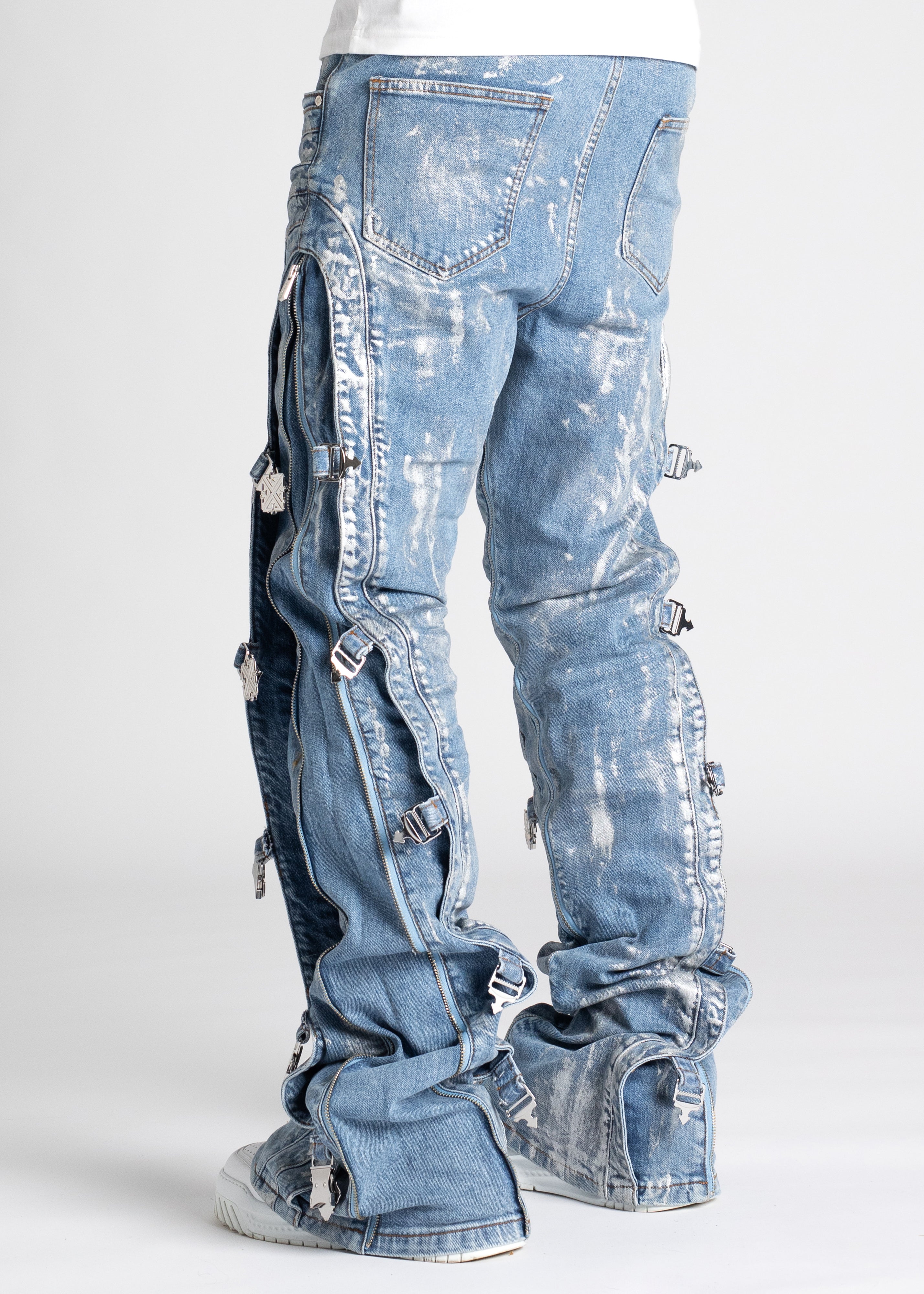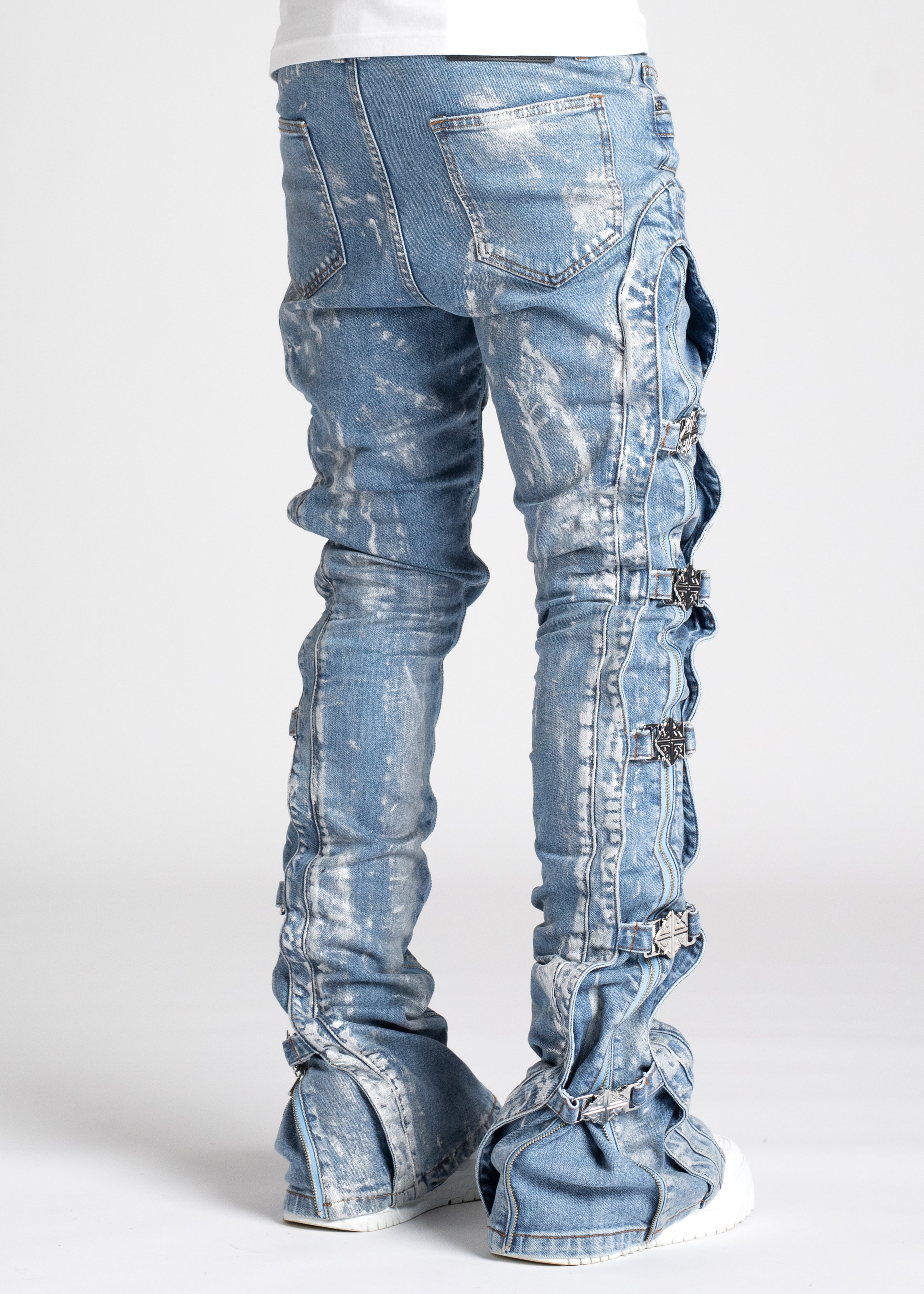 Our most sophisticated denim yet, the Obsidian Black Waxed Premium Denim is paneled. It features our signature silhouette, adorned with side buckles, full-functioning inner zippers, and a premium wax finish.