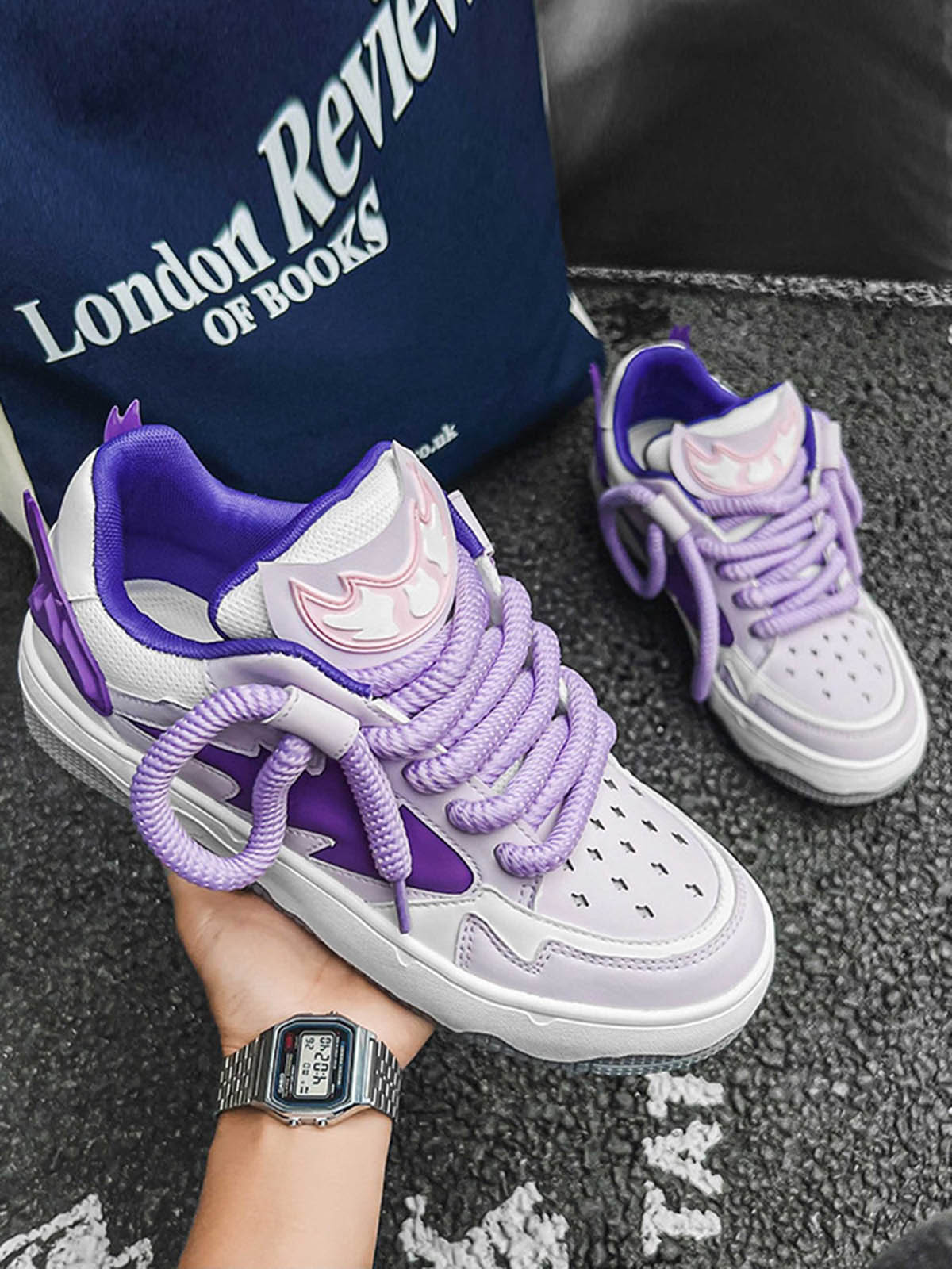 • Detail Features: Lace-Up Closure, Chunky Sole, Purple Accents, Reflective Details