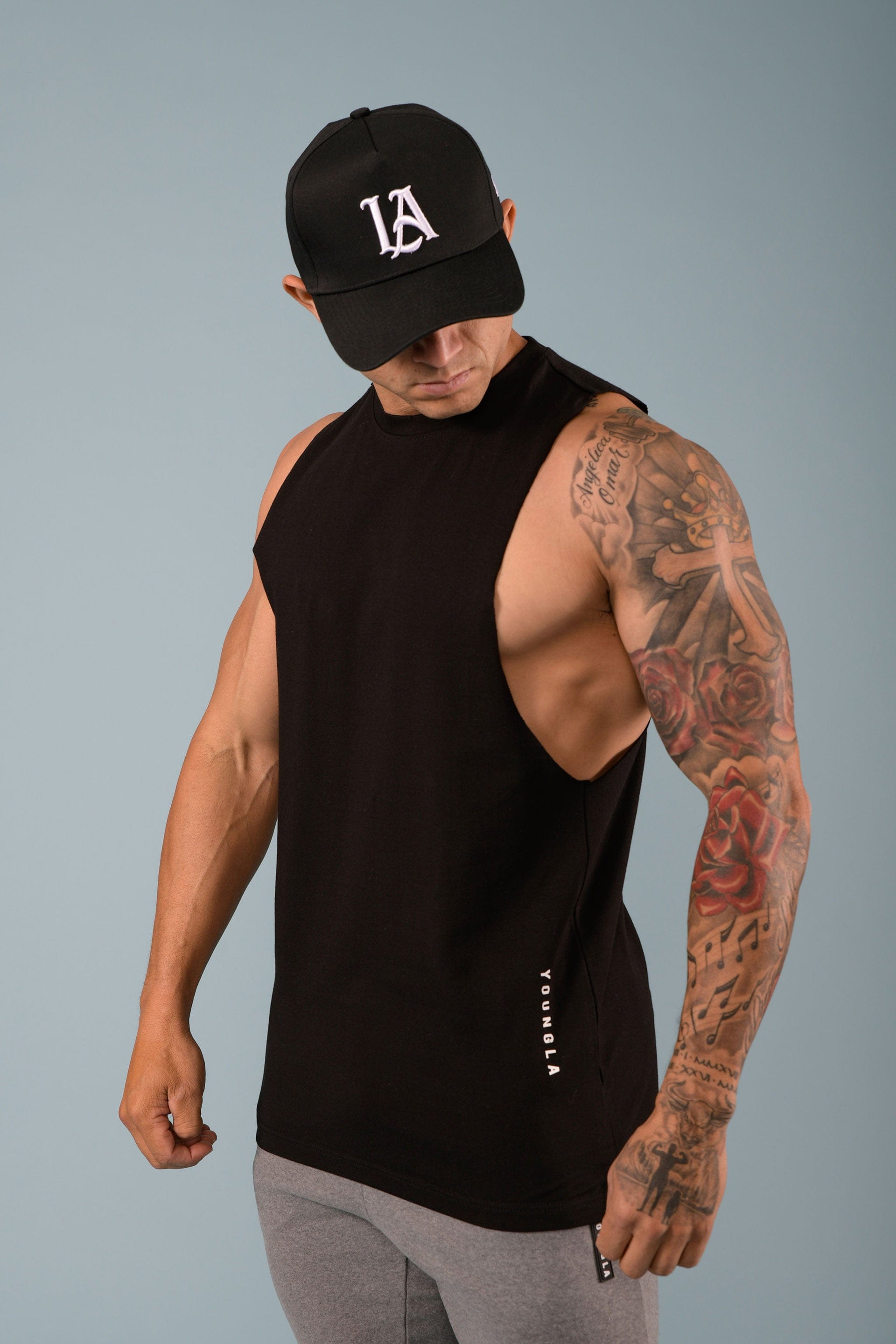 DESIGN: Introducing the delt tanks. Cut deeper on the shoulders to showcase the delts from all angles. They are made with soft cotton and stretchy lycra fabric, straight bottom hem cut, YoungLA high-density logo on the bottom, and YLA logo on the back.