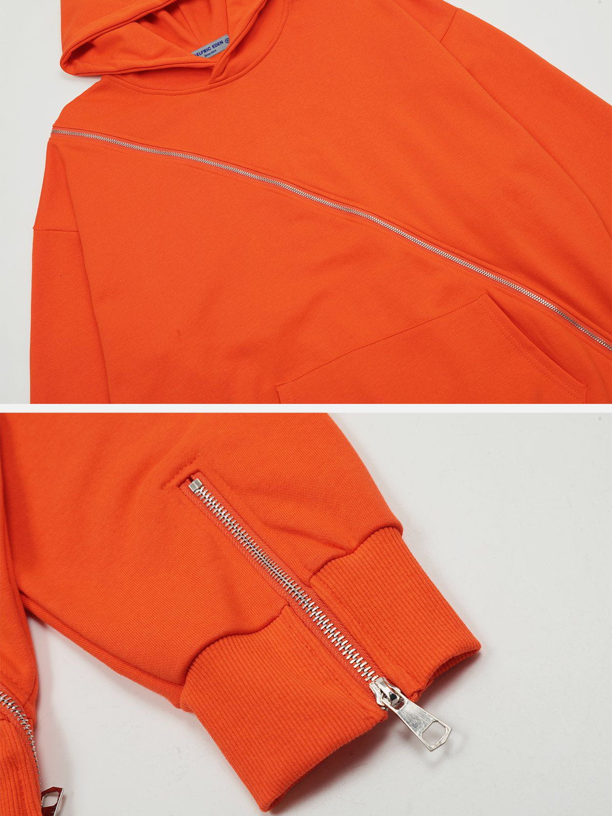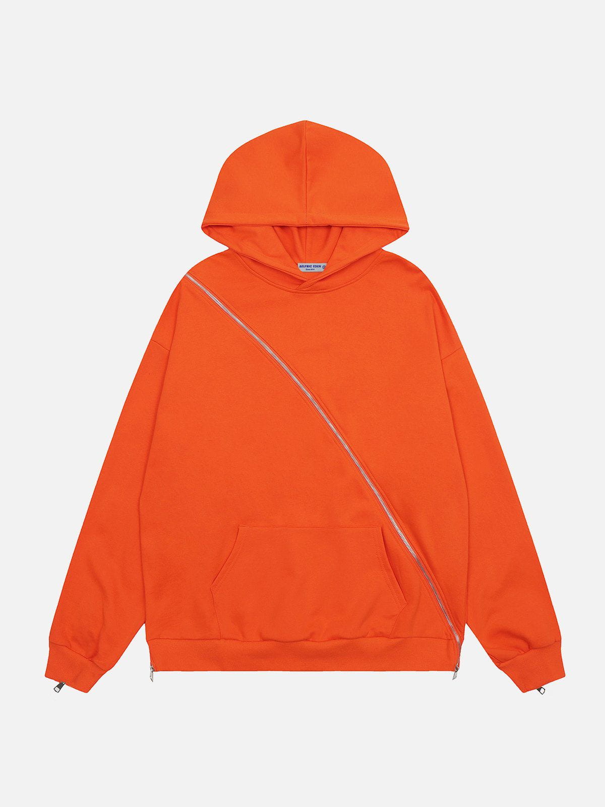 Our Fashionable Slant Zip Pure Color Hoodie features a creative design where the zipper extends from the front all the way to the back. The minimalist solid color design makes this hoodie a versatile match for various outfits.
