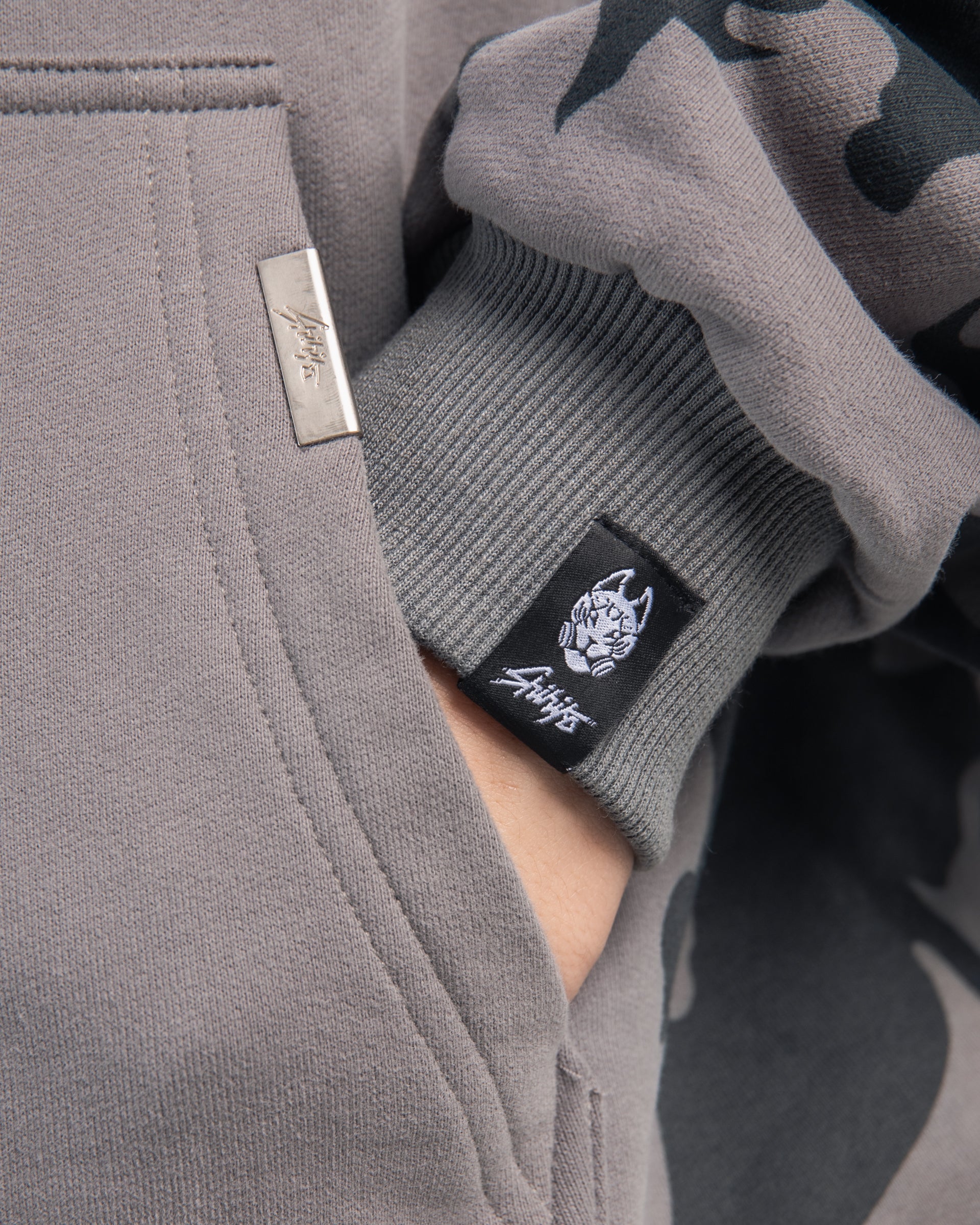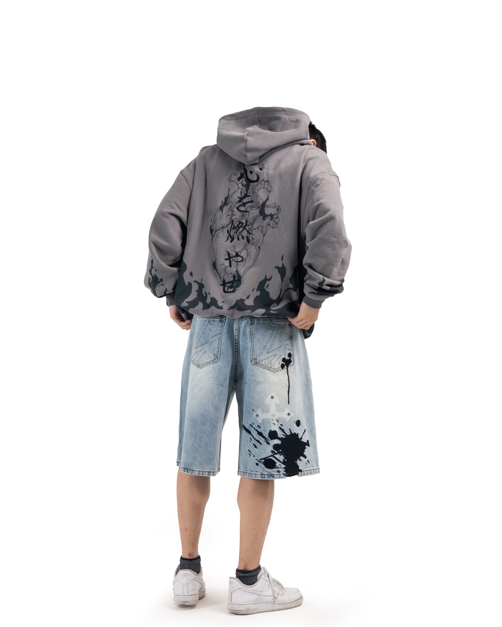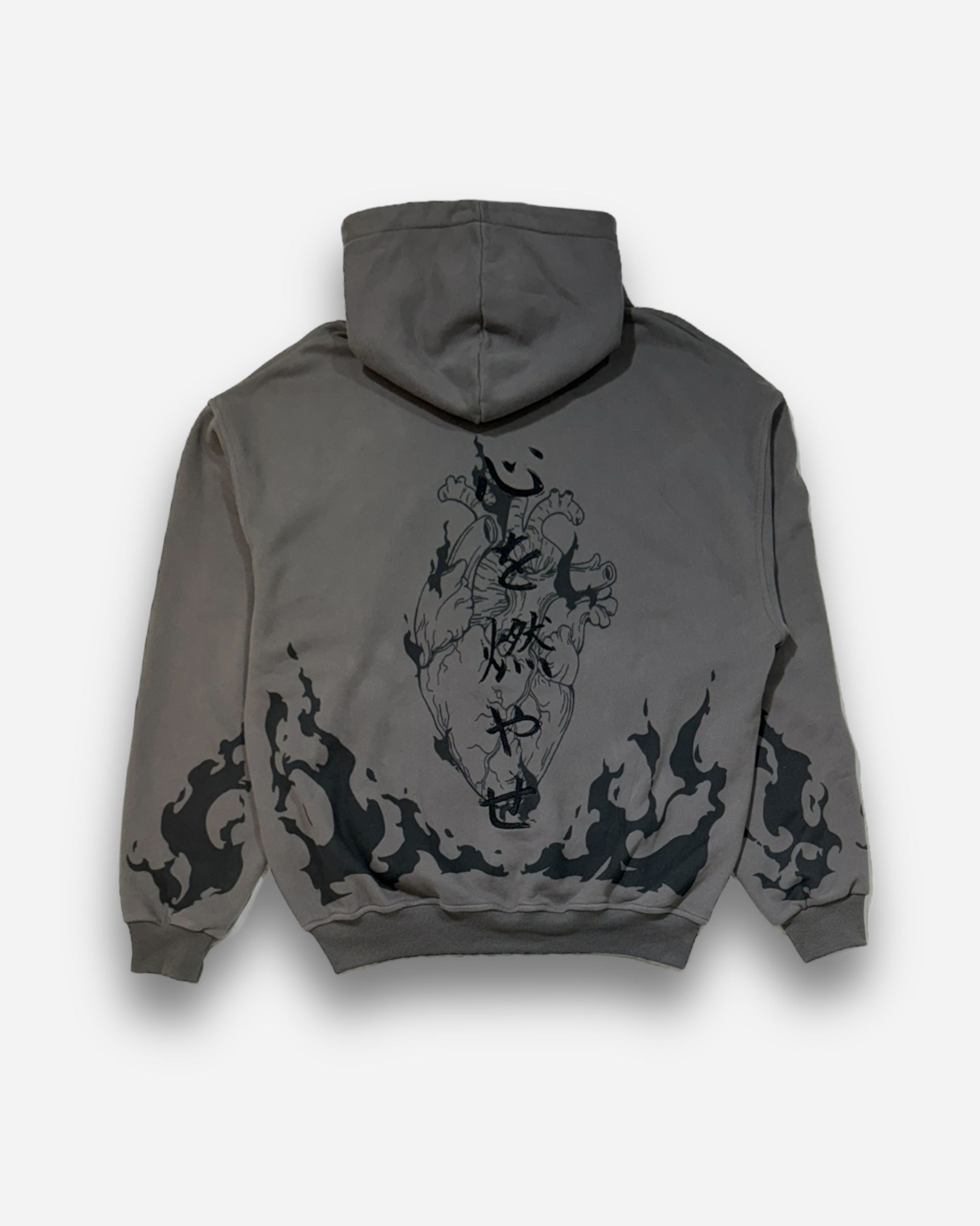 The Flame Pillar Hoodie in vintage grey is crafted from luxury heavyweight cotton, with an oversized fit and drop shoulders. It features a large print design on the back, front and sleeves, as well as an embroidery on the front and back. The hoodie has ribbed hems and cuffs.