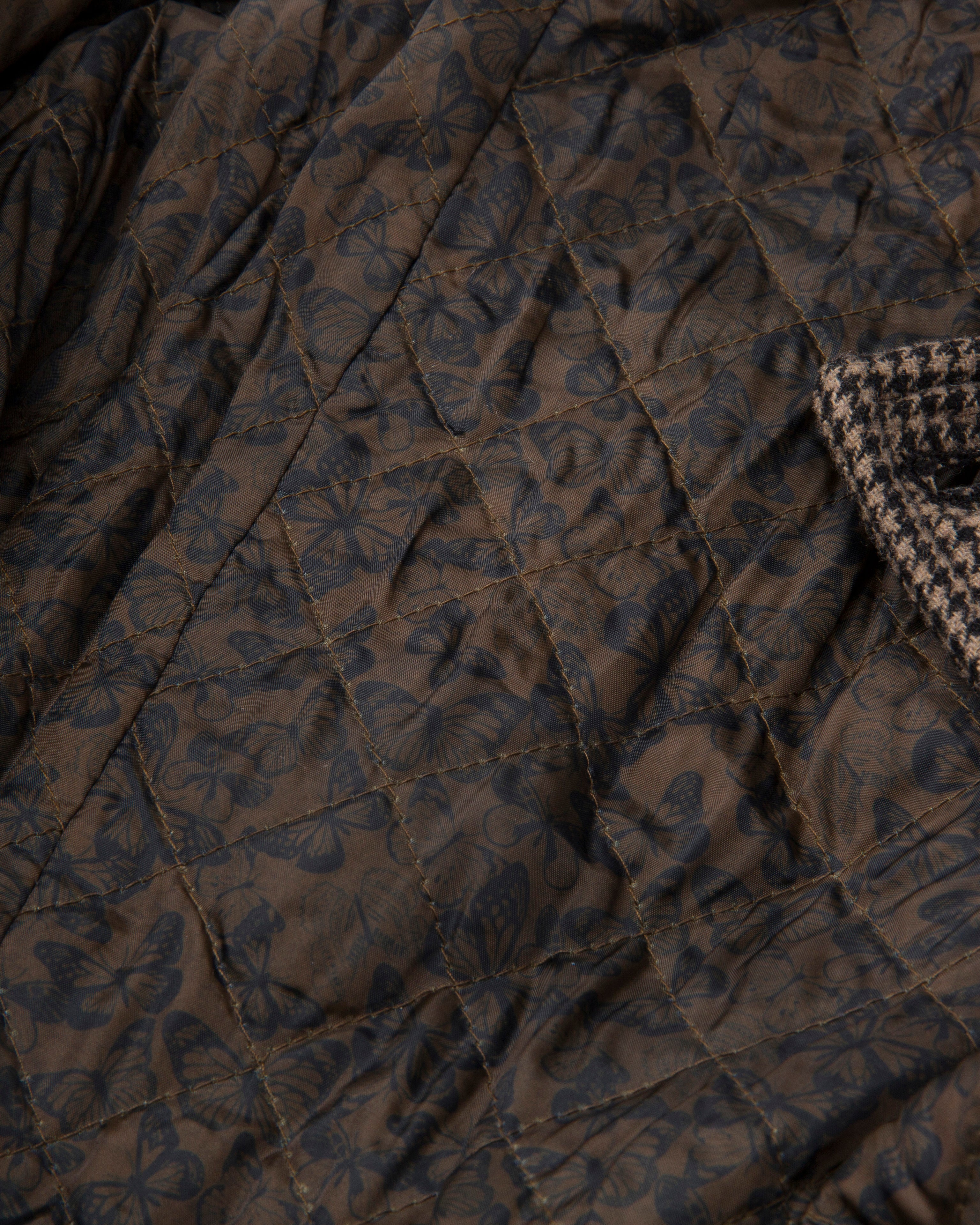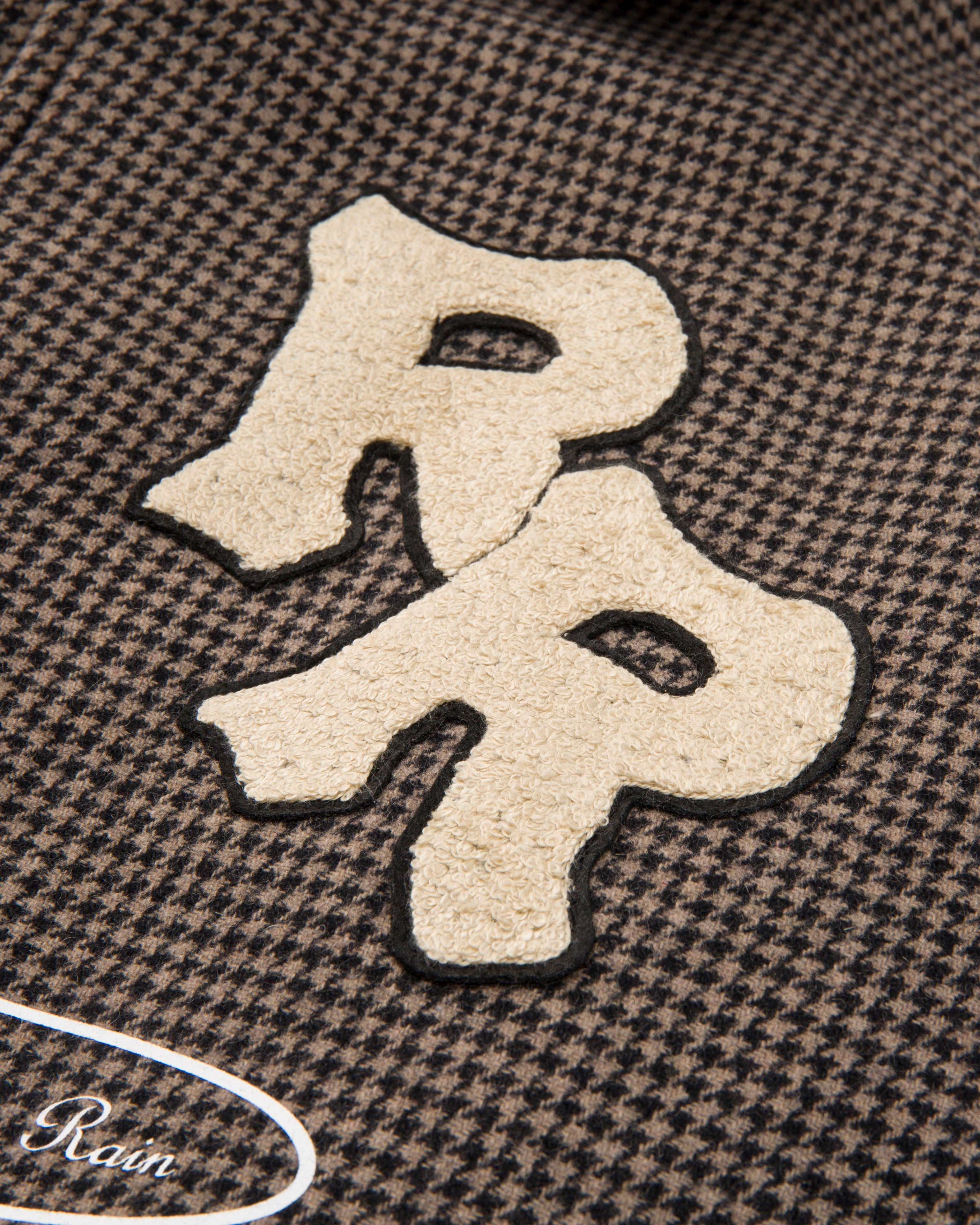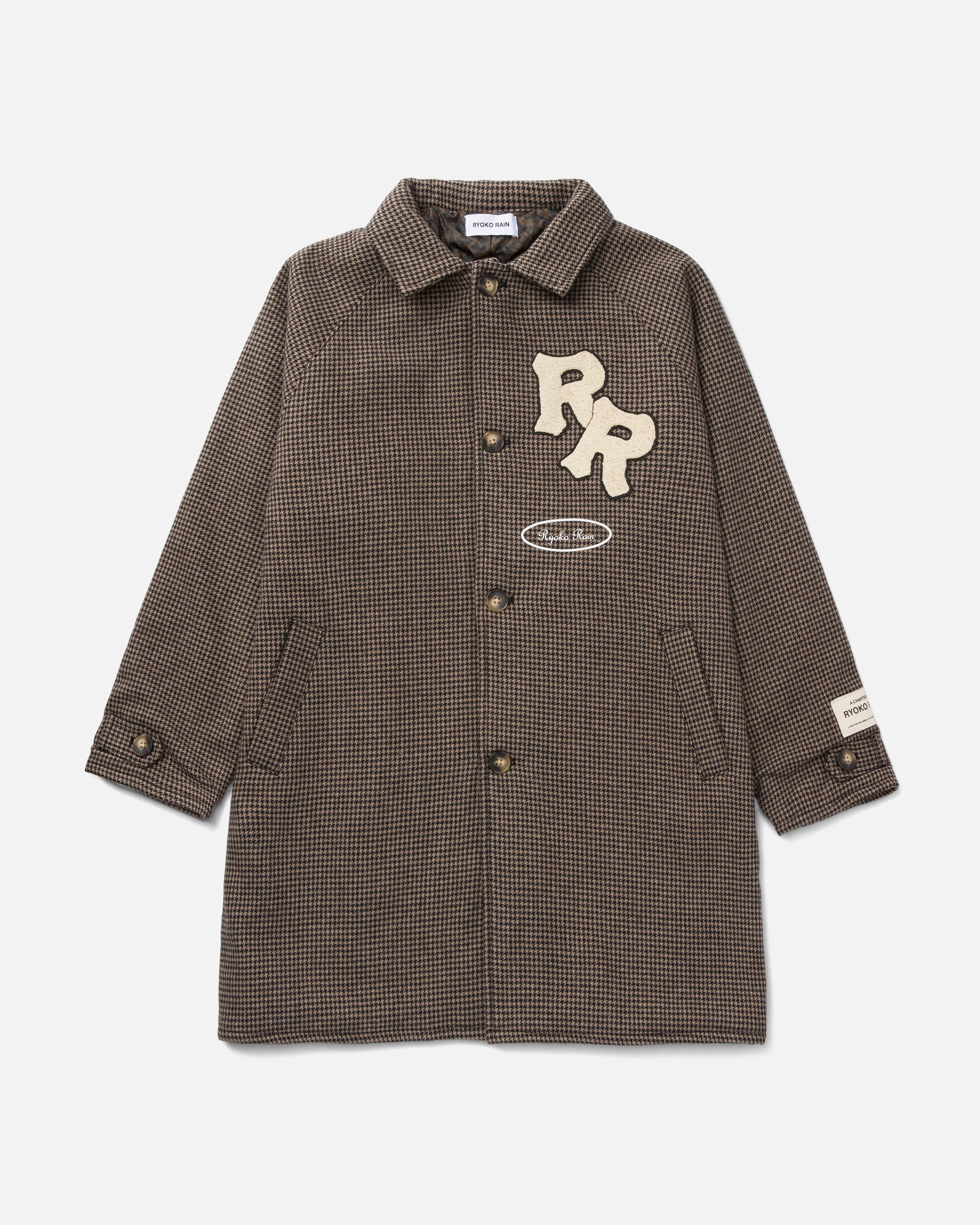 Brown ryoko rain houndstooth trench coat with stacked "RR" patch and Ryoko Rain screen print on the left chest. Featuring umber brown butterfly inner lining, new Ryoko Rain woven patch on left sleeve, marble buttons, and an embroidered collar.