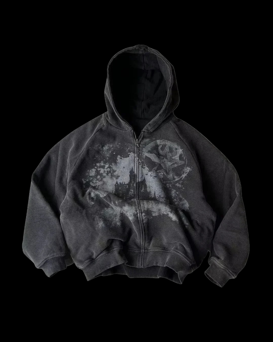 Charcoal zip-up hoodie featuring a washed, distressed base and a shadowy gothic castle graphic across the chest. Faded moon detailing and scattered bleach-style textures give it a haunted, atmospheric look straight out of dark fantasy art. Cotton blend, true to size, and ready to ship.