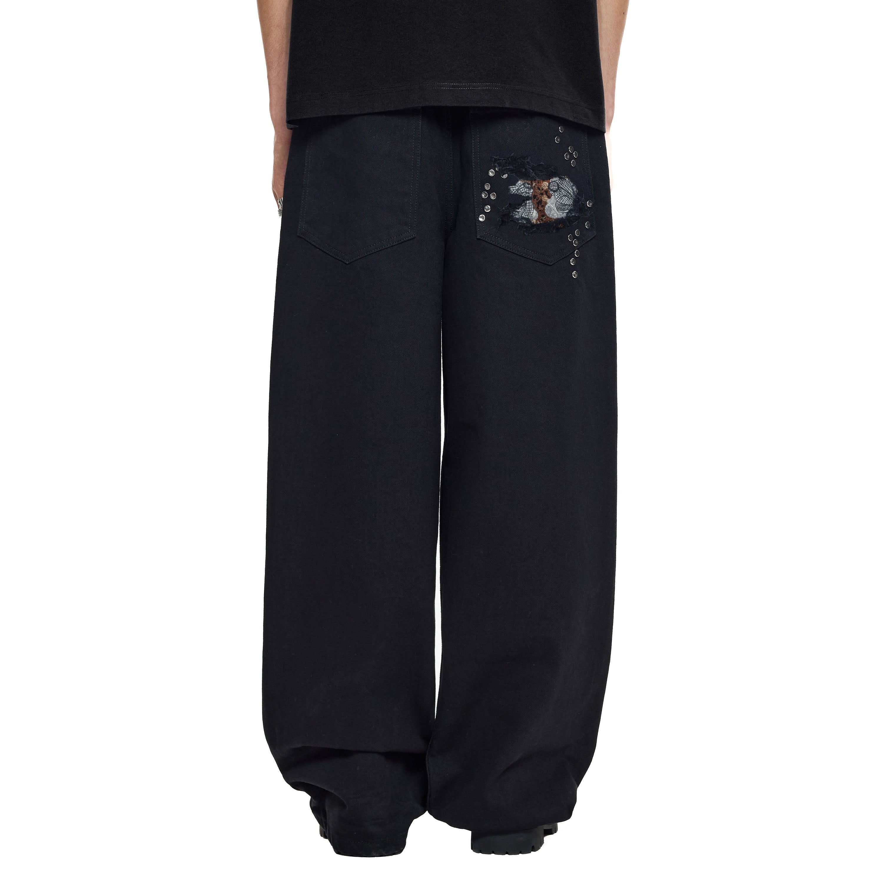 14,5oz denim / 100% cotton / distressed and patched at knees and back pocket / embroidery on back pocket patch / button studs at knees and back pocket / debossed printed leather patch / custom button / wash inside out / fits true to size / all profits will be donated