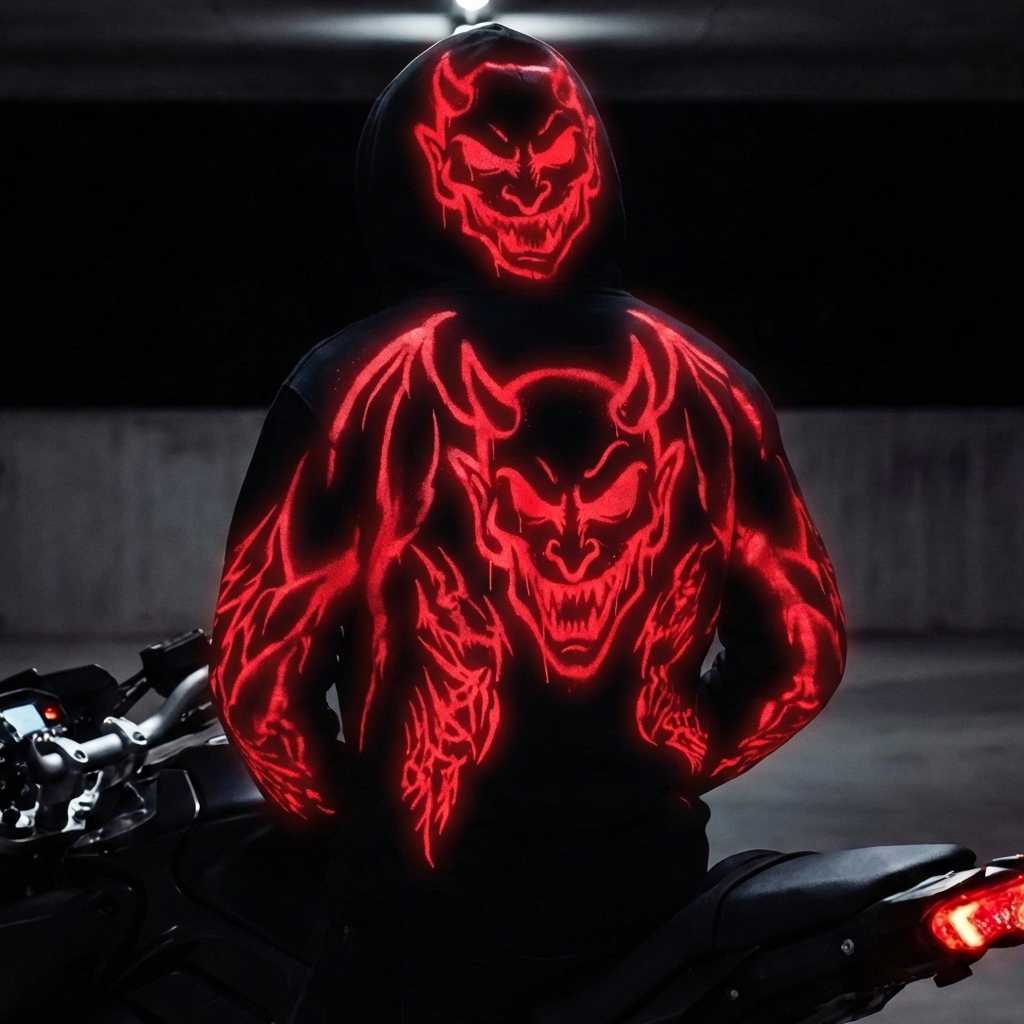 LED Light-Up Devil Hoodie Glow-in-the-Dark Reflective Cotton Blend Sweatshirt for Men