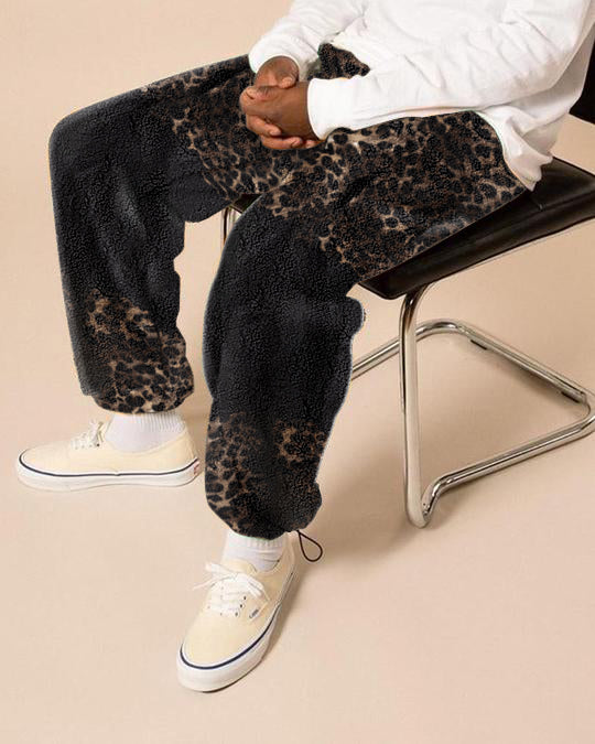 Fashion trend leopard print contrast color fleece men's casual pants