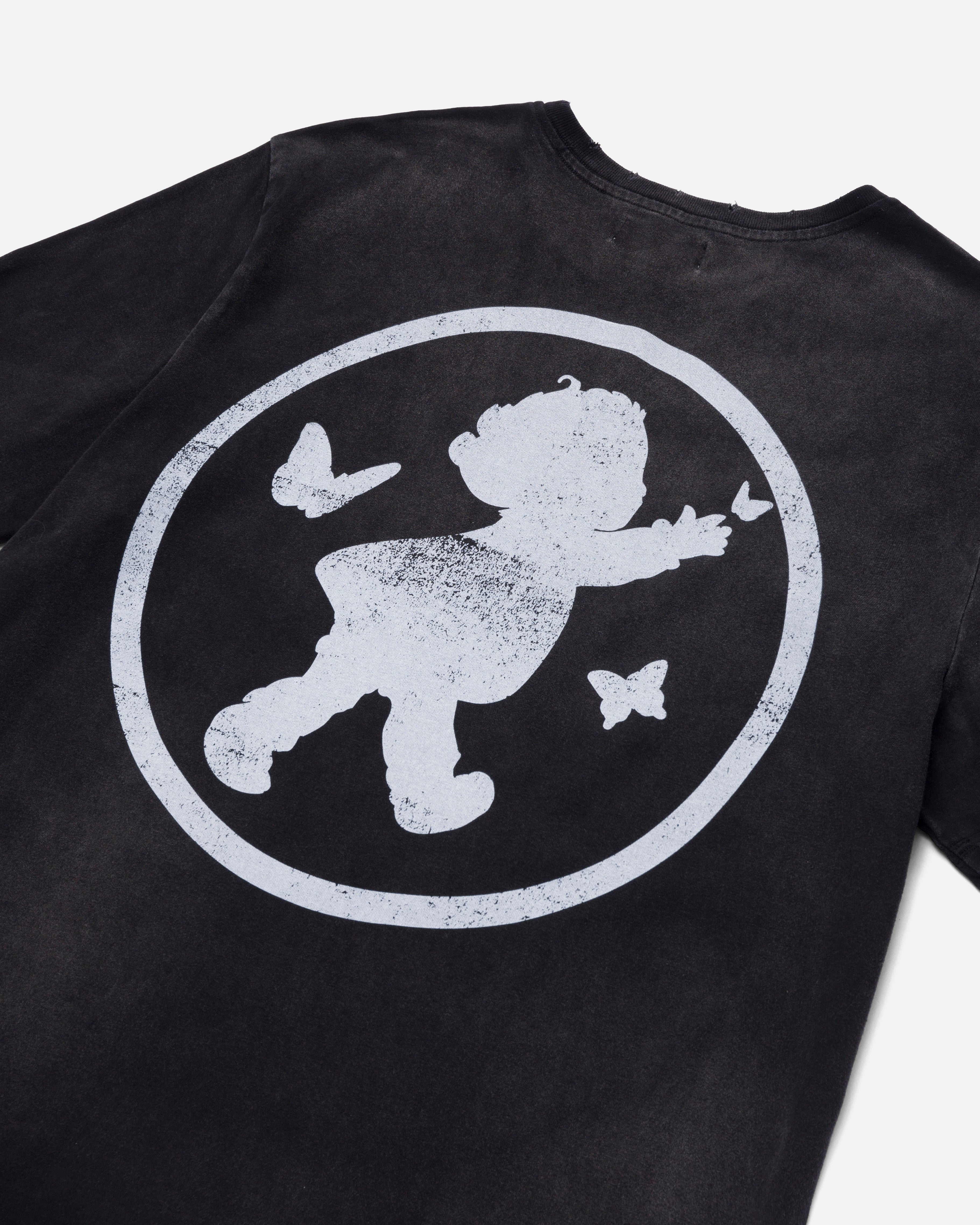 Custom knit and mineral washed for a vintage look. Ryoko Rain left chest screen print and girl catching butterflies large back print with distressed neck.