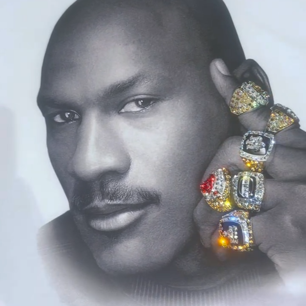 The hyper-detailed design contrasts a grayscale portrait with the vibrant shimmer of six championship rings, symbolizing not just victory, but domination.