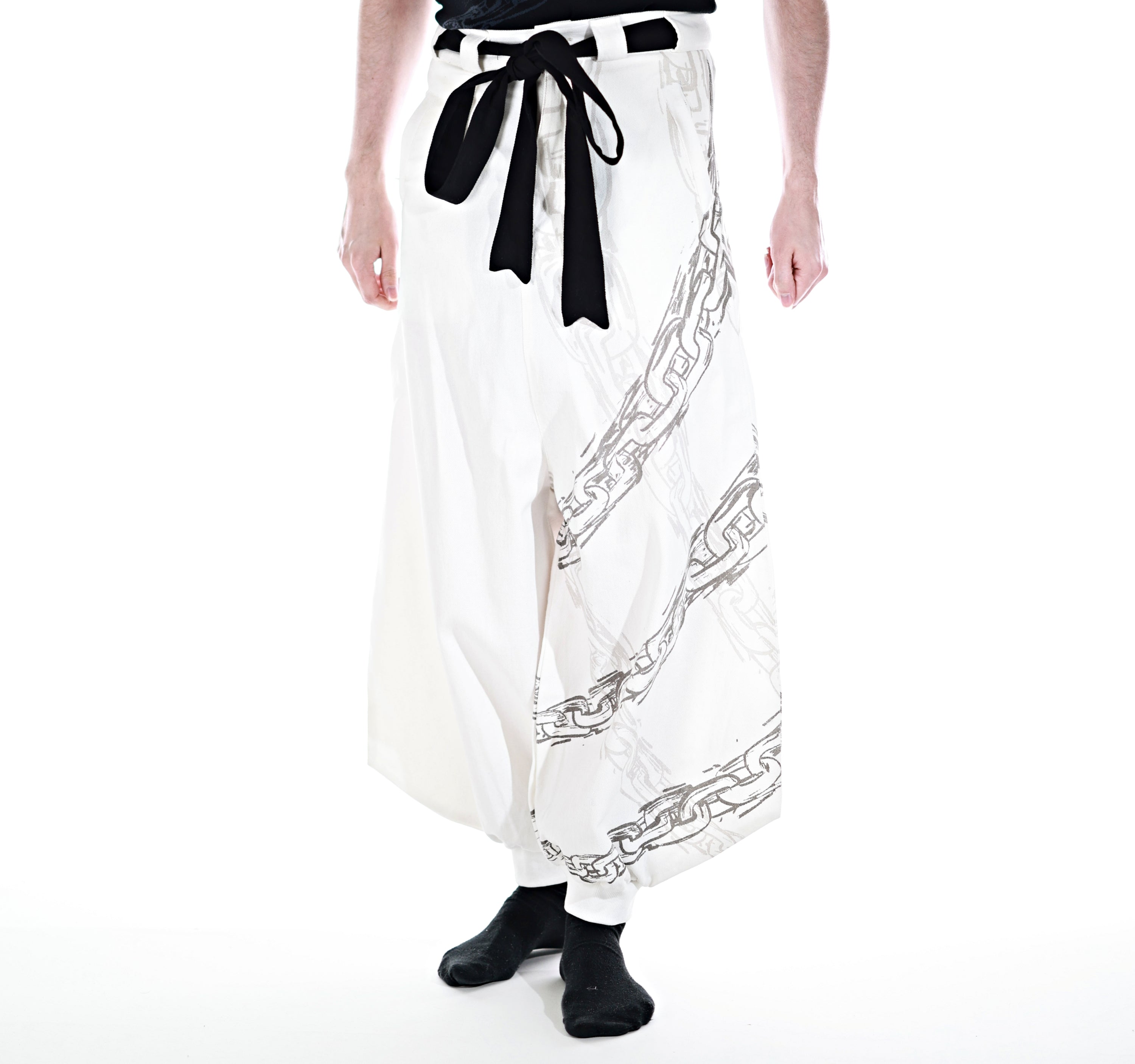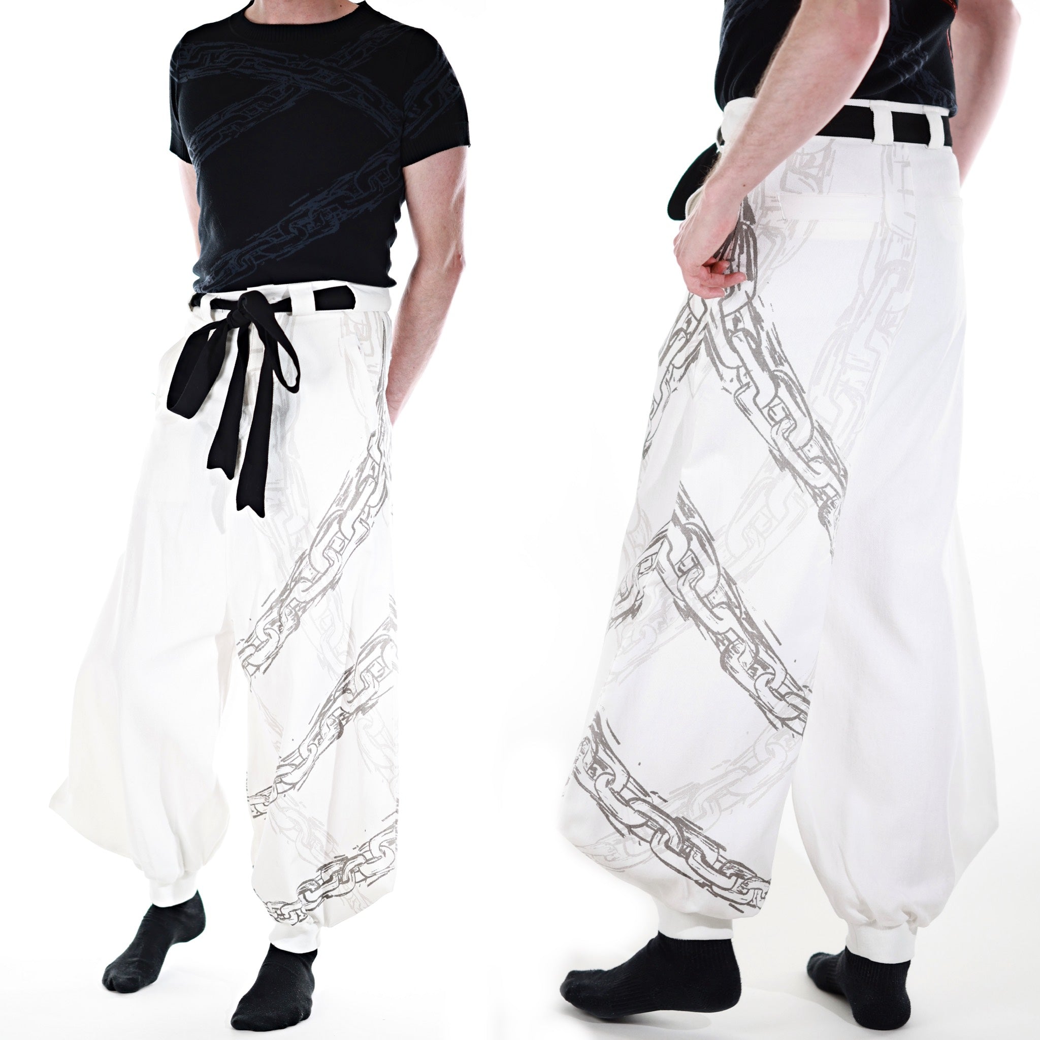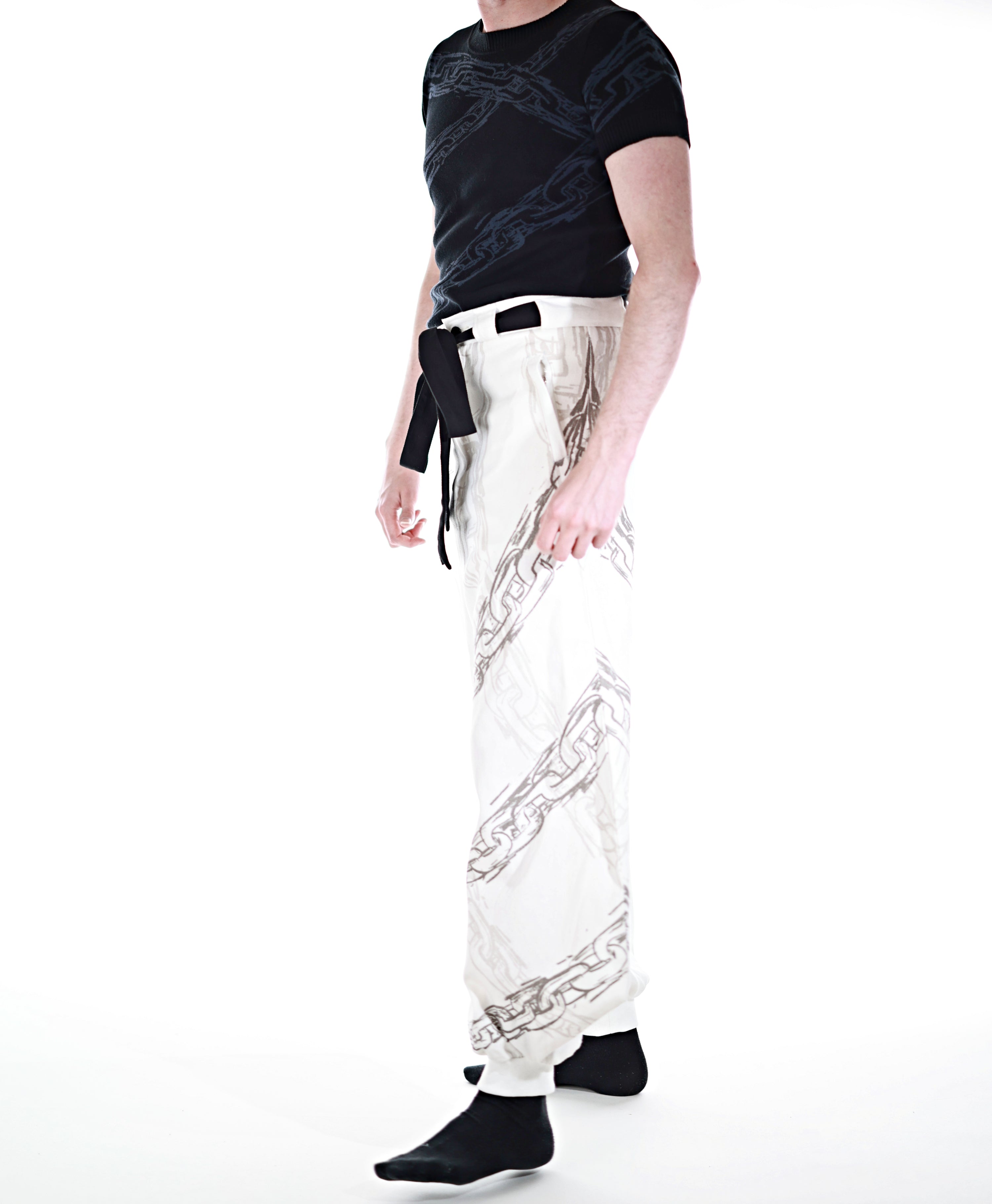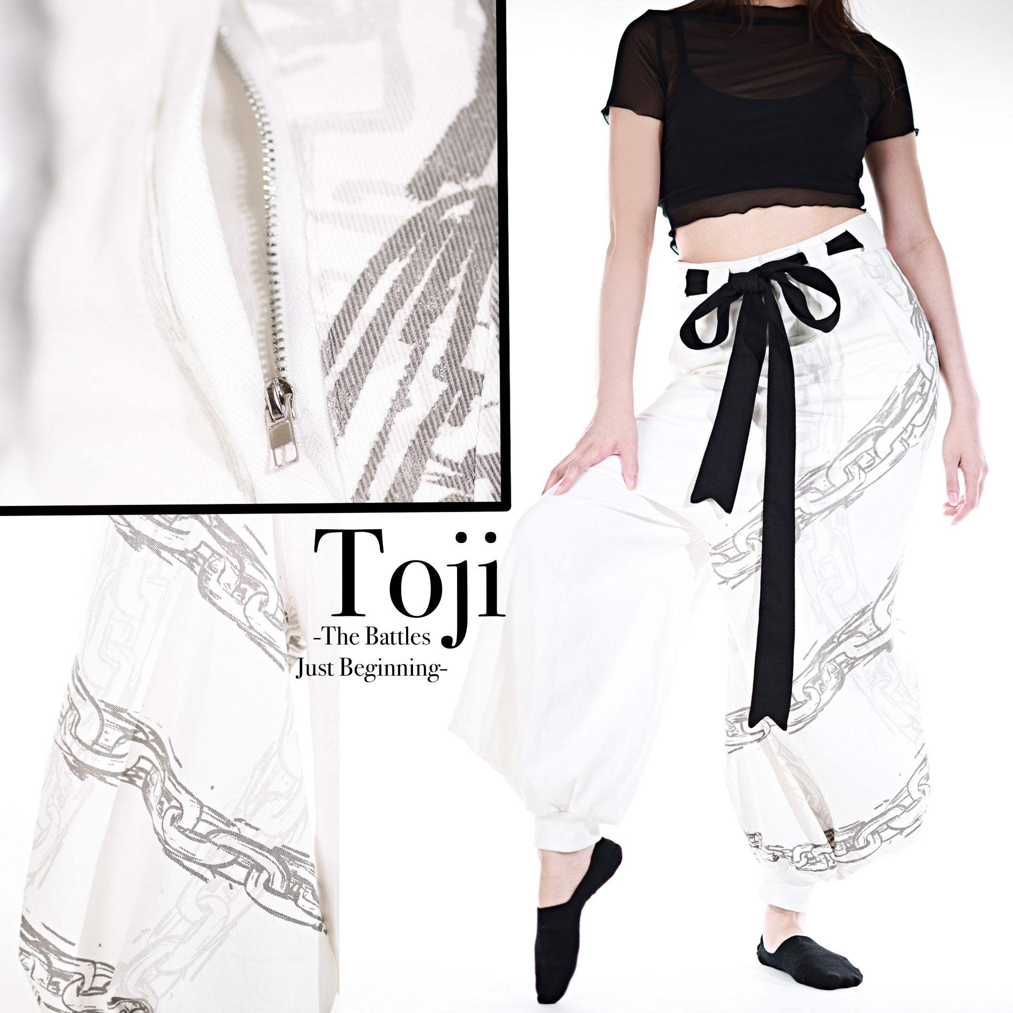This whole collection features some of the most detailed embroidery, knit & print designs we have ever made. The fabric is made from a very high quality denim material. The chain print is very subtle and matches with the Toji T-Shirt and Sweater from JJK Collection Part II. The patterns add a powerful touch inspired by Toji's attacks to the design. The design has the same shape as the sweater Toji was wearing in the show and is perfect to casually wear on the street. It is supposed to make you comfortable while standing out in a positive way. The pants also have pockets with Zippers in the front and elastic in the back for a comfortable fit.