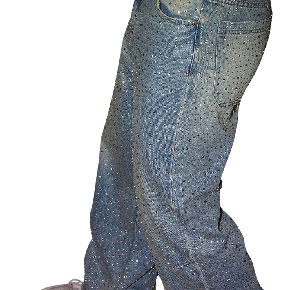 Step into the spotlight with these dazzling denim jeans. Covered in sparkling rhinestones, each pair brings the night sky to life—glittering and bold. Perfect for anyone who wants their outfit to stand out and shine bright.