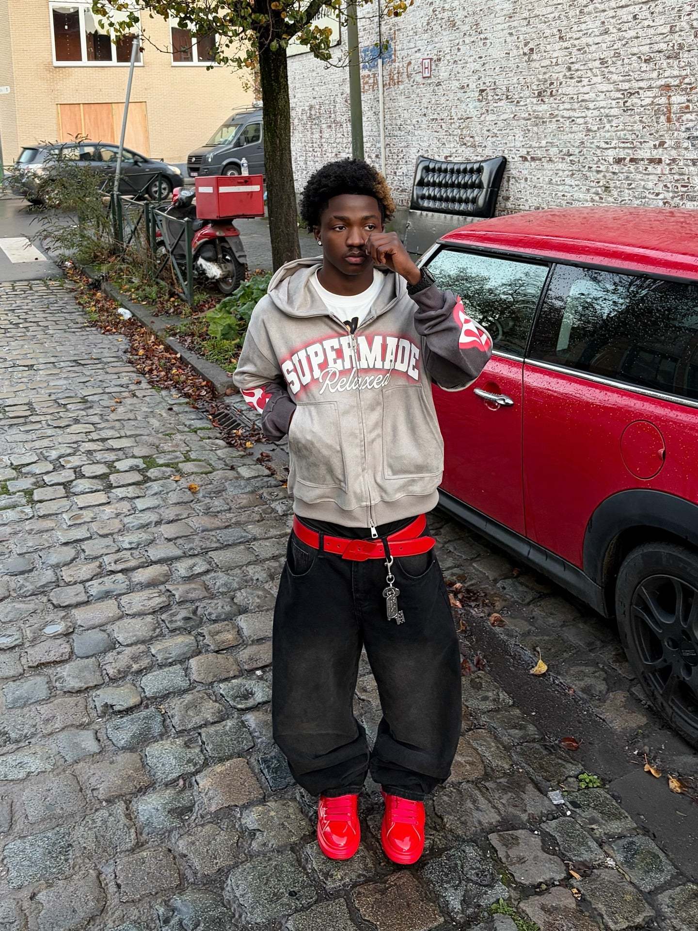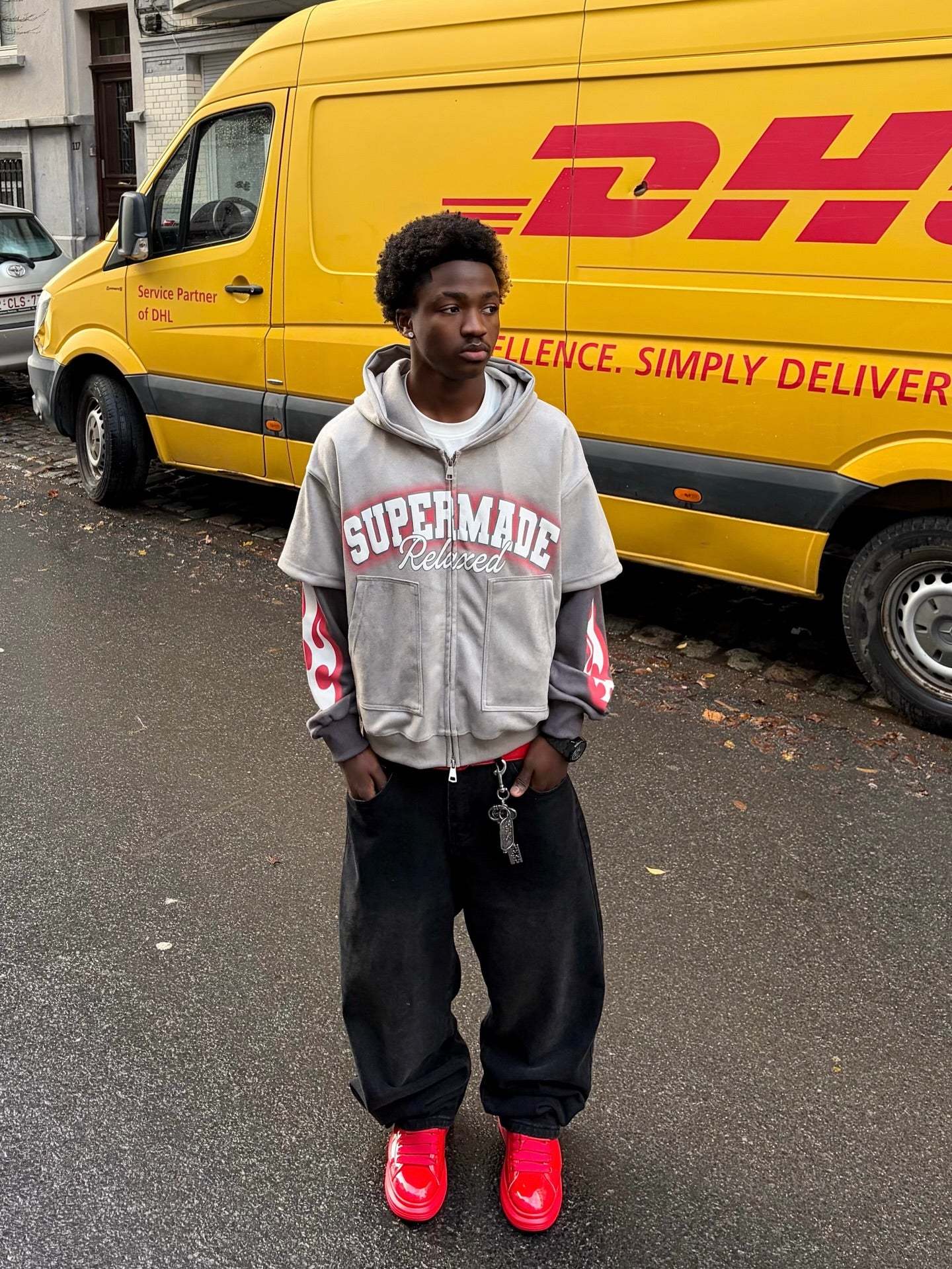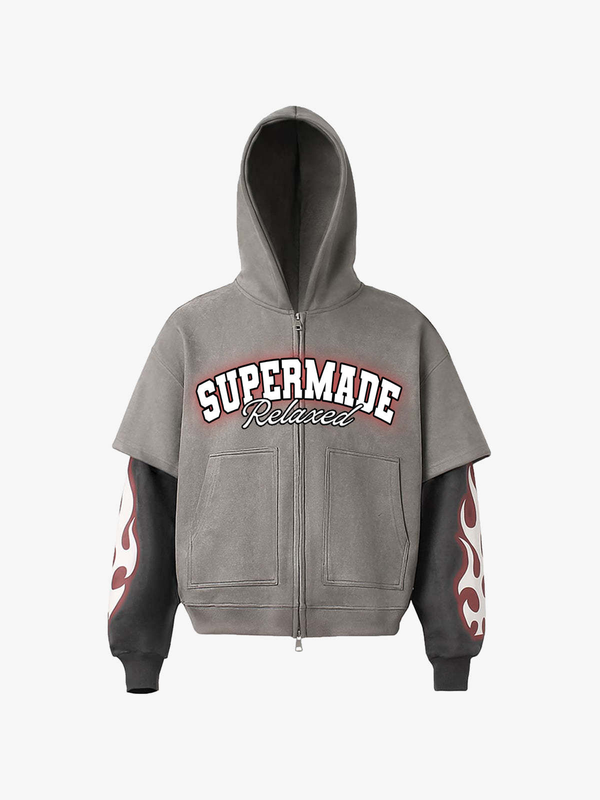 • Design Elements: Bold Flame Prints on Sleeves, Front Pockets, Central Branding Text