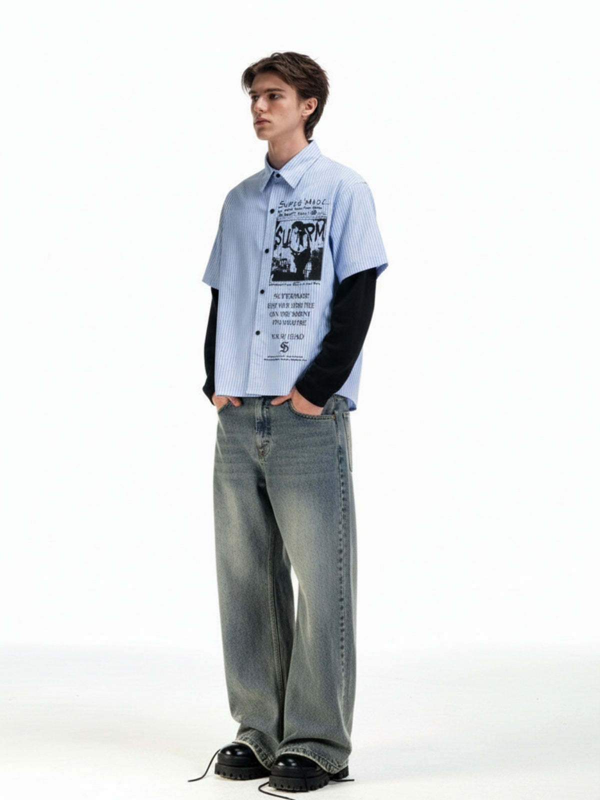 Vintage Illustration Striped Faux Two-Piece Shirt
