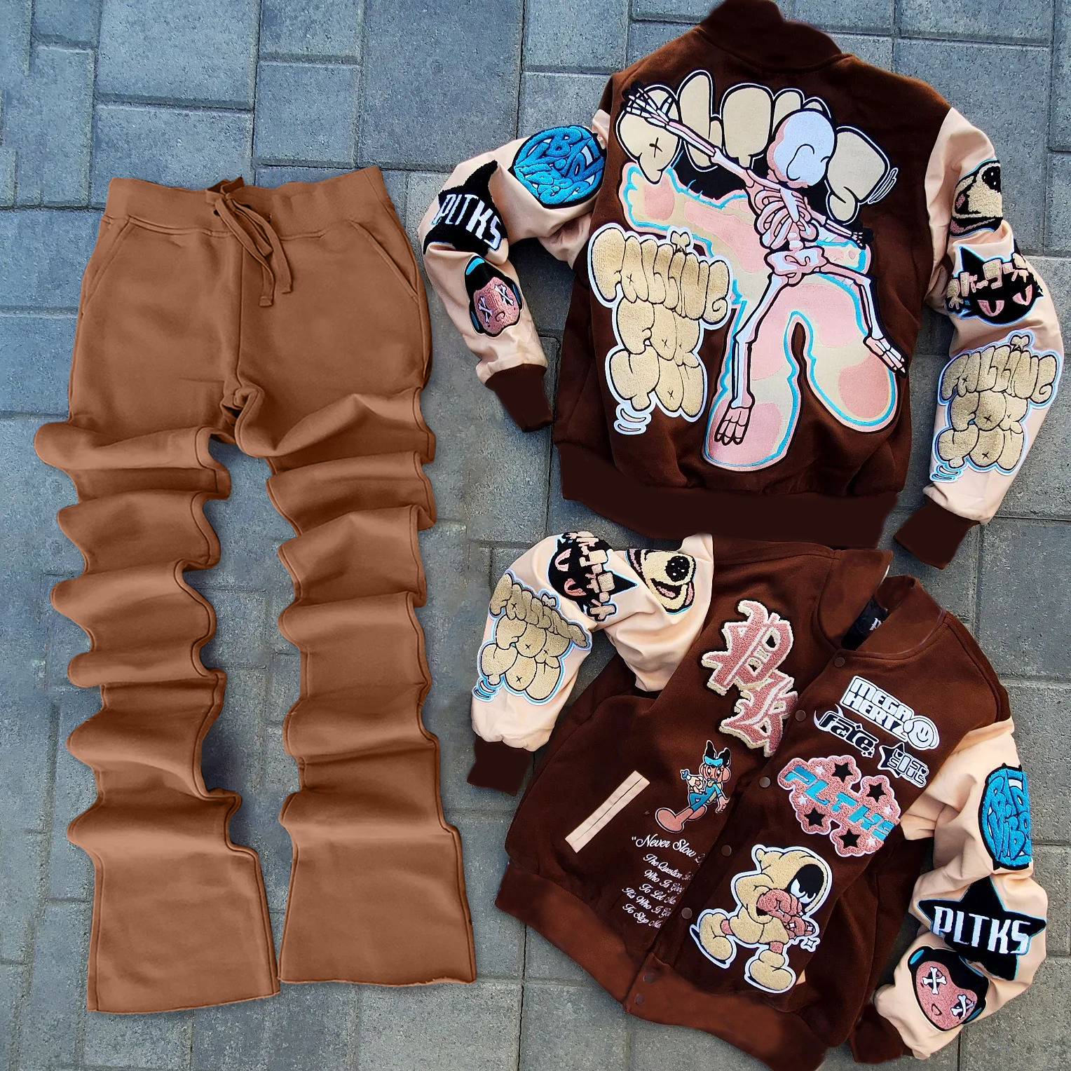 Stylish contrasting color baseball jacket and flared pants suit