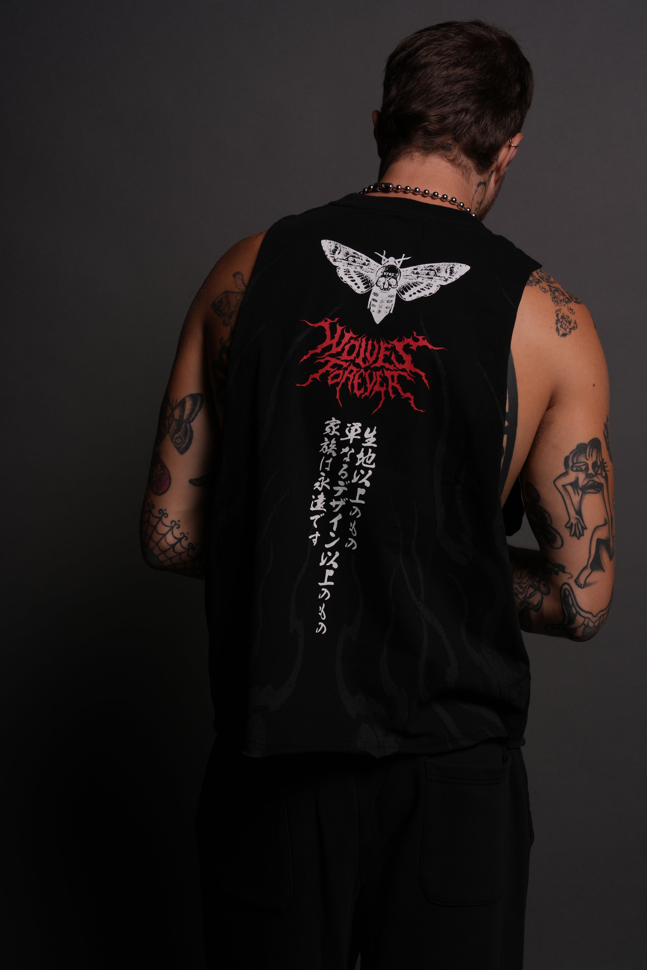 Month Kanji Grunge Raw Cropped "Tommy" Muscle Tee in Black