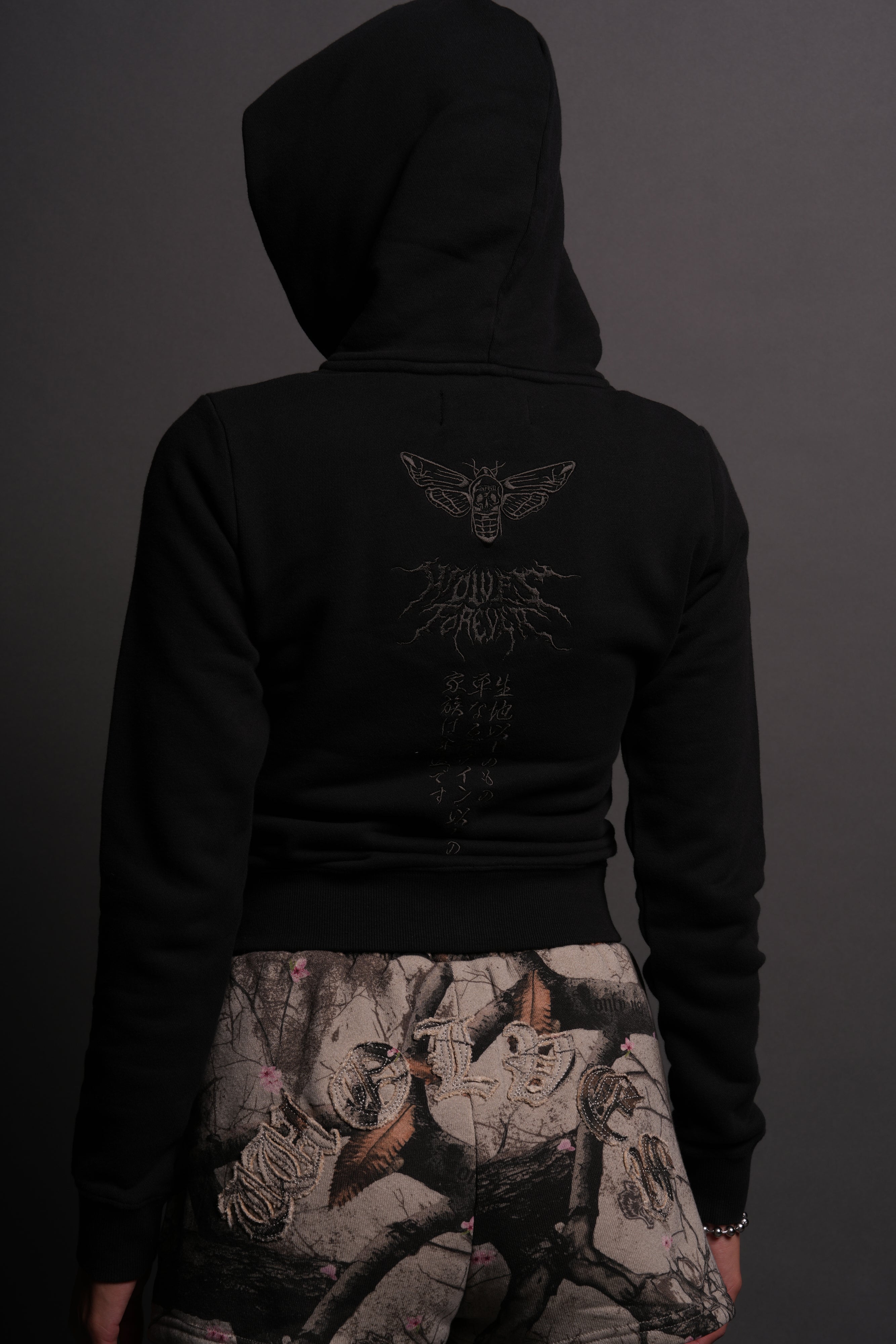 Moth Kanji "Iris" Zip Up Hoodie in Black