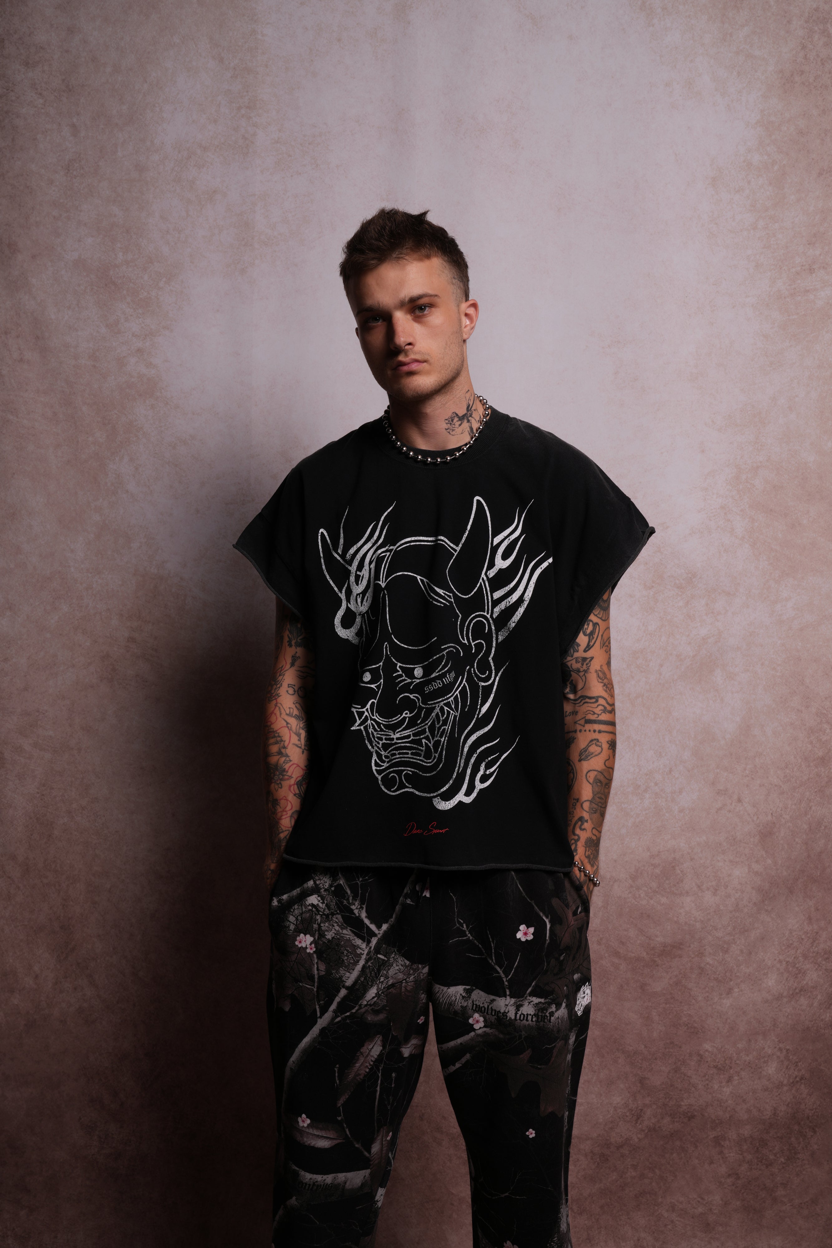 Oni Fire Grunge Cut-Off Tee in Black