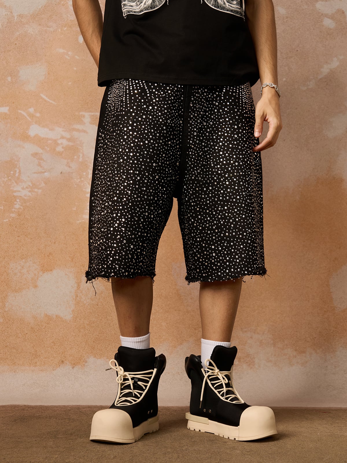 Retro Washed Rhinestone Raw Edge Denim Shorts - 2419