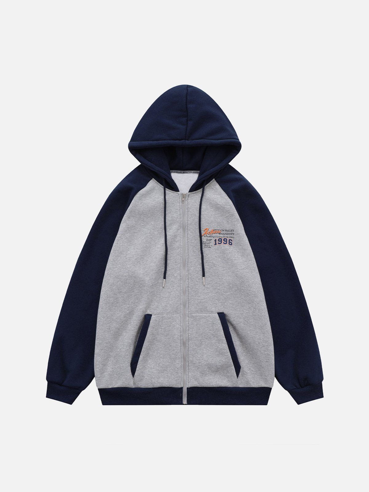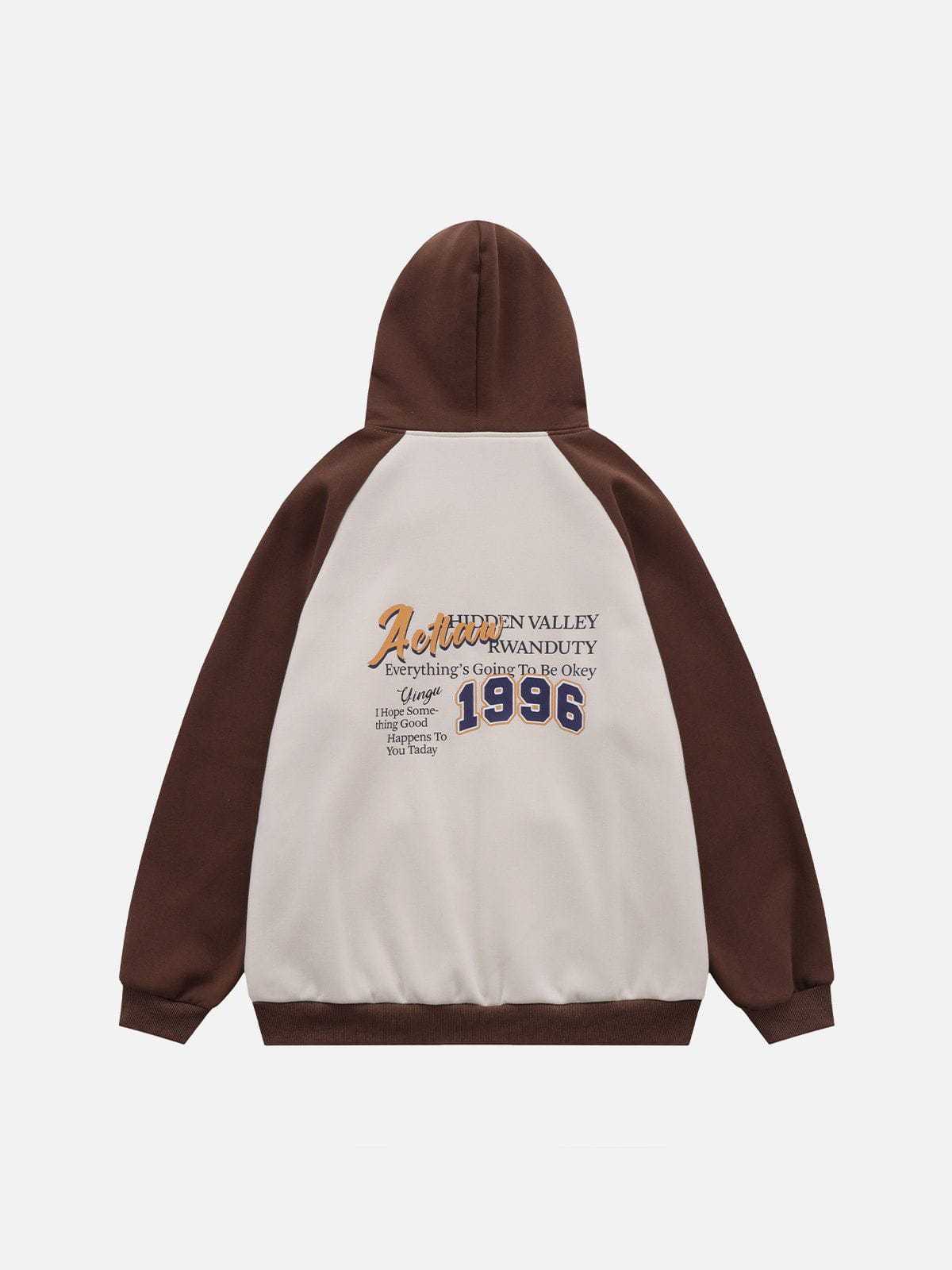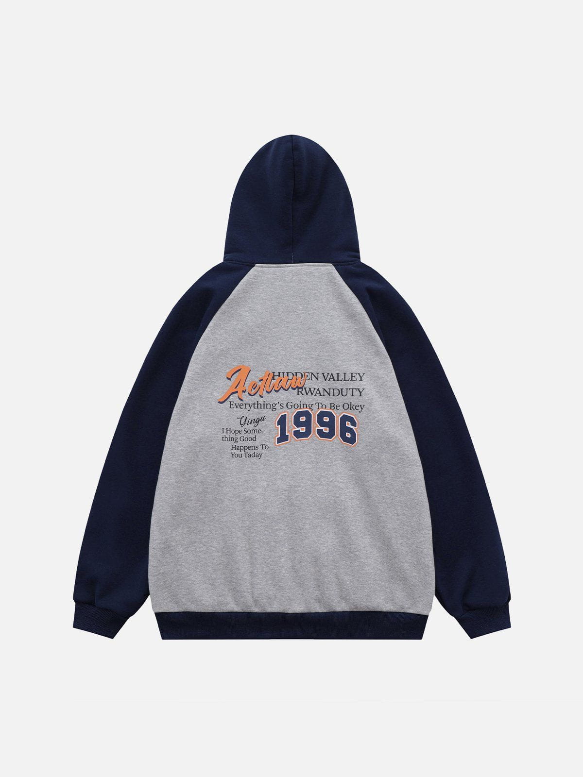 The hood, sleeves, and hem are in one color, creating a cohesive and eye-catching design. The chest area features a letter print and the back of the hoodie also showcases the same letter print, creating a cohesive and balanced aesthetic.