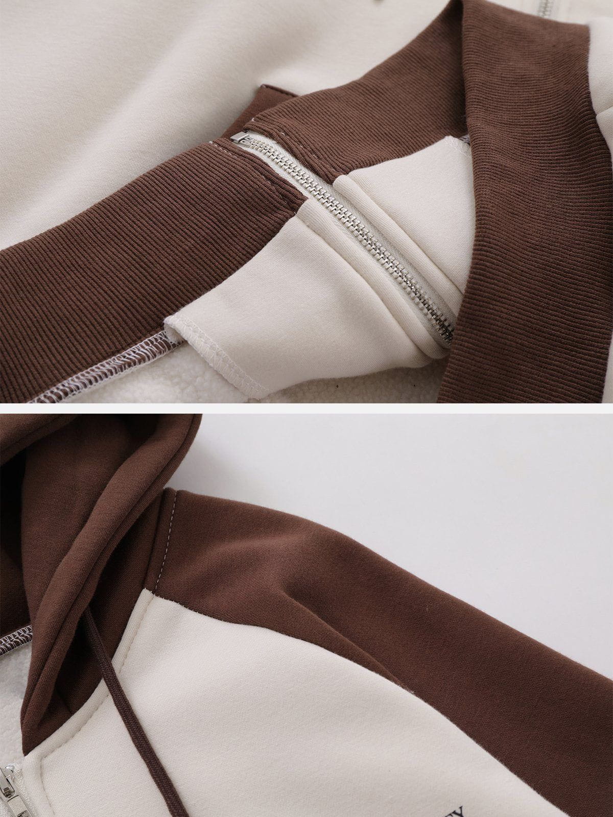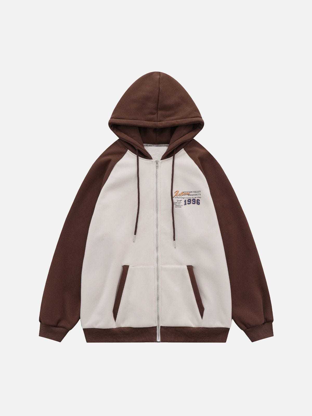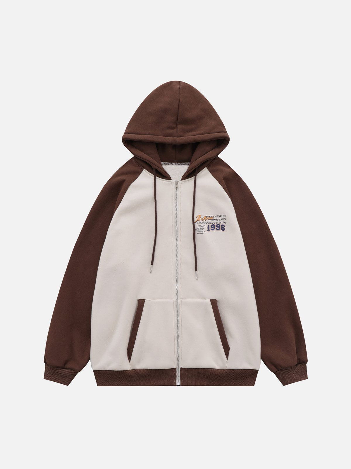 The hood, sleeves, and hem are in one color, creating a cohesive and eye-catching design. The chest area features a letter print and the back of the hoodie also showcases the same letter print, creating a cohesive and balanced aesthetic.