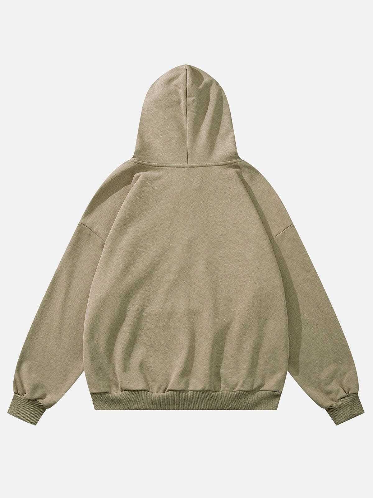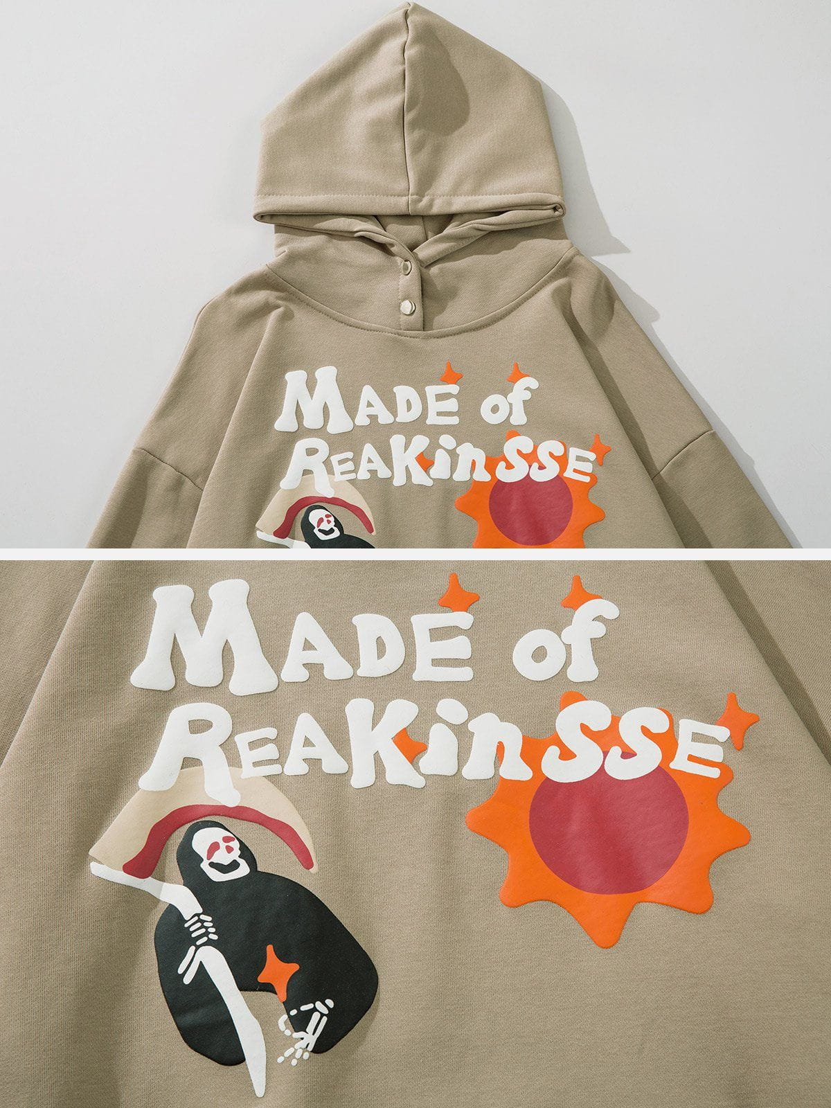 The standout feature of this hoodie is the intriguing print and lettering adorning the front. The contrasting imagery of the sun and the grim reaper creates a powerful juxtaposition between light and darkness. The sun symbolizes brightness, warmth, and positivity, while the grim Reaper represents life's mysterious and darker aspects.