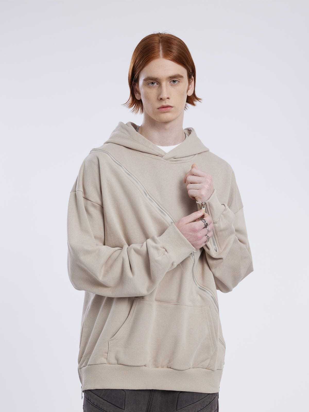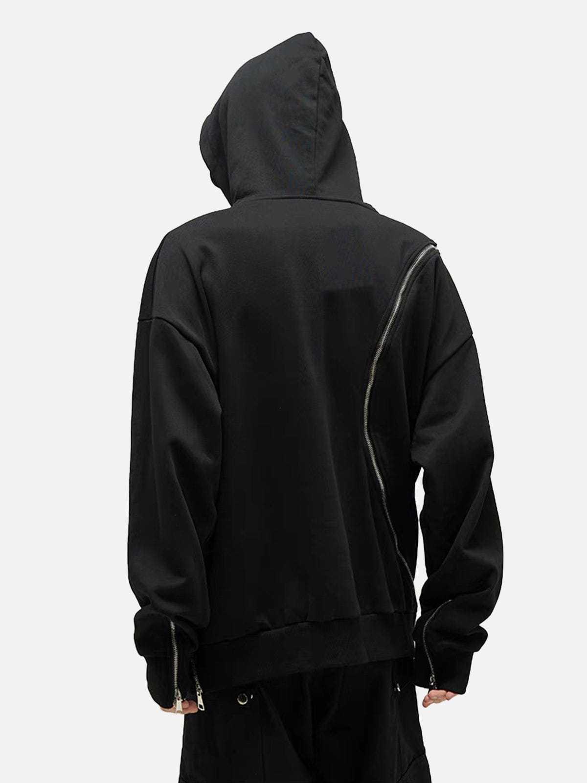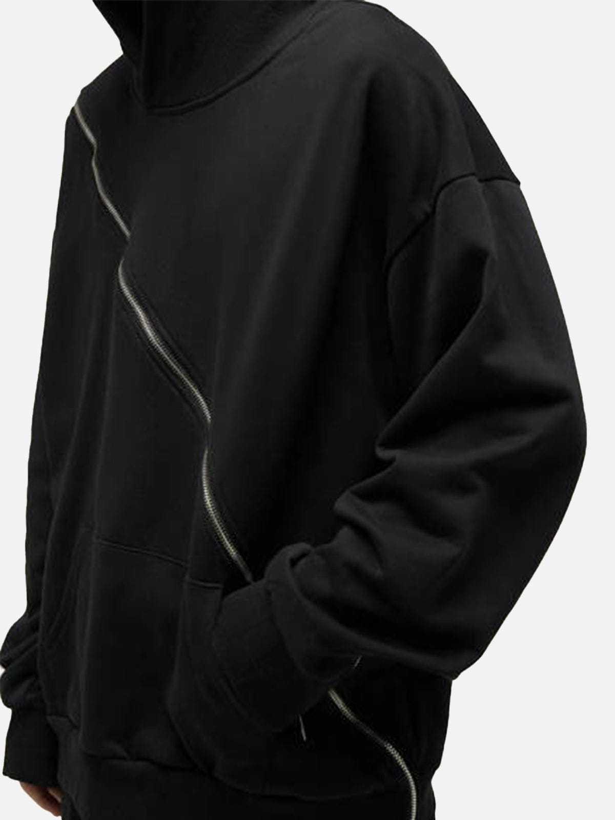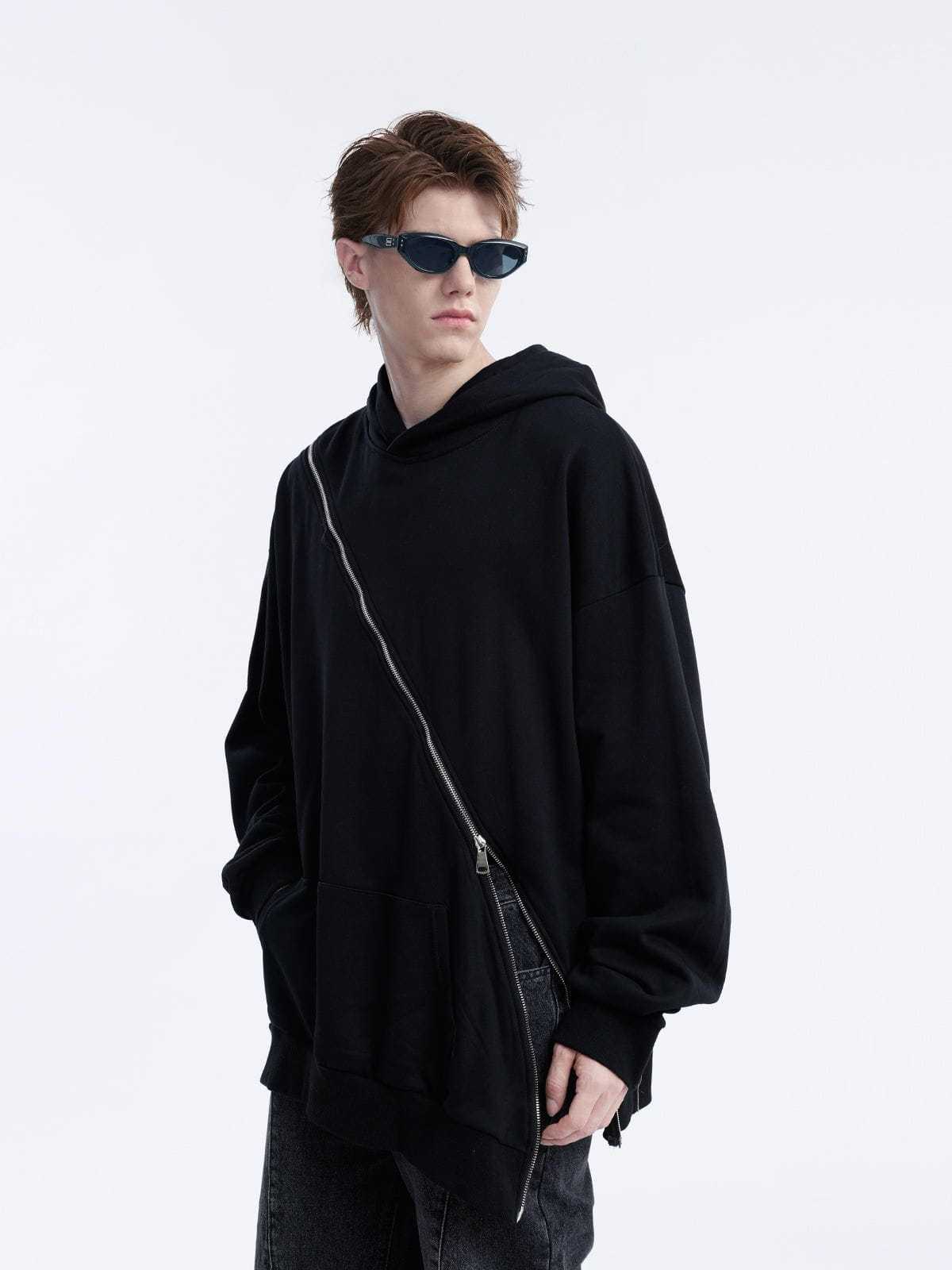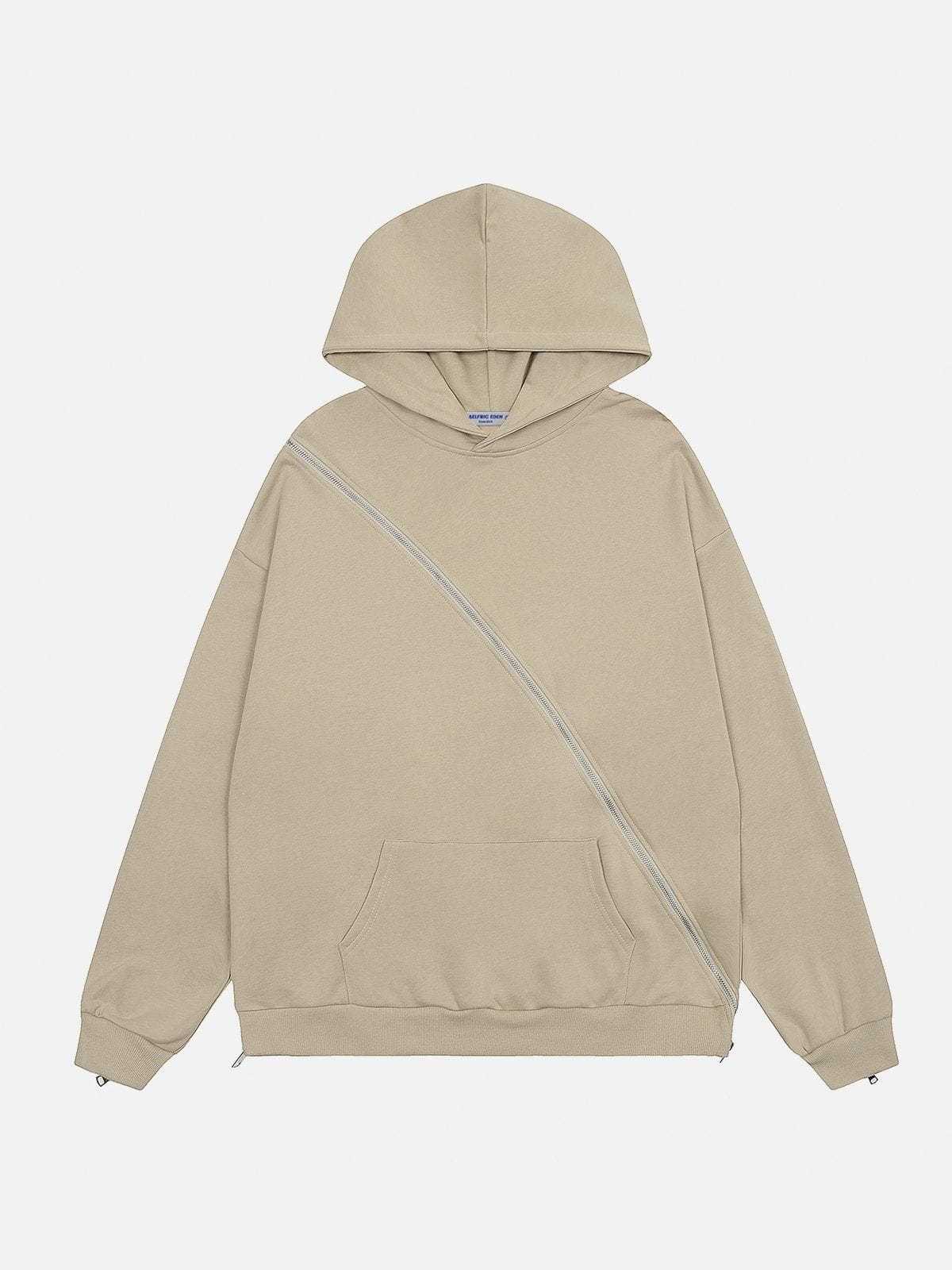 Our Fashionable Slant Zip Pure Color Hoodie features a creative design where the zipper extends from the front all the way to the back. The minimalist solid color design makes this hoodie a versatile match for various outfits.