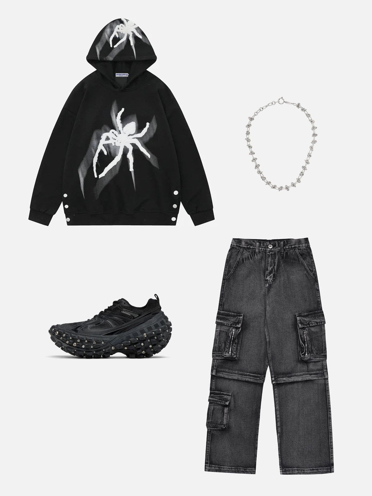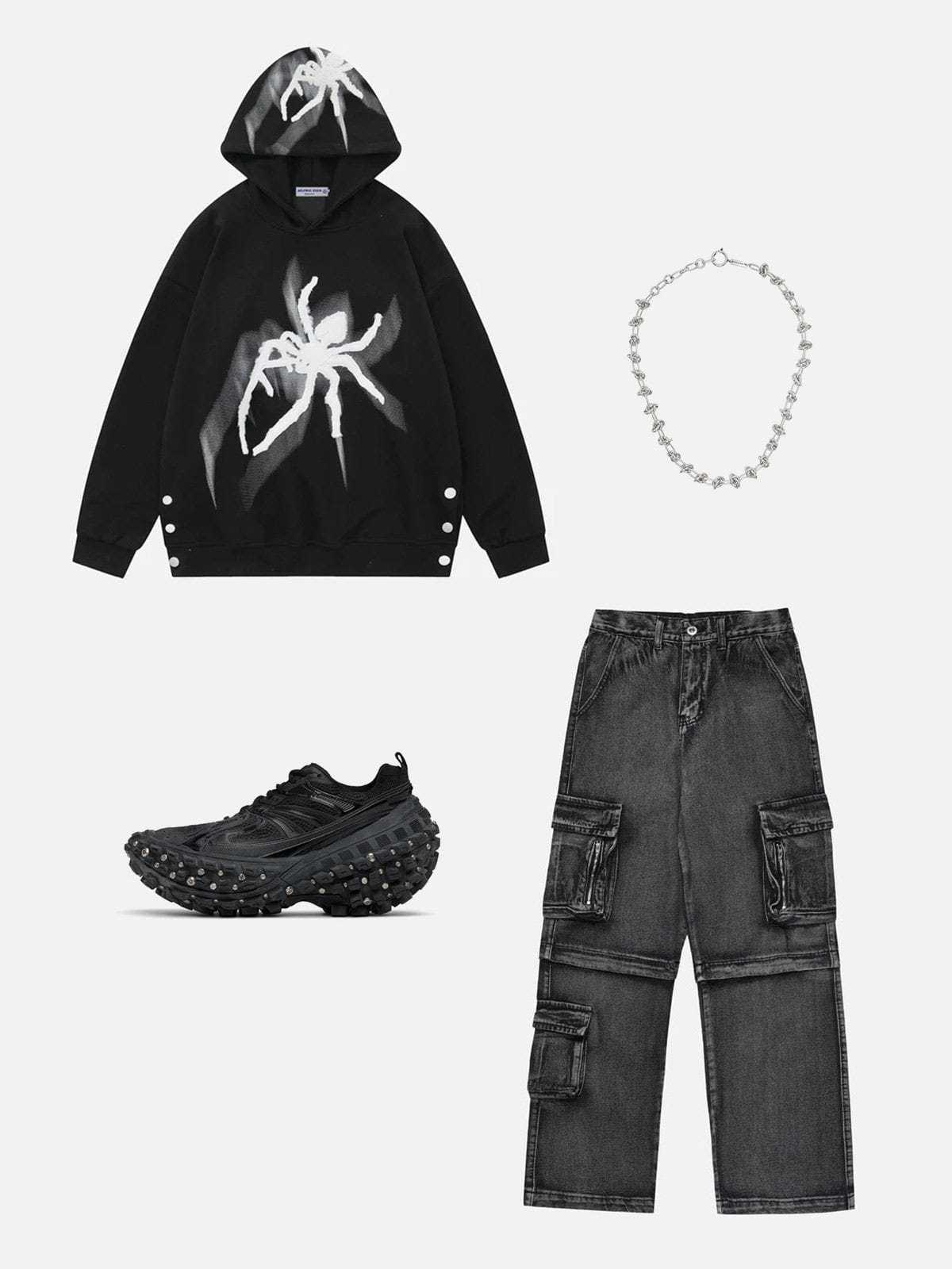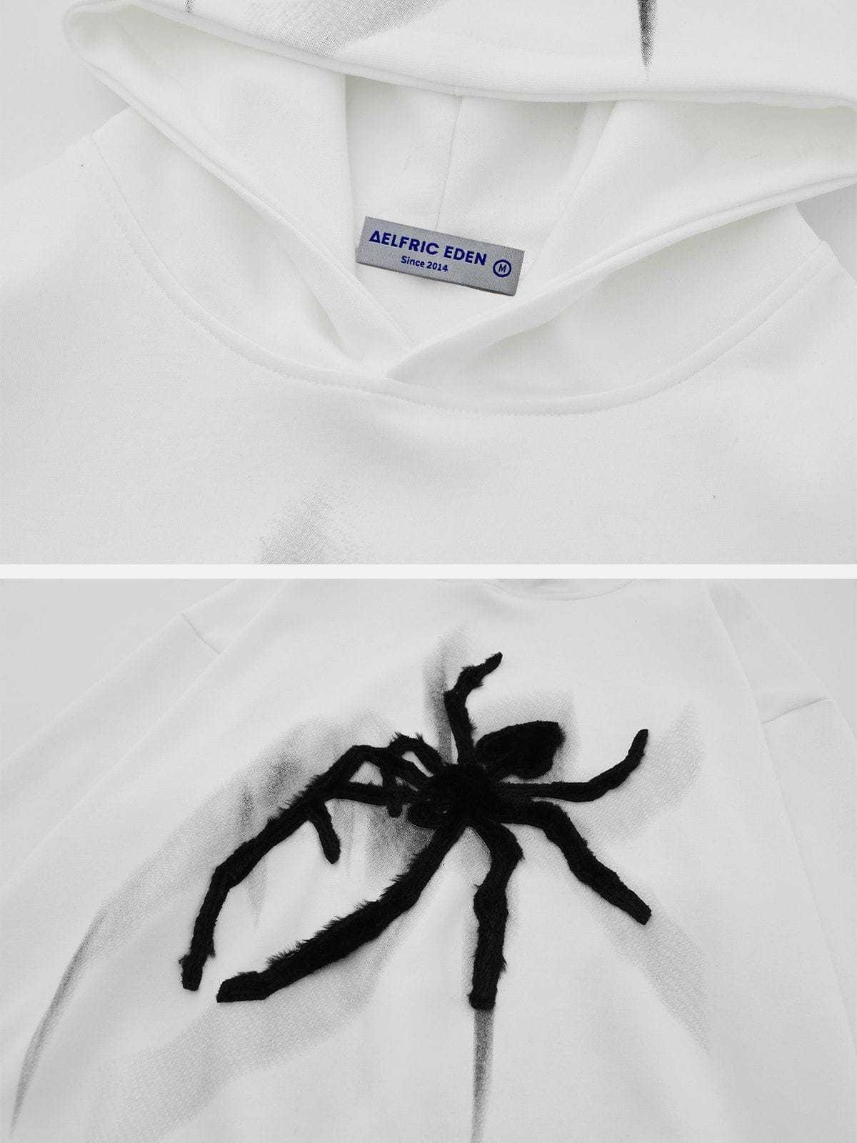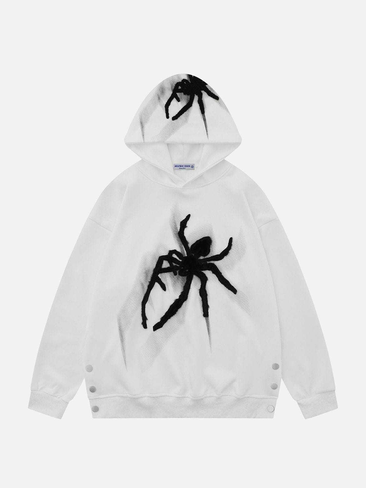 The front of the hoodie showcases one spider motif embroidered, and the hood features a spider, adding visual interest to the overall design. The contrast color allows the spider motifs to stand out and grab attention.