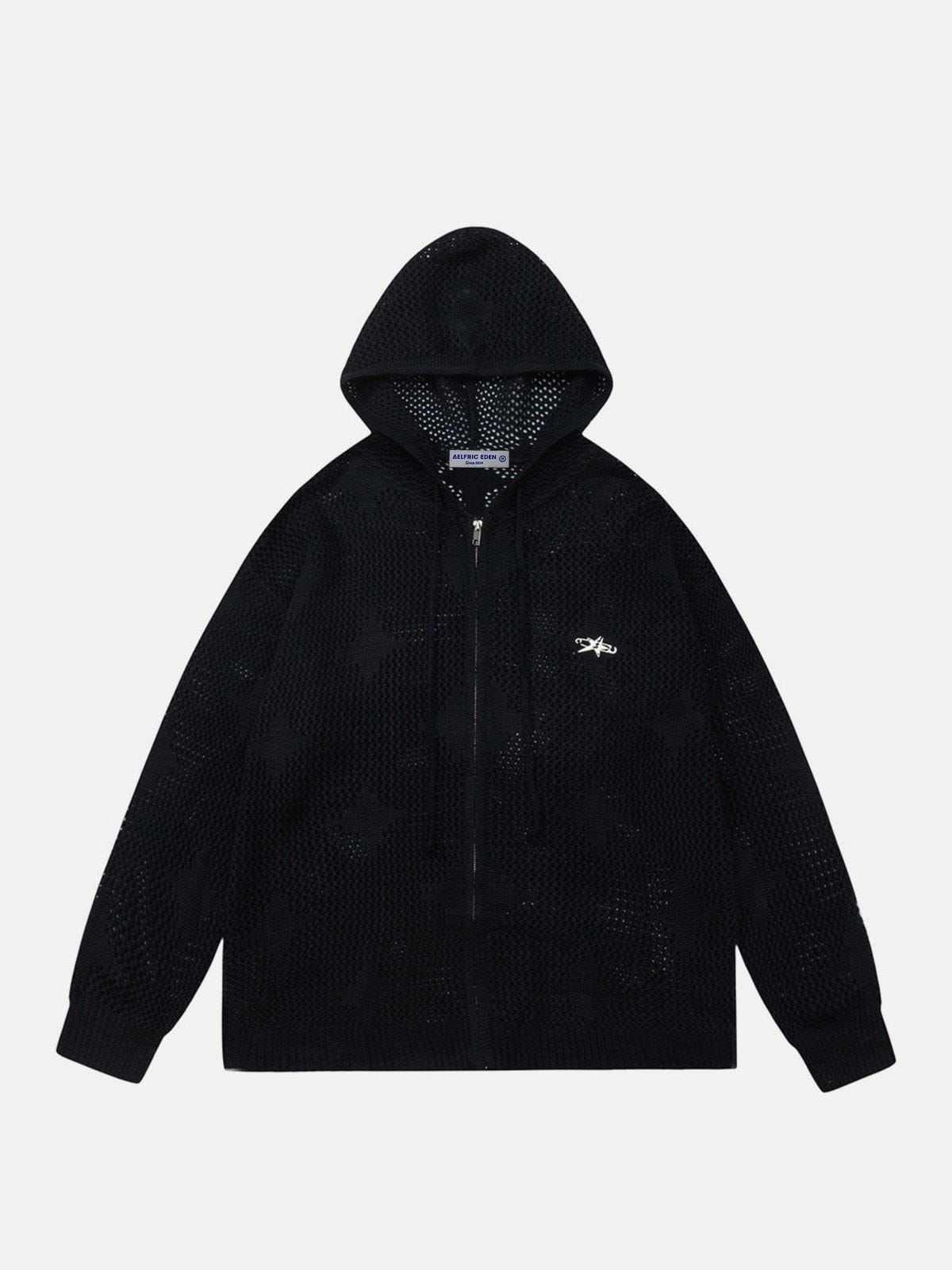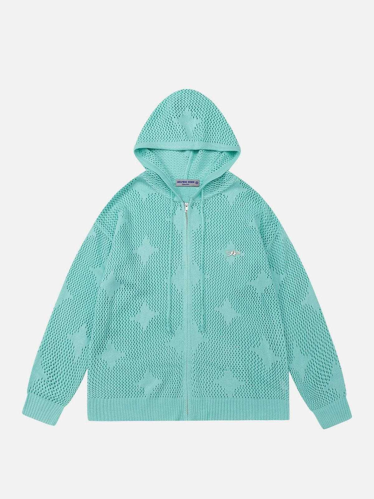 This pure-colored sweater features delicate cutouts in a captivating quadrilateral design that speaks of sophisticated minimalism. Adorned with celestial star-shaped metallic accents, it's a fusion of contemporary fashion and cosmic wonder.