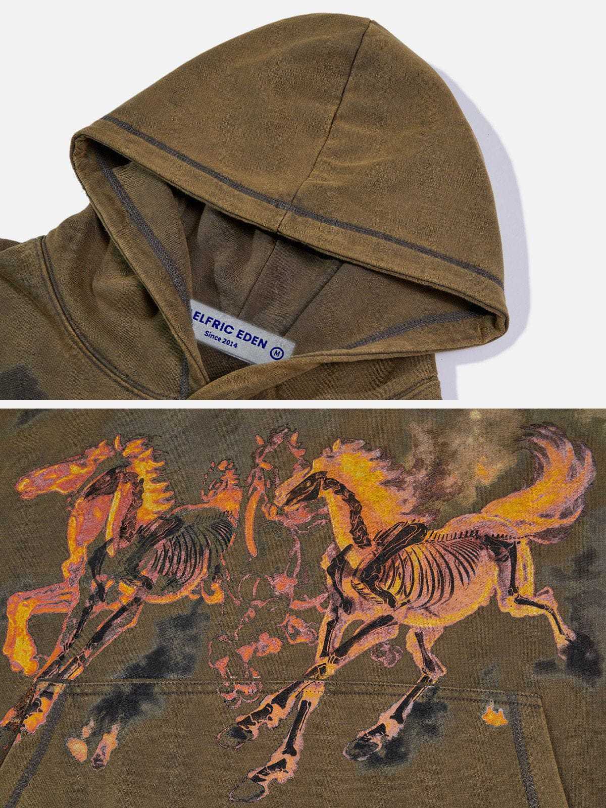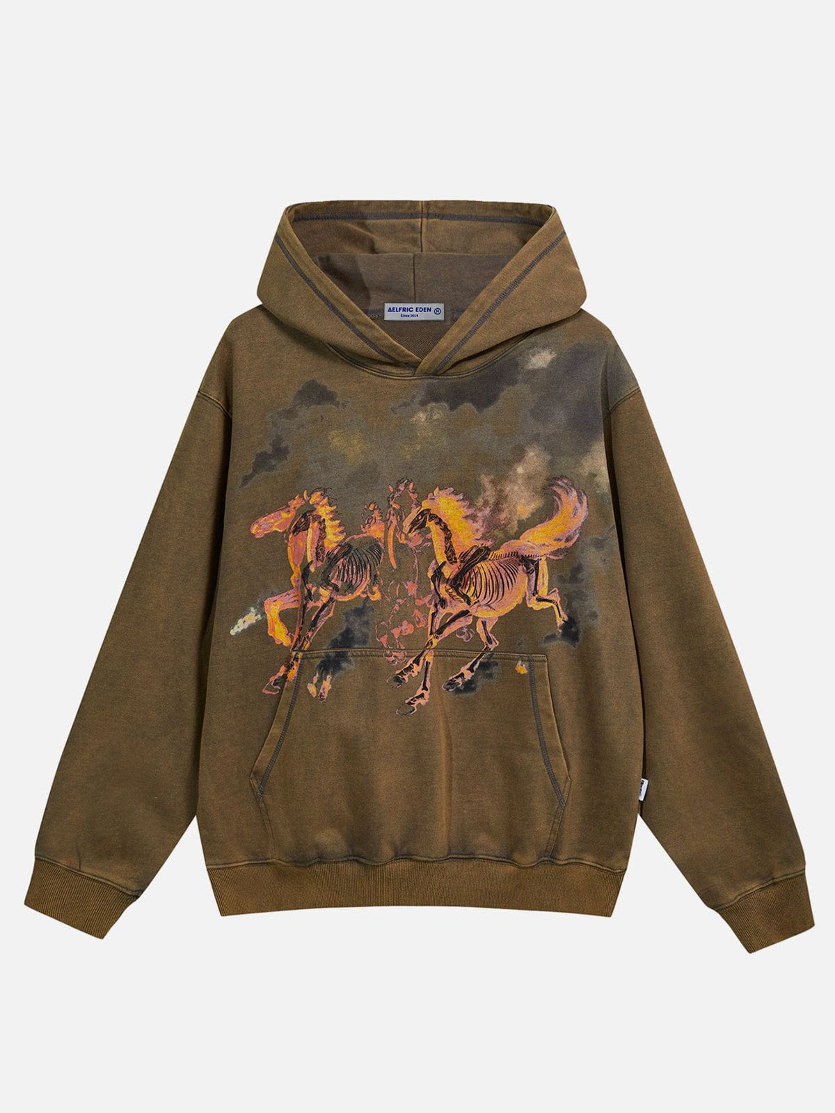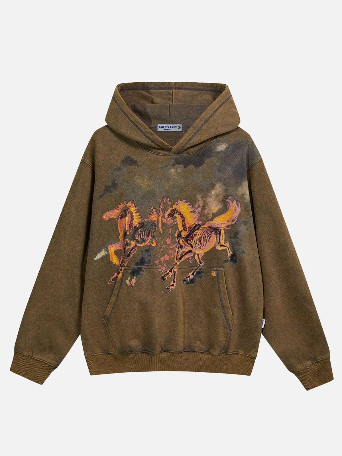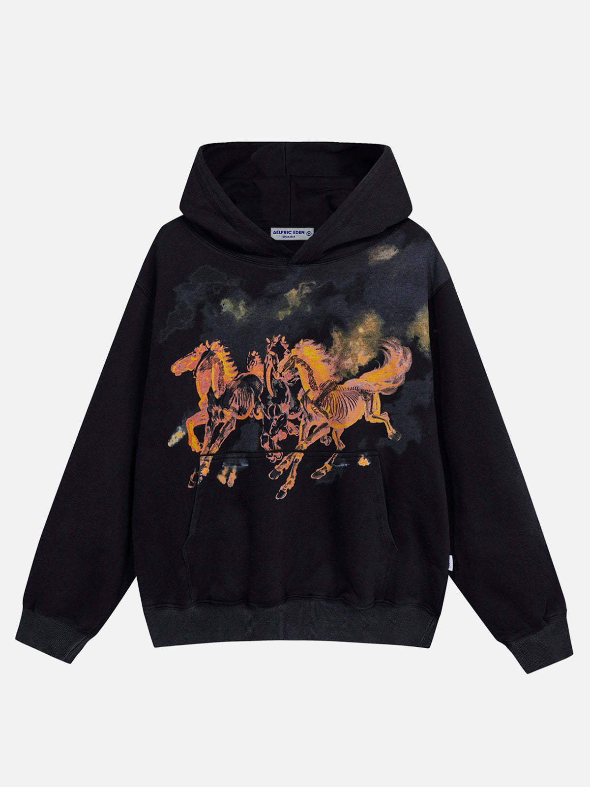 The central focus of this hoodie is  beautifully crafted galloping horses, captured in full stride, exuding elegance and power. It's a symbol of freedom and determination, beautifully depicted in a vintage-inspired style.