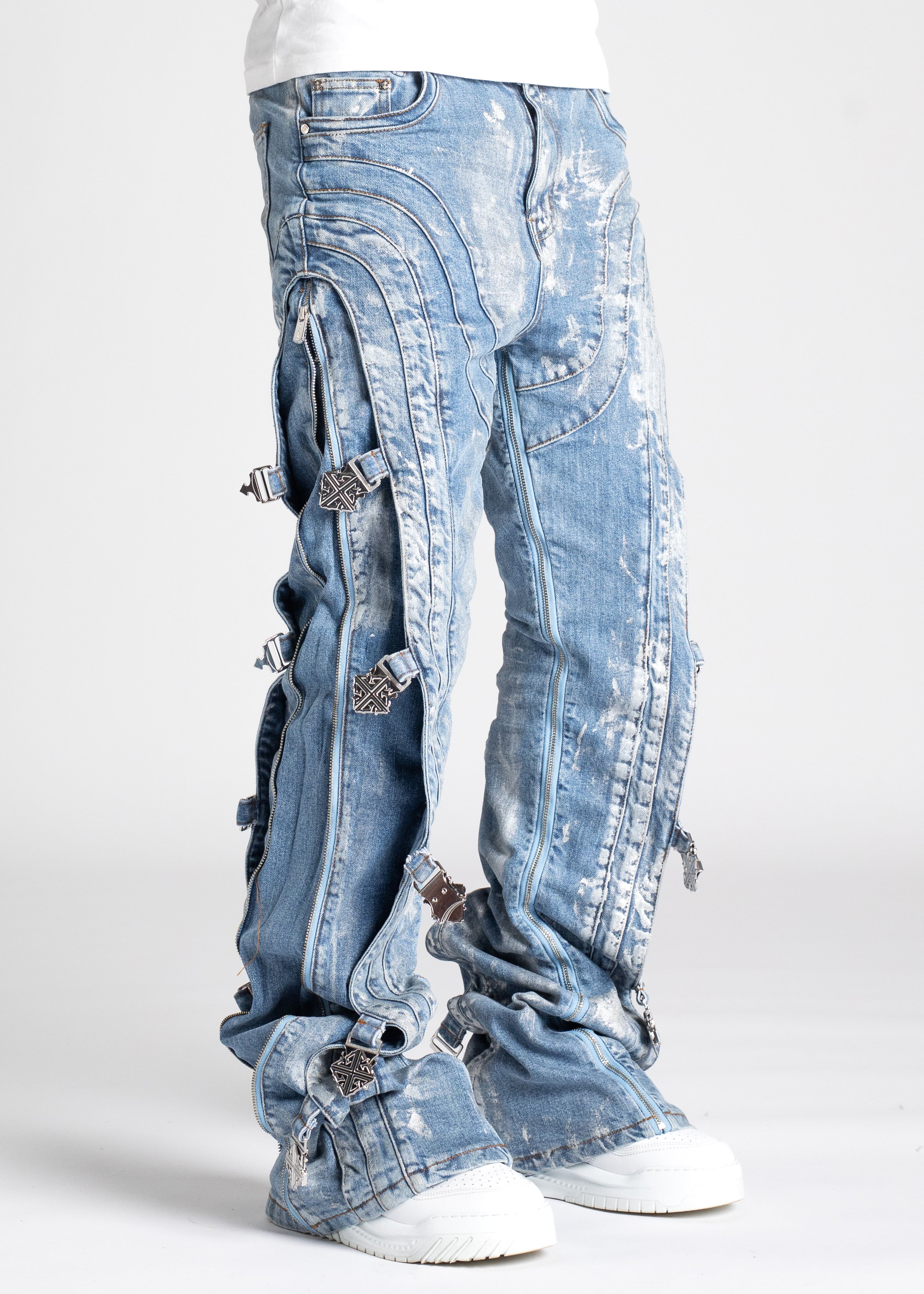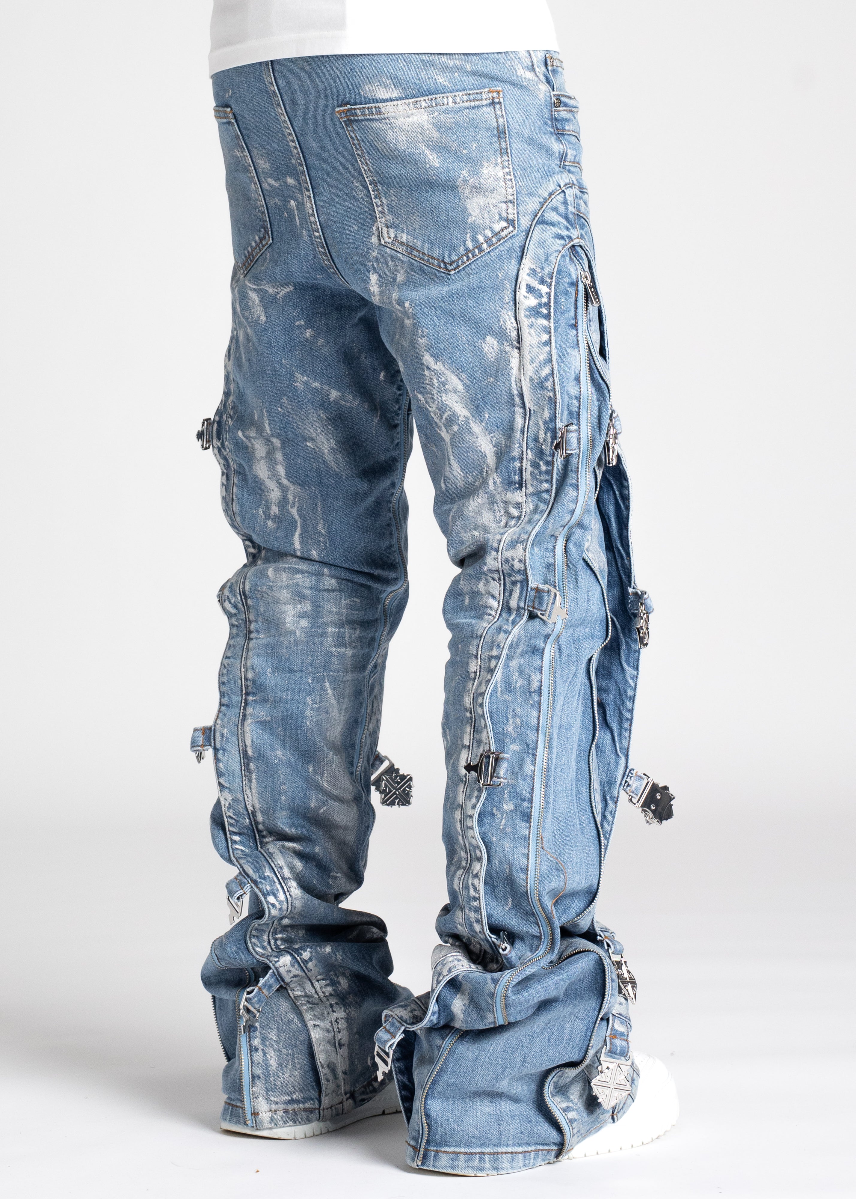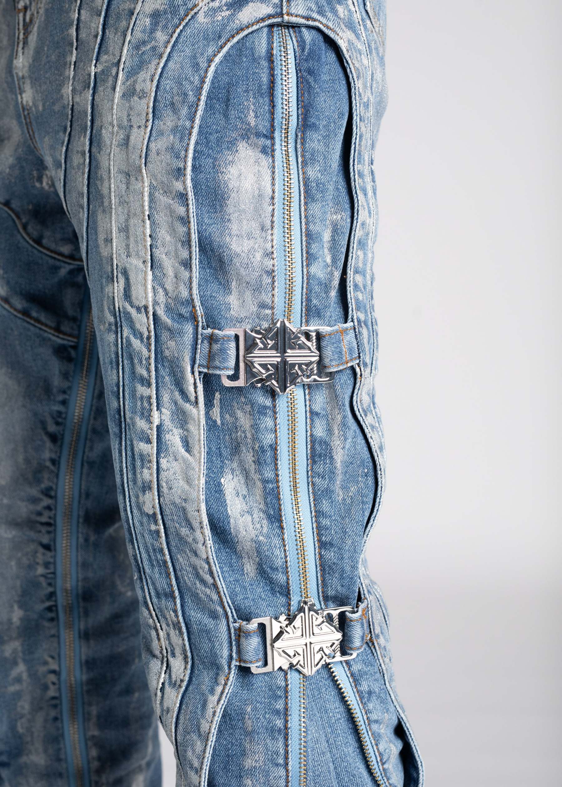 Our most sophisticated denim yet, the Obsidian Black Waxed Premium Denim is paneled. It features our signature silhouette, adorned with side buckles, full-functioning inner zippers, and a premium wax finish.