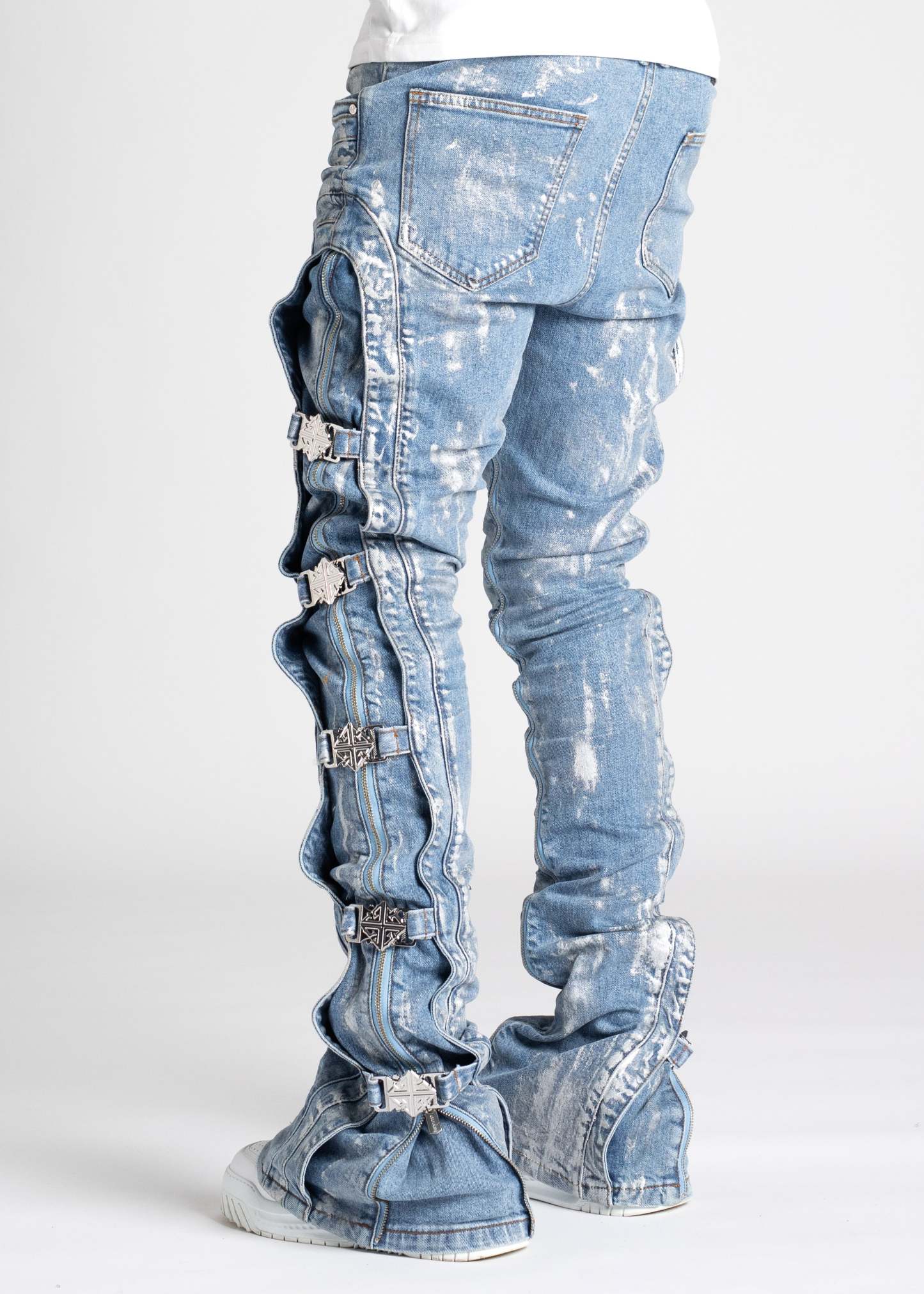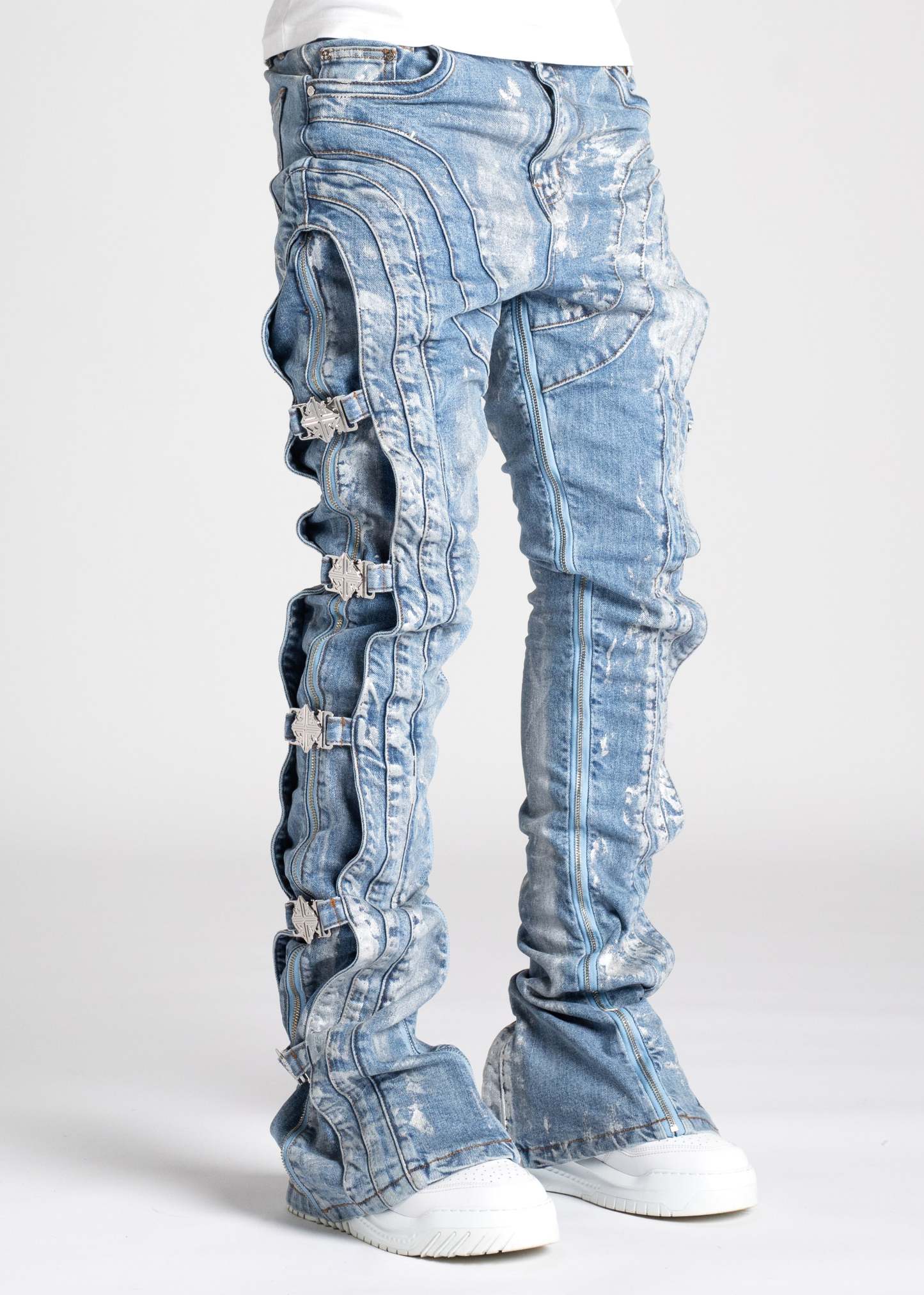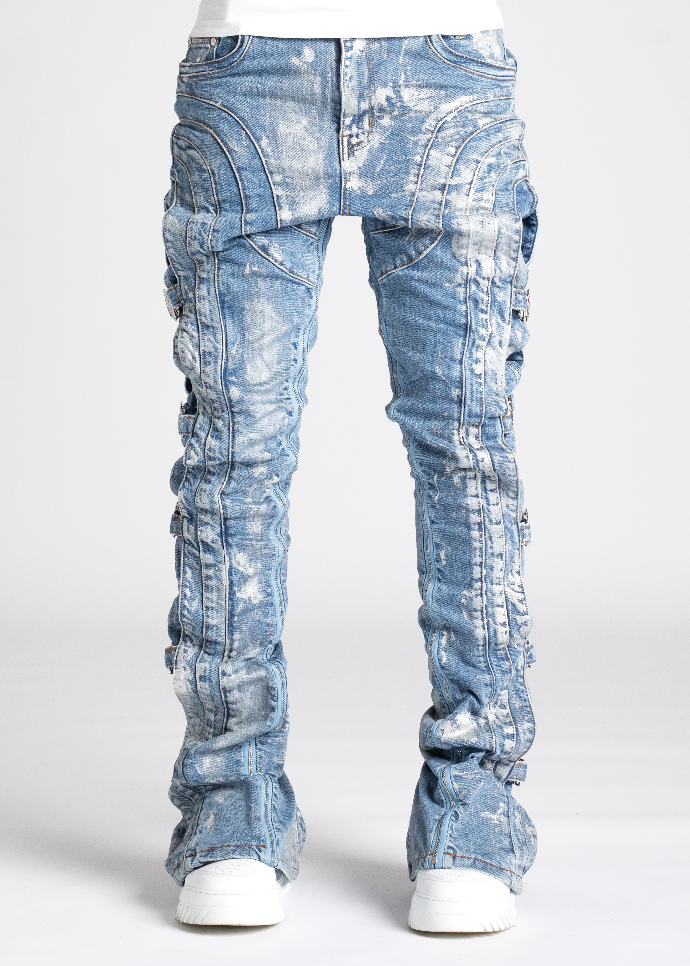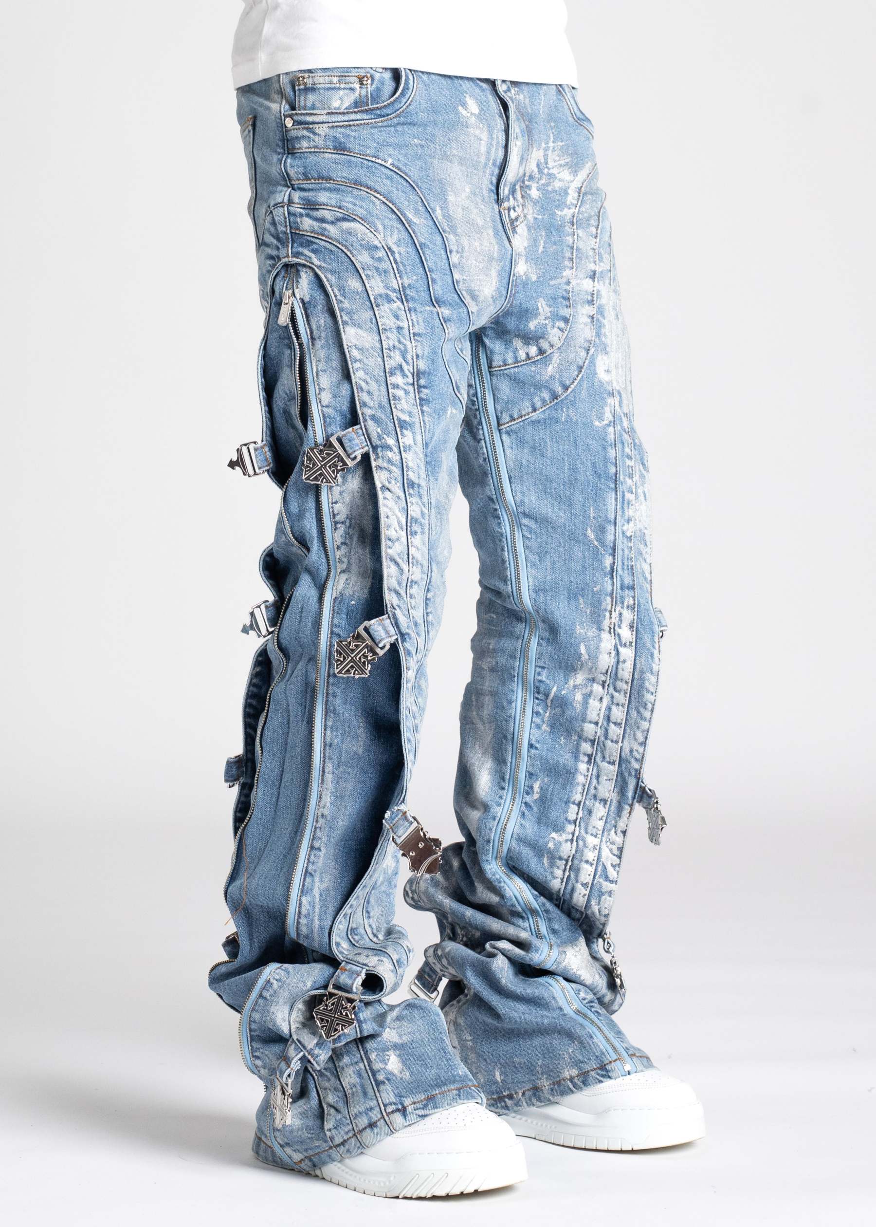 Our most sophisticated denim yet, the Obsidian Black Waxed Premium Denim is paneled. It features our signature silhouette, adorned with side buckles, full-functioning inner zippers, and a premium wax finish.