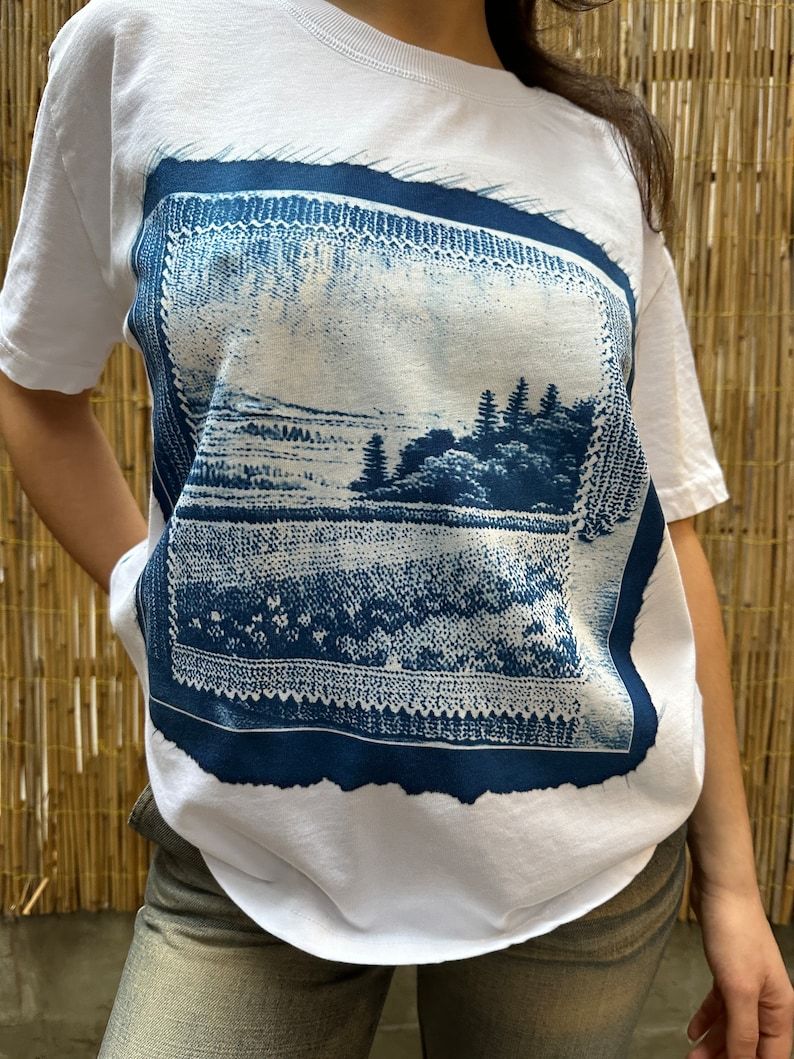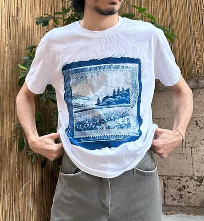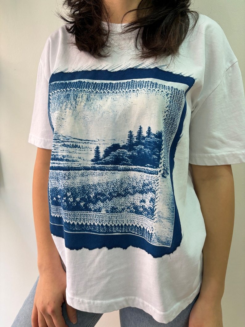 We use hight-quality fabrics and papers to make the prints. First, we coat the surface with a light-sensitive emulsion and then expose it to in direct sunlight. Any part of the surface that is exposed will react and change color. Finally we rinse it in water and stabilize the print.