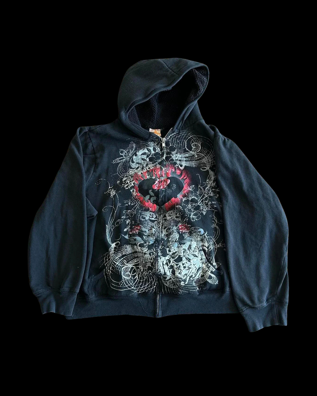 Black zip hoodie with a distressed graphic print featuring a flaming red heart surrounded by metallic silver scrolls, skulls, and baroque patterns. Relaxed fit with a soft inner lining, ribbed cuffs and hem, and front pouch pockets. Cotton blend, true to size, and ready to ship.