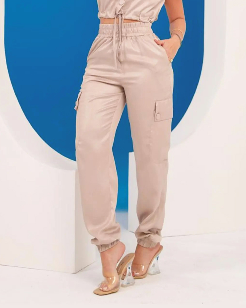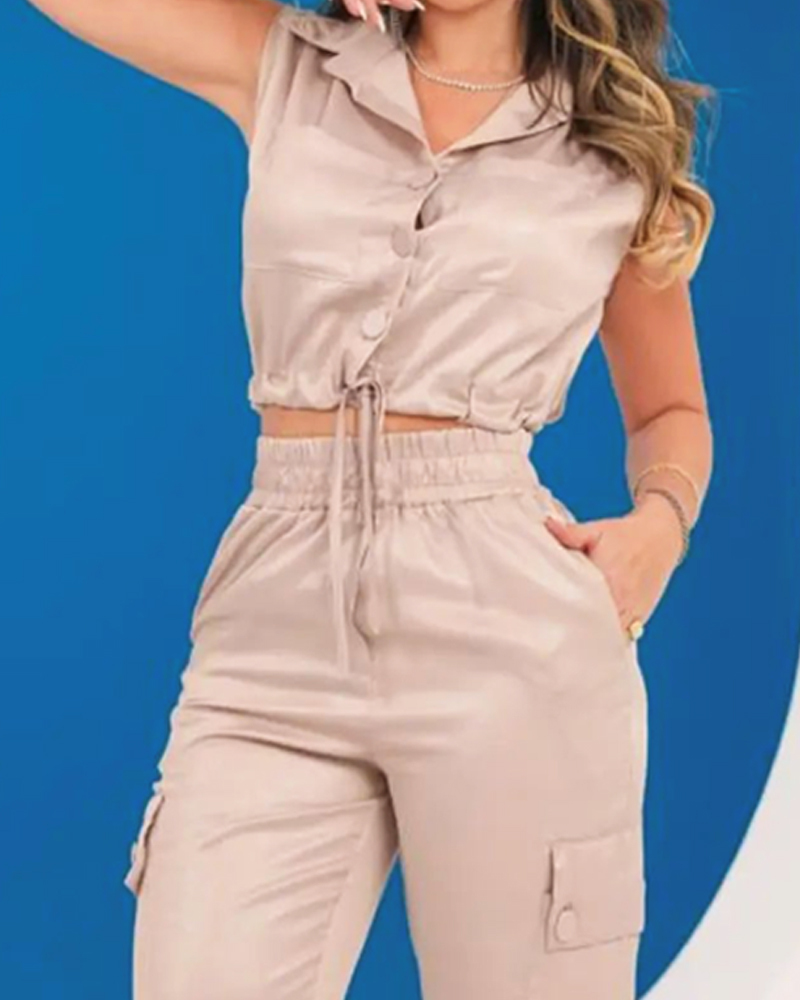 Casual Solid Color Sleeveless Lapel Top & Pants Two-Piece Set