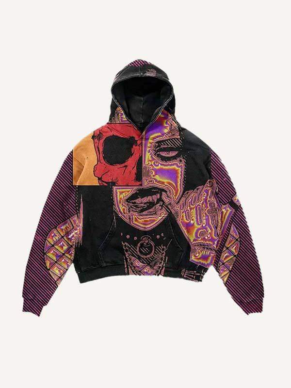 Colorblock Striped&Skull&Figure Print Slant Pockets Hoodie