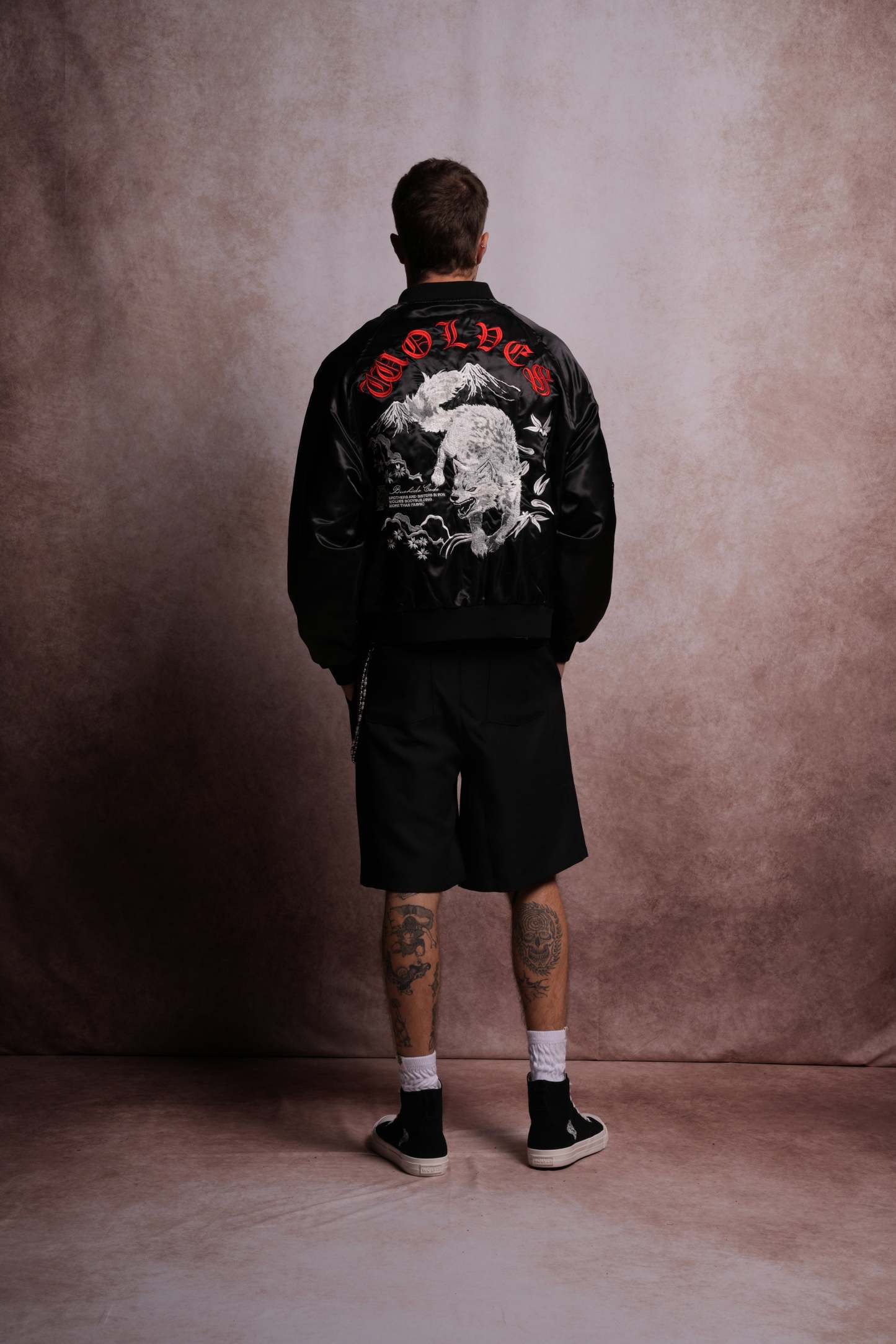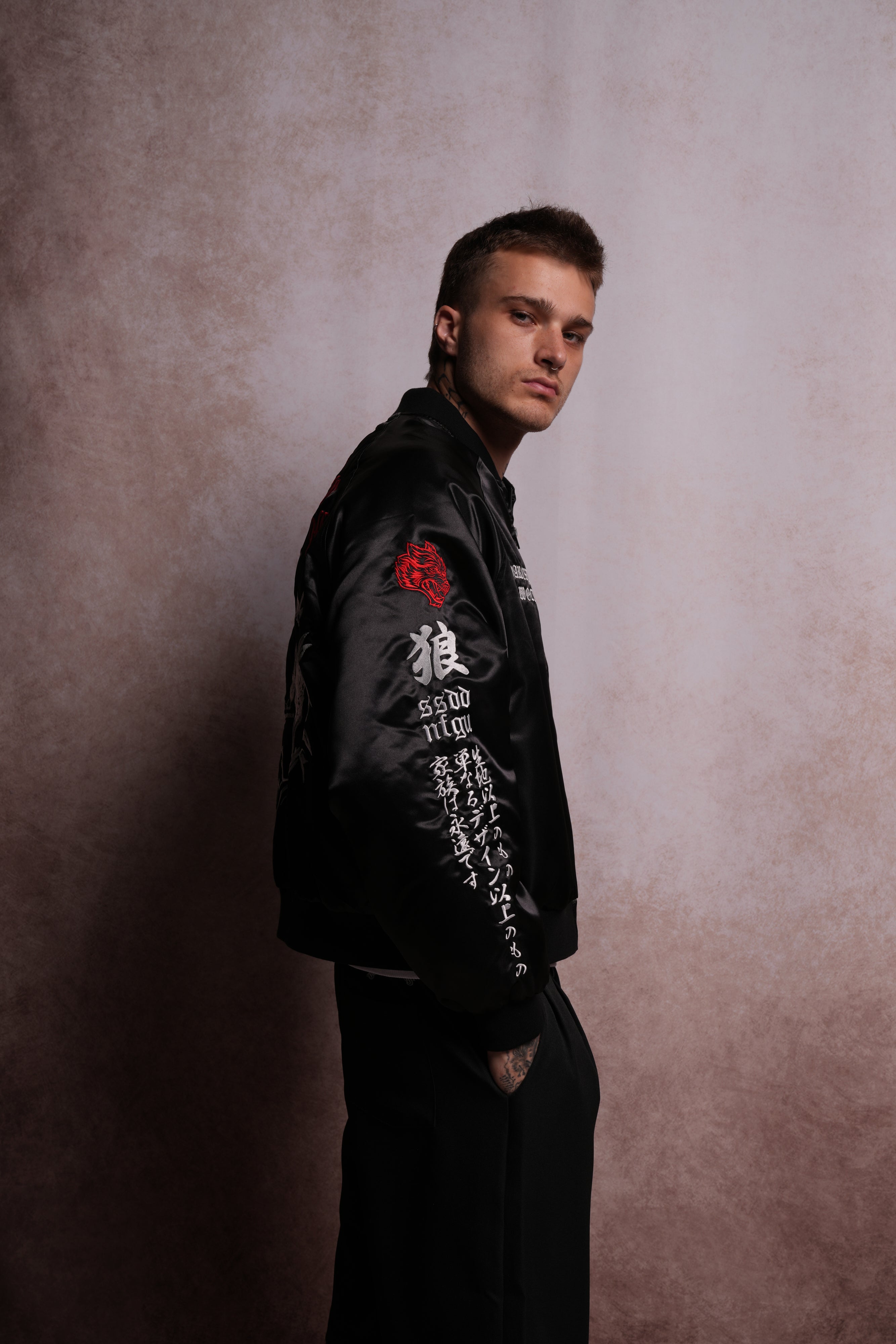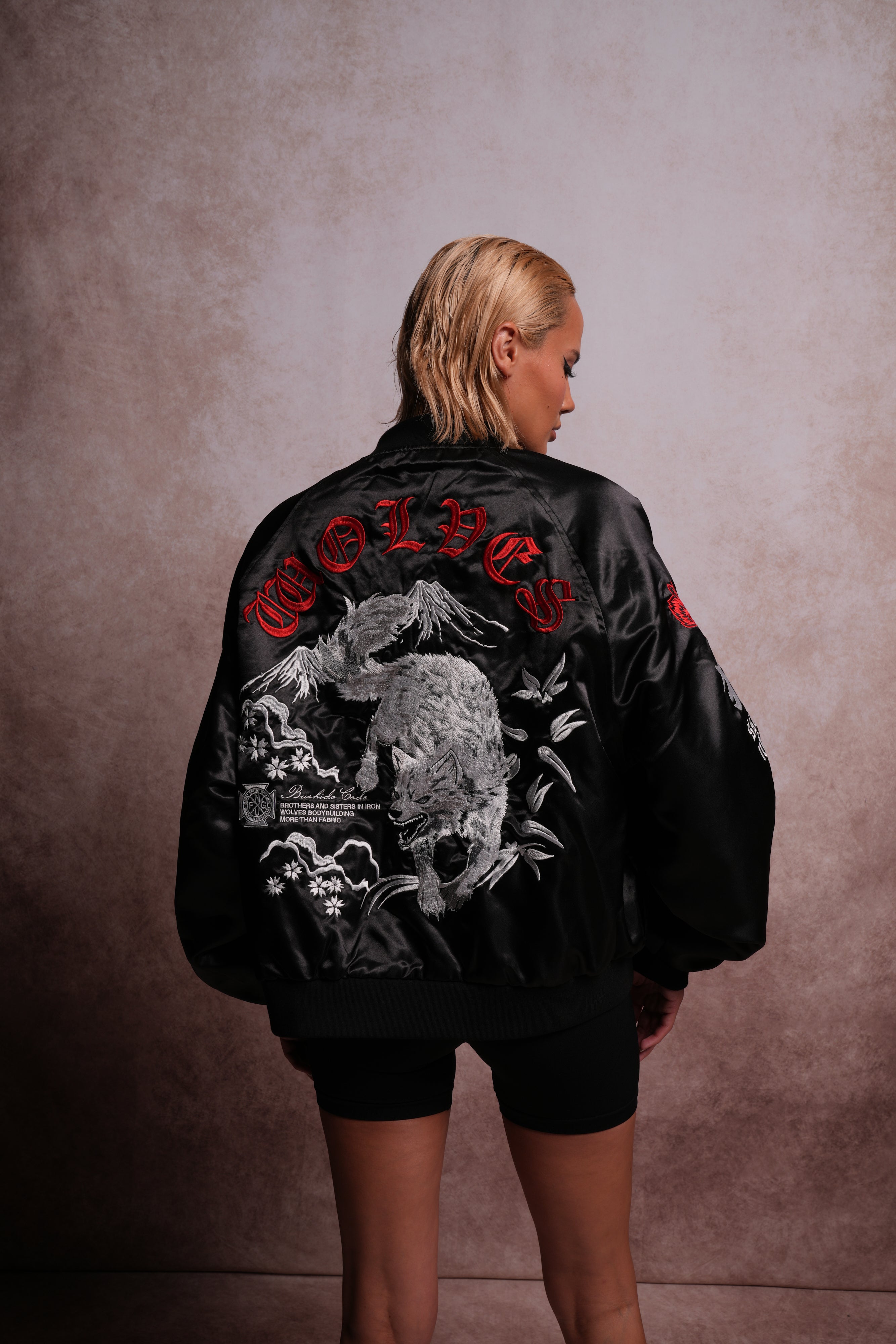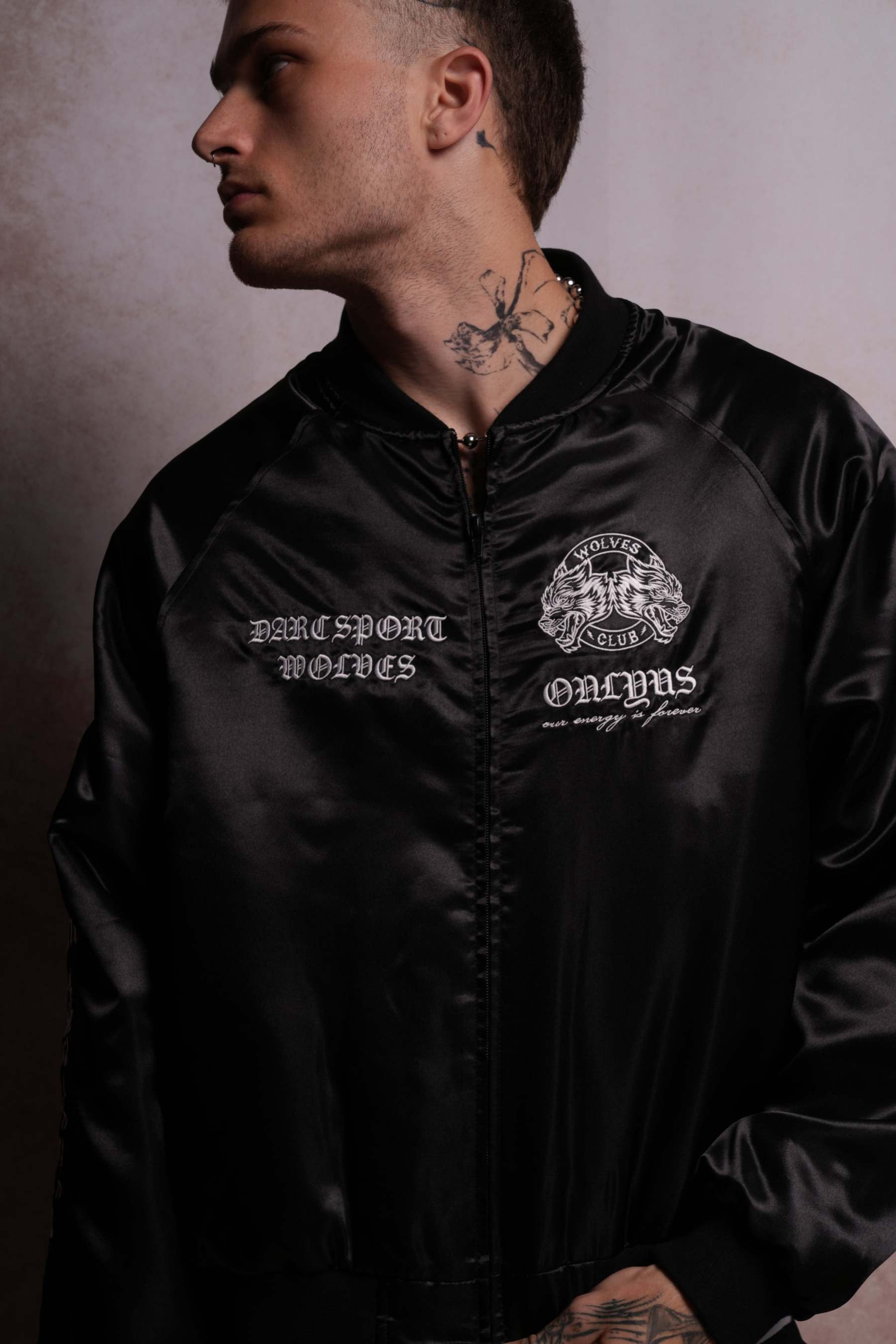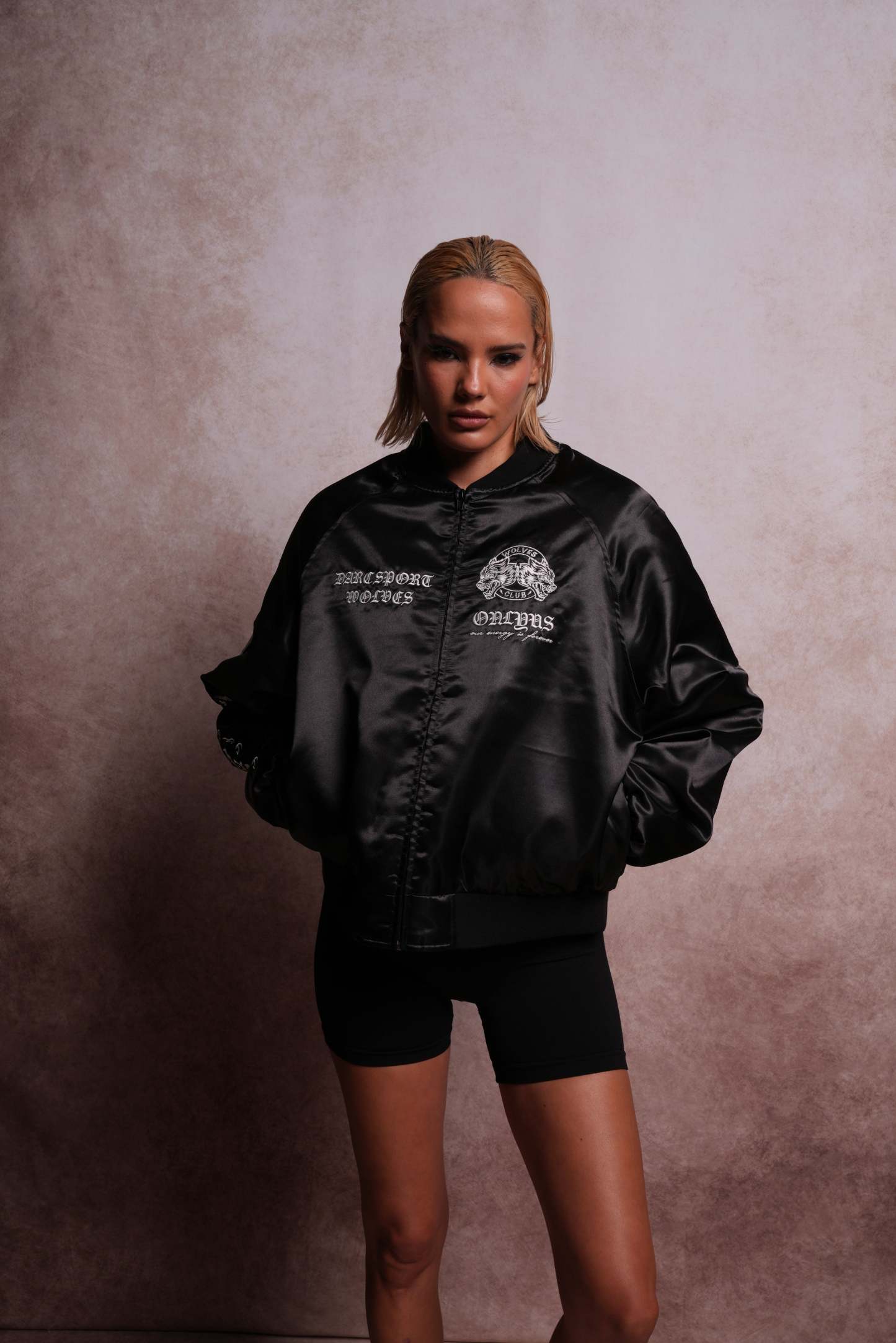 Darc Okami Cropped Satin Bomber Zip Jacket in Black
