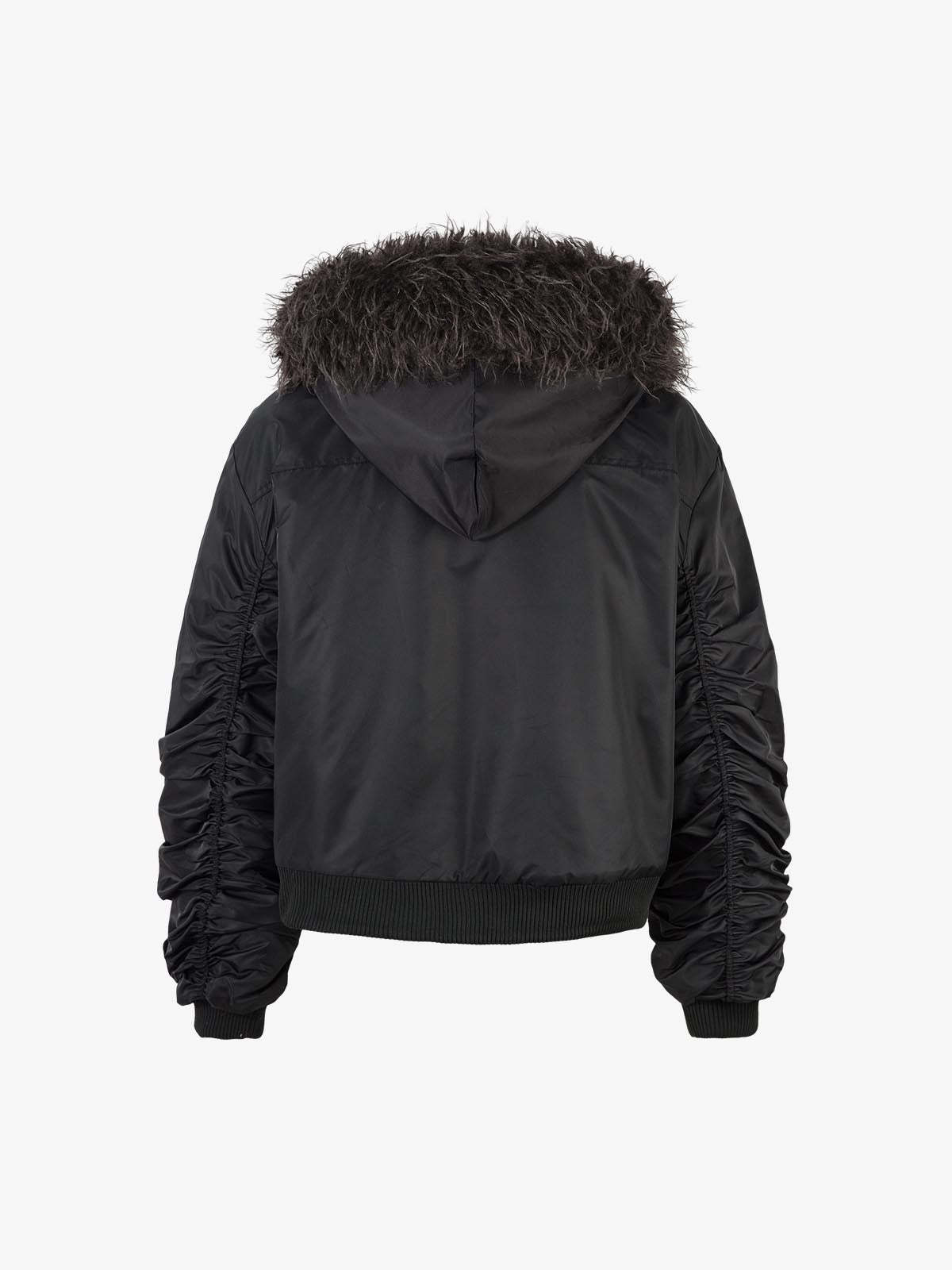 Detachable Faux Fur Collar Ruched Sleeve Bomber Jacket