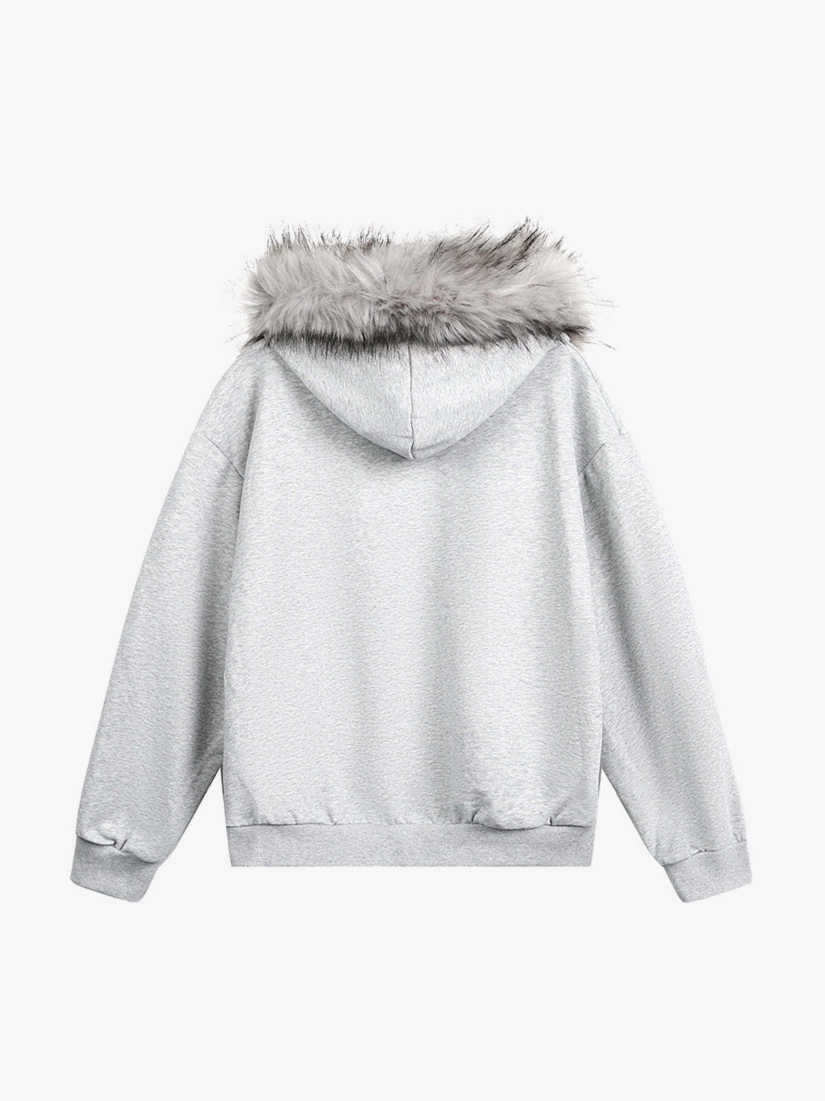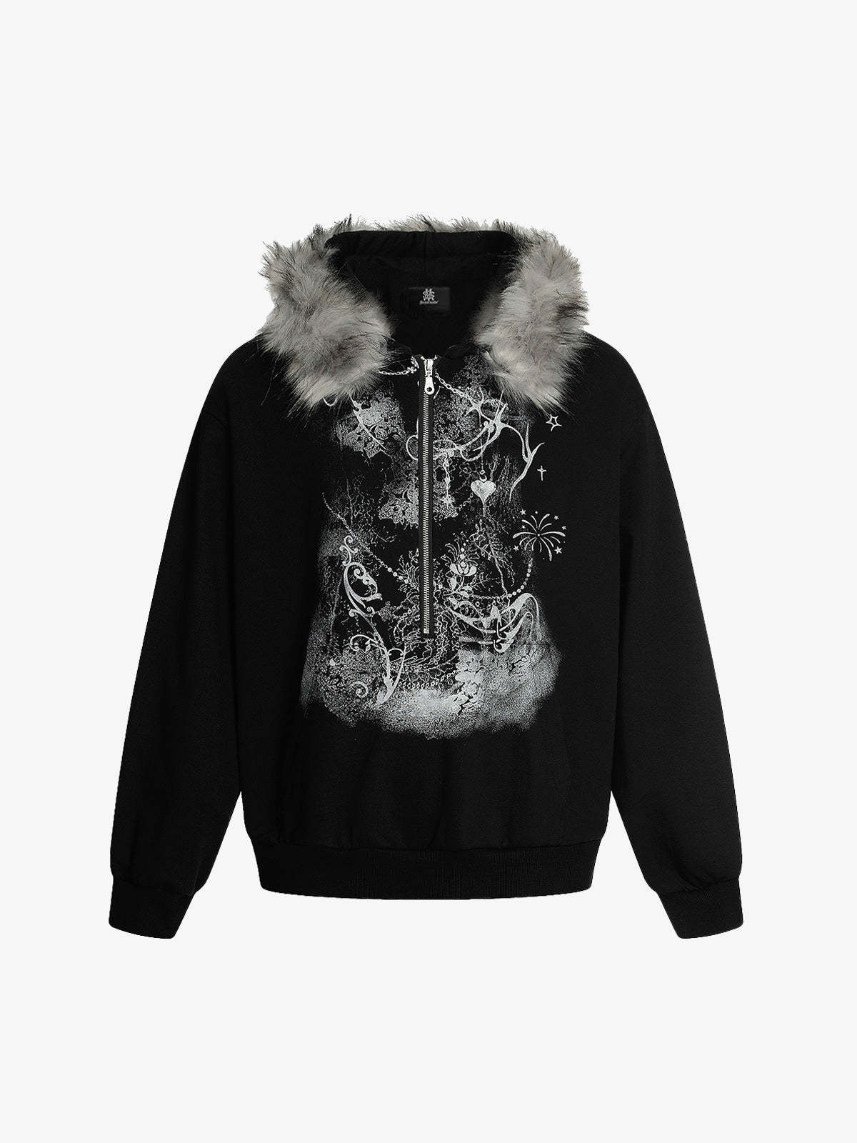 Detachable Fur Collar Printed Cardigan Half-Zip Hoodie