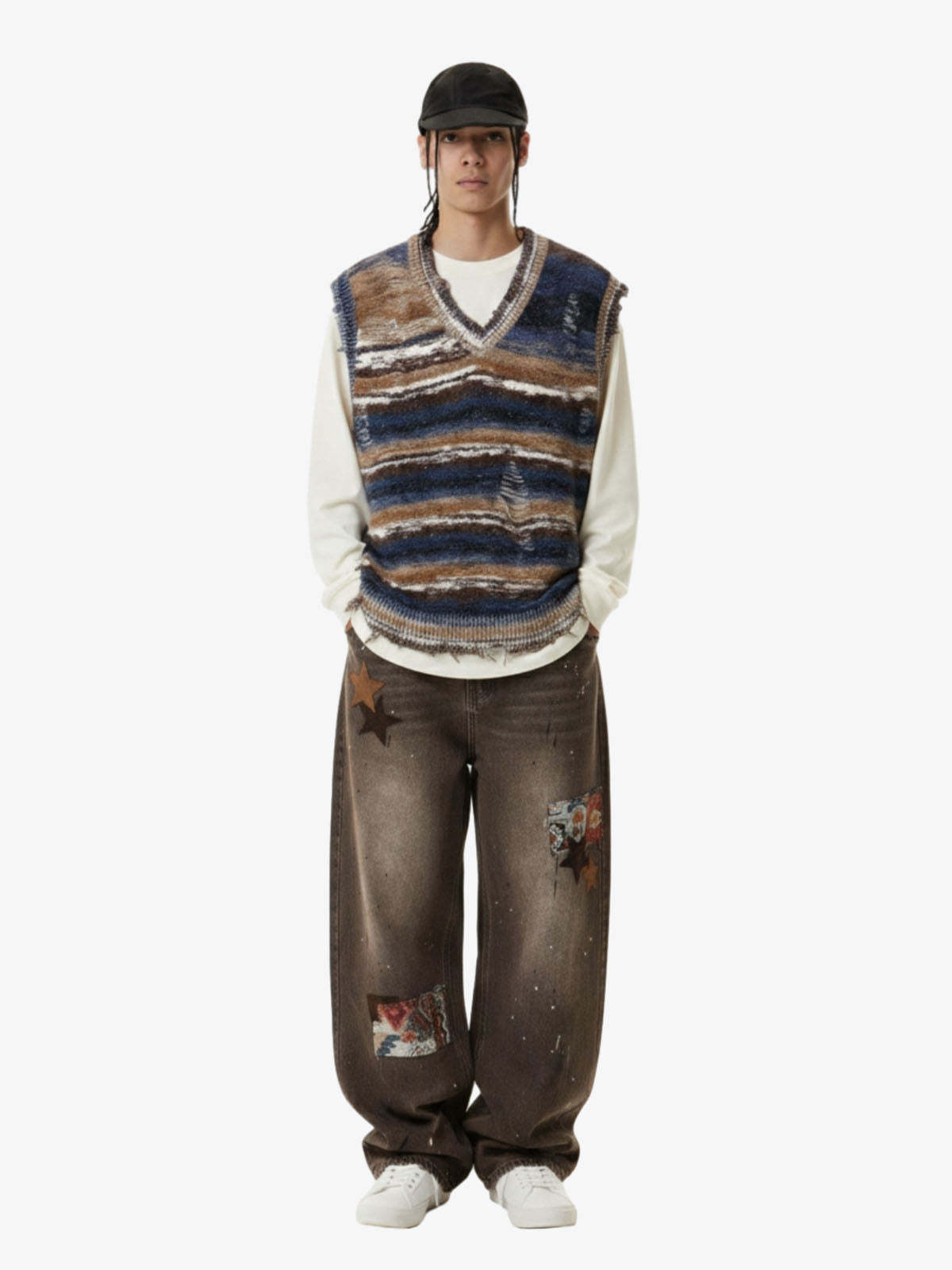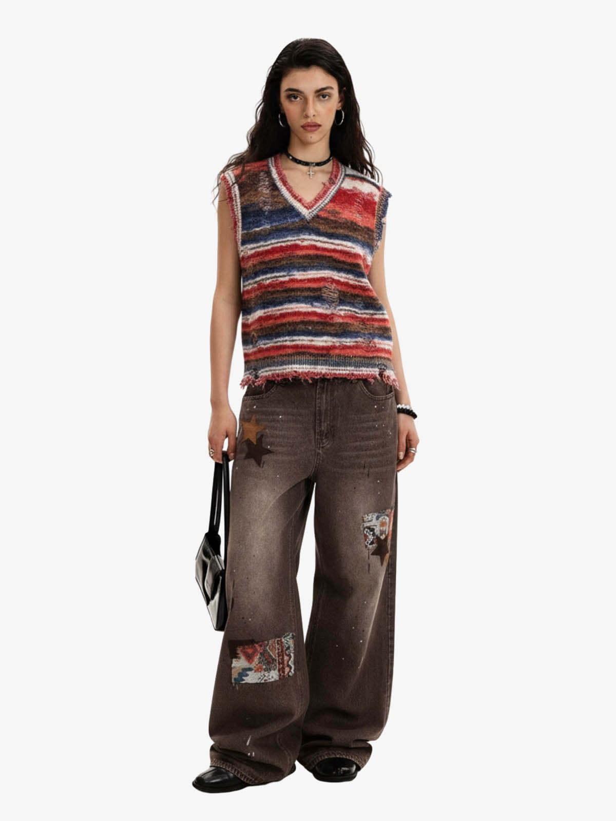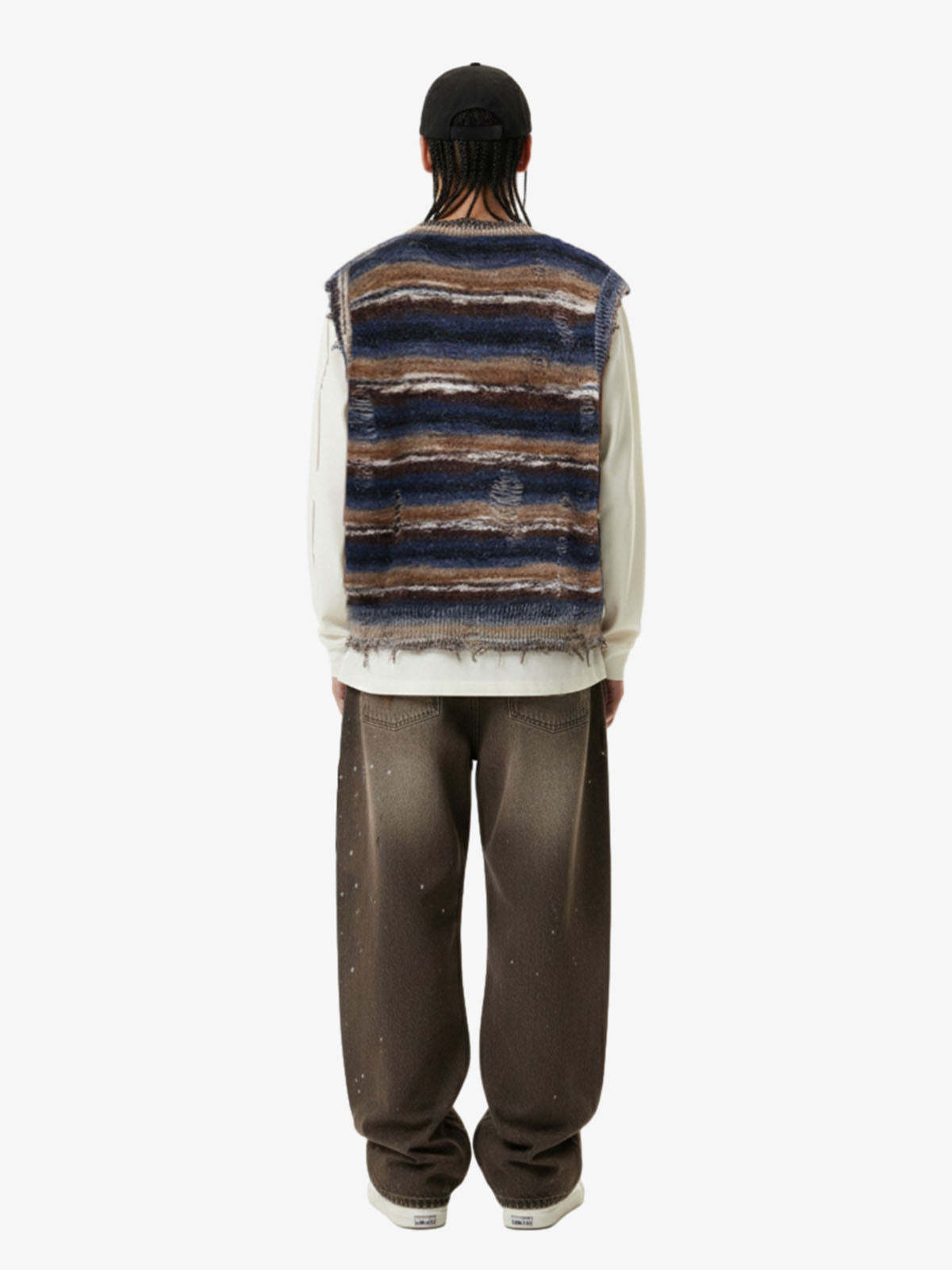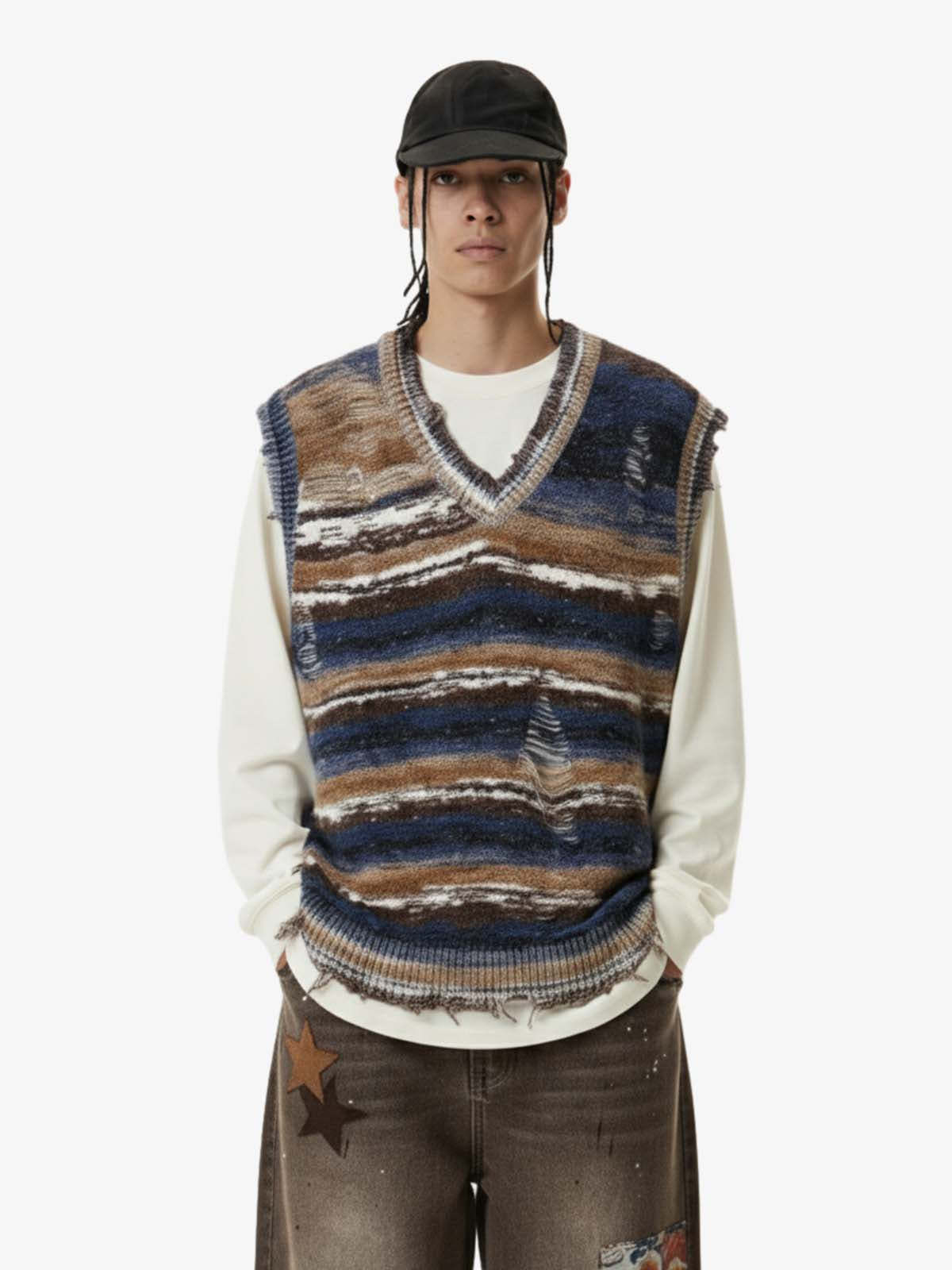 Frayed Edge Striped V Neck Knit Vest
