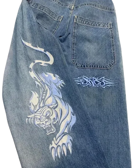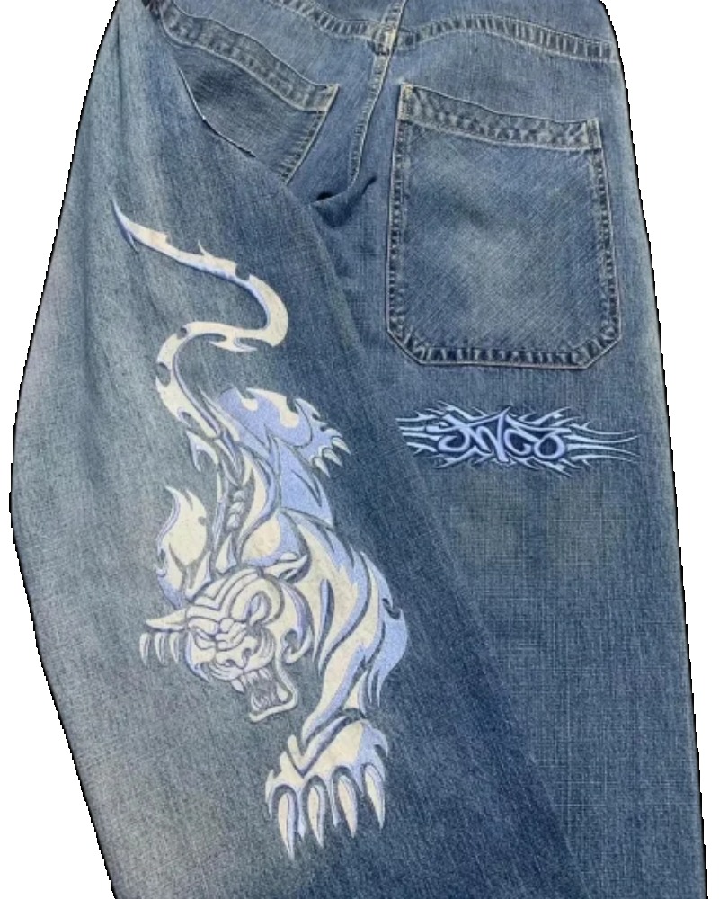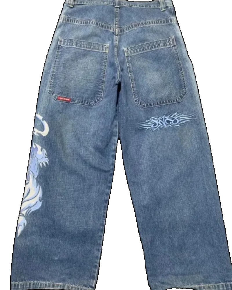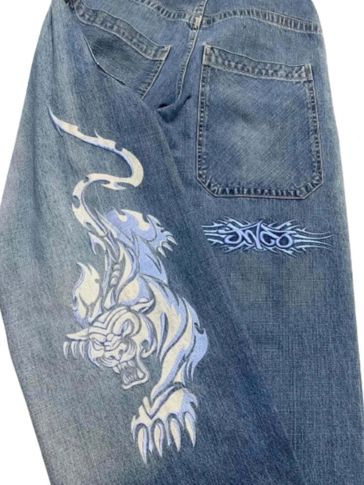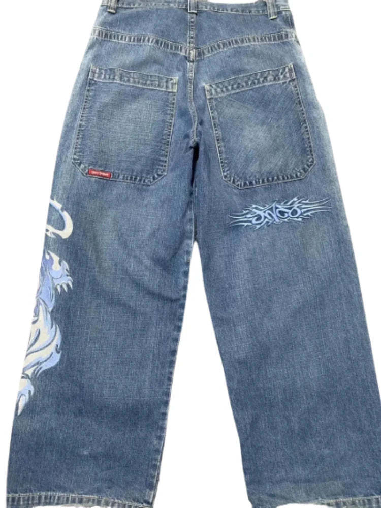 90s Streetwear Jeans Streetwear Y2K Mens Hip Hop Graphic Print Retro Blue Baggy Jeans Denim Pants New Gothic High Waisted Wide Trousers