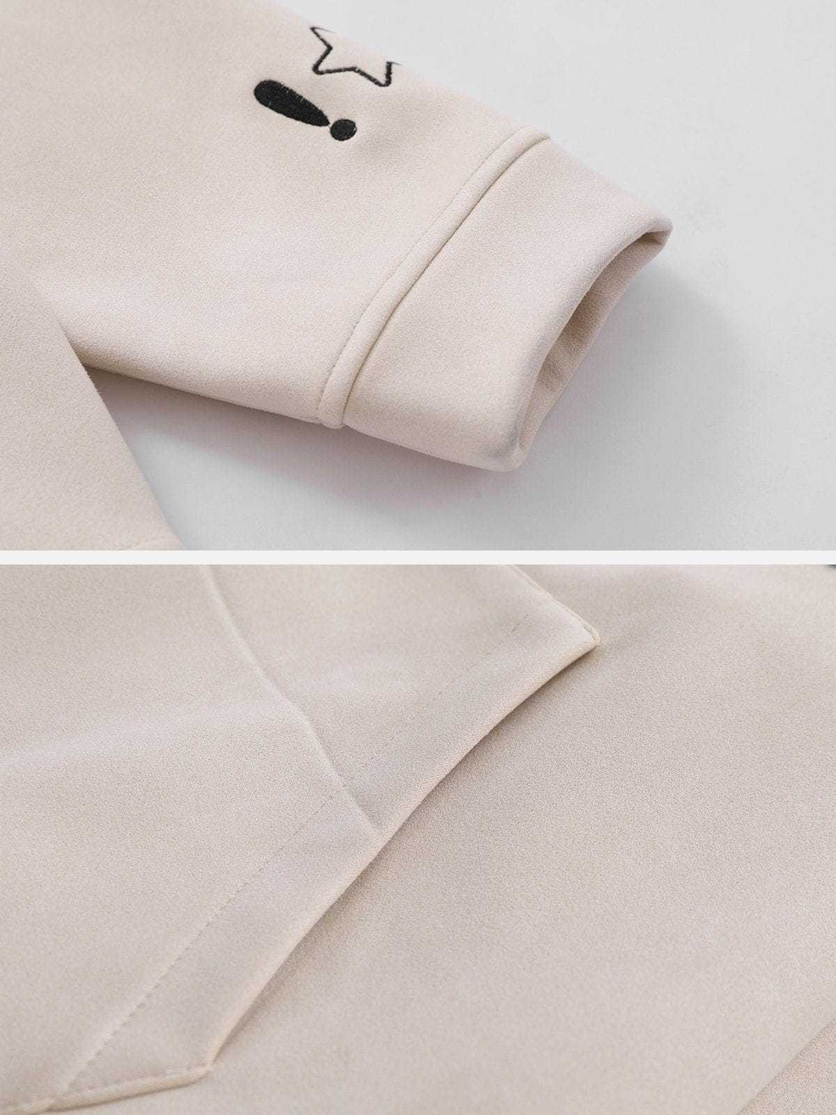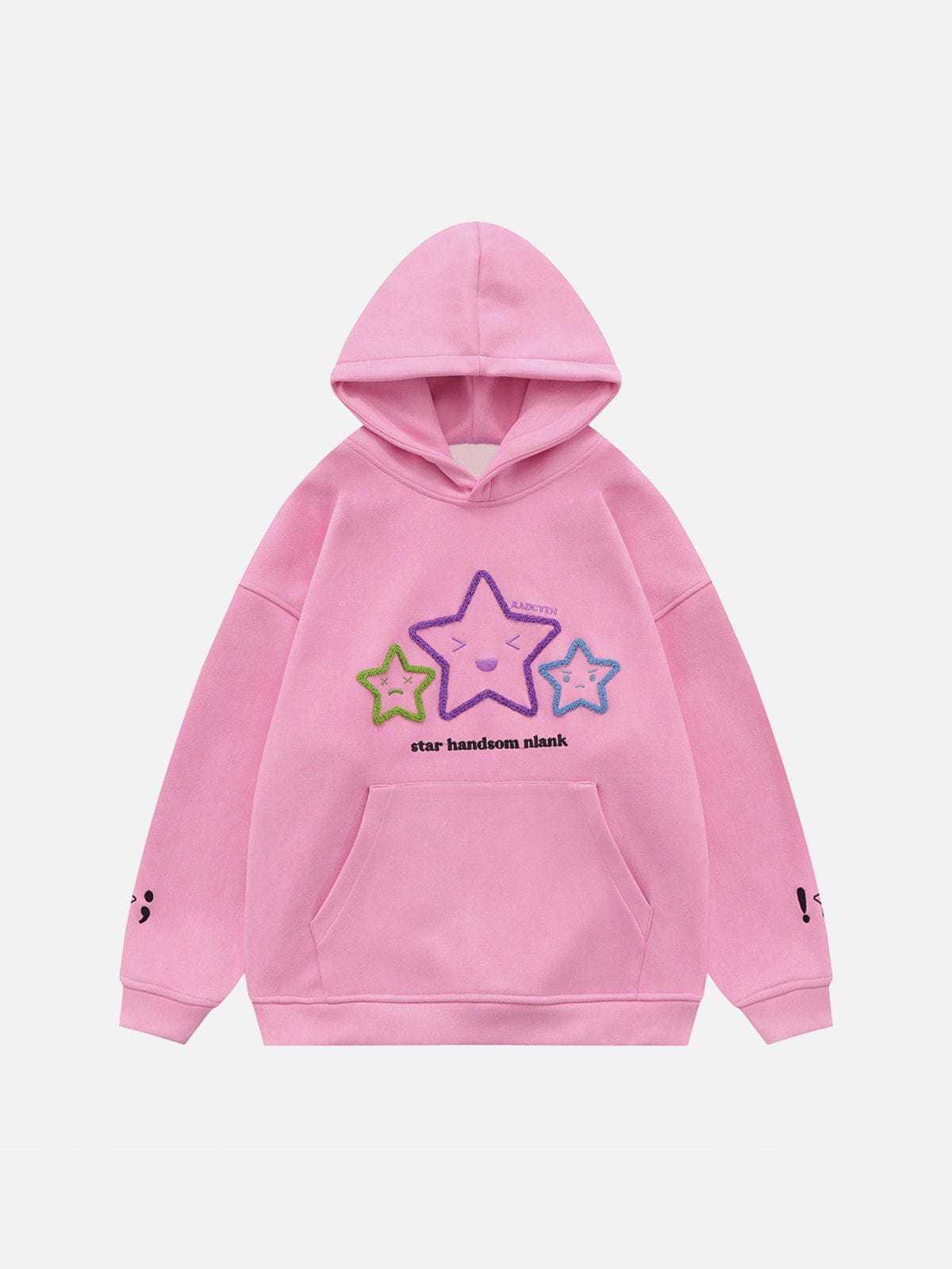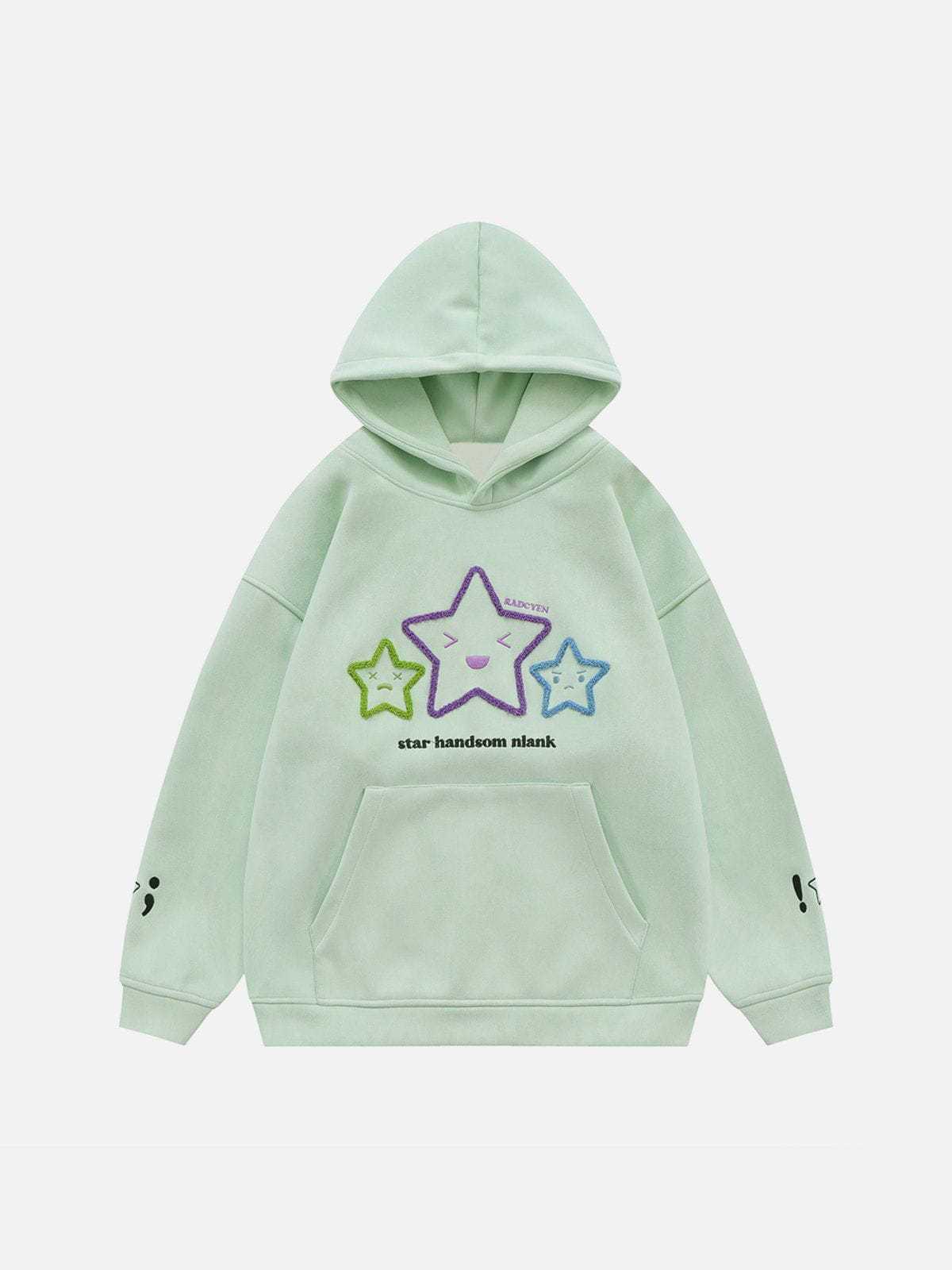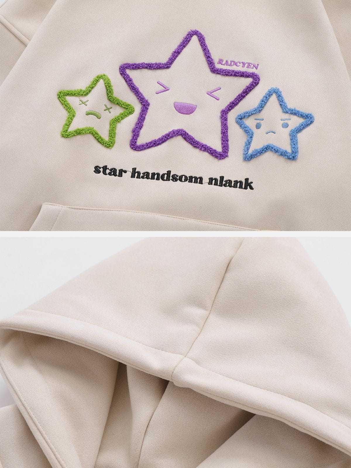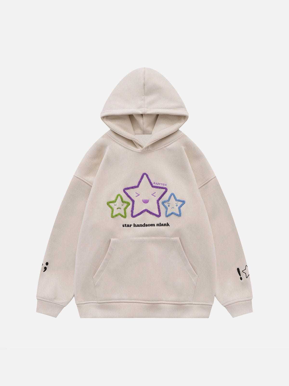 The standout feature of this hoodie is the exquisite embroidery on the front. Three different expressions of stars, along with letter embroidery, add a touch of playfulness and personality.The creativity doesn't stop at the front; the sleeves are adorned with star embroideries as well, adding a delightful and cohesive touch to the overall design.