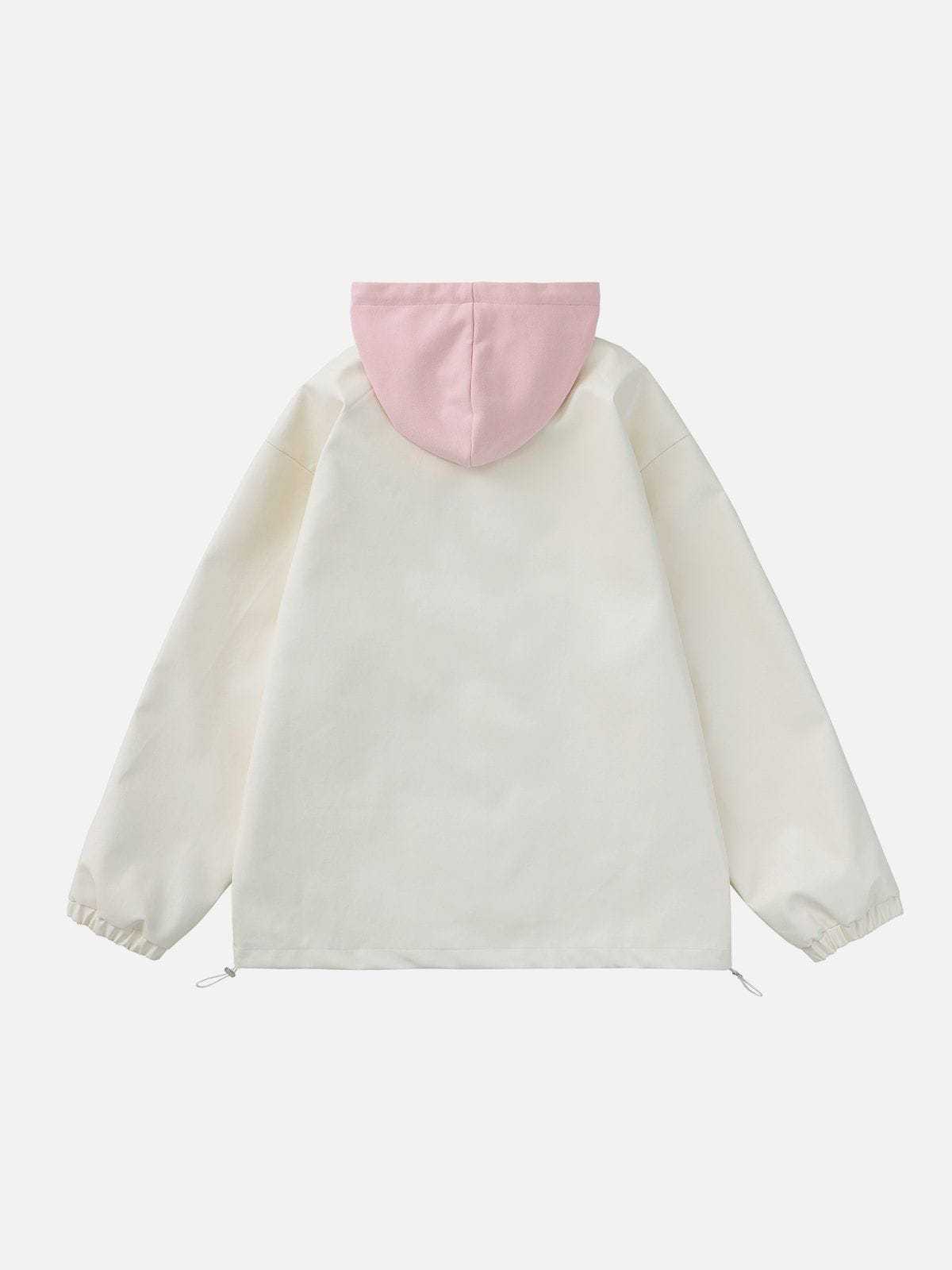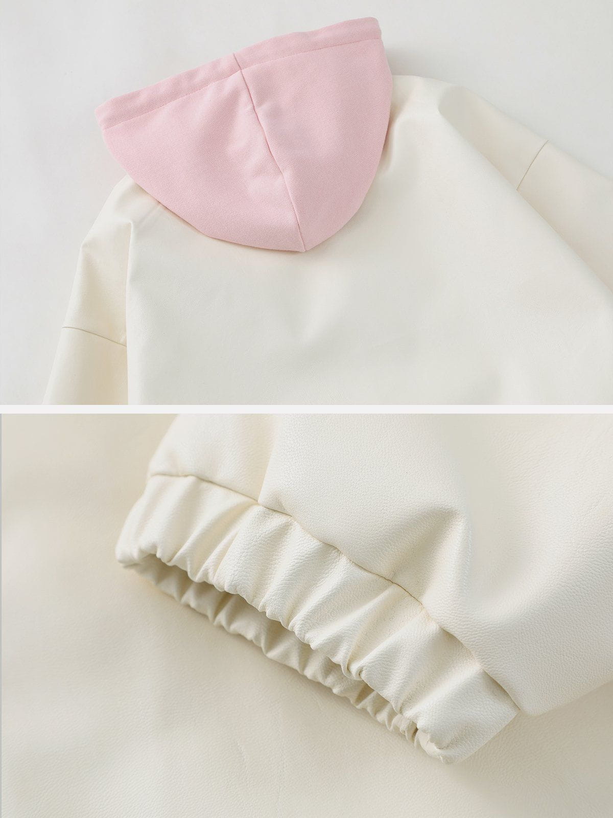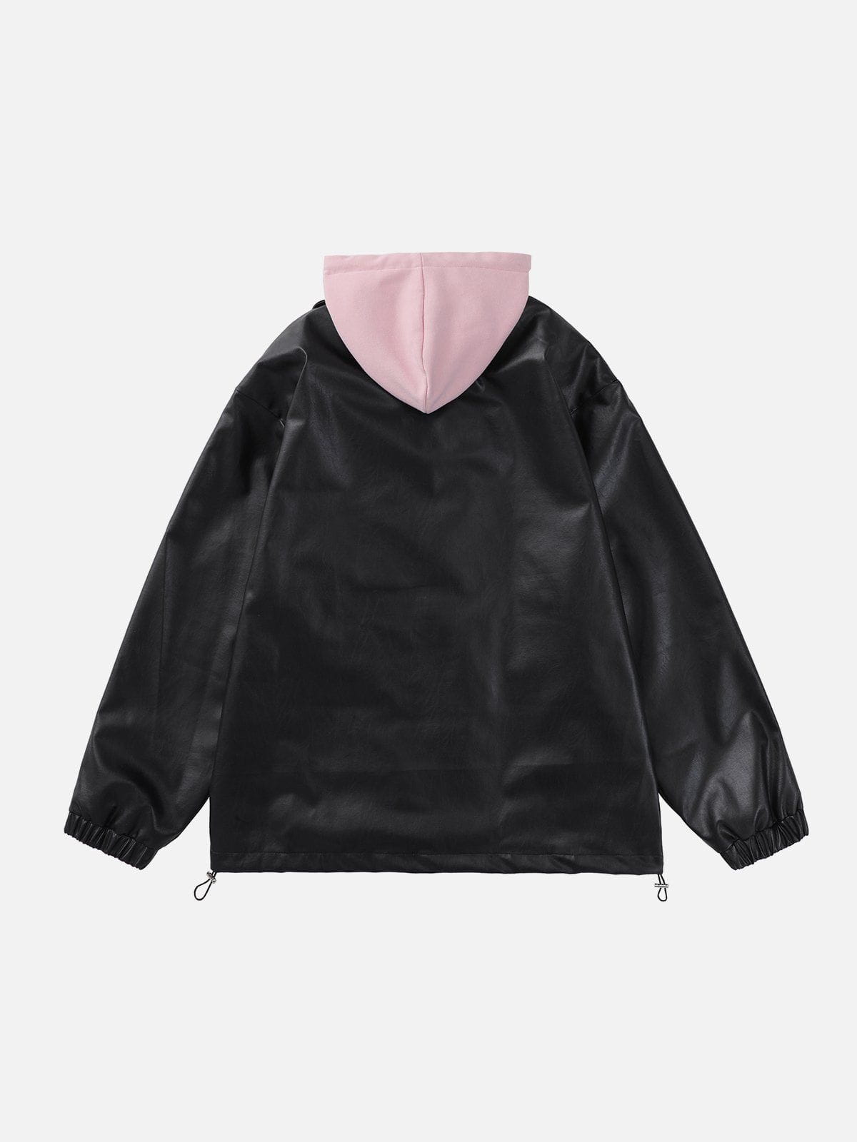 Featuring a sleek and stylish faux leather design, and the sleeves are fitted with a unique cinched design, providing a modern touch to a classic look. The attached hood adds an extra layer of warmth and protection against the elements. The front of the hoodie is adorned with a decoration, and there are some drawstring on the bottom hem.