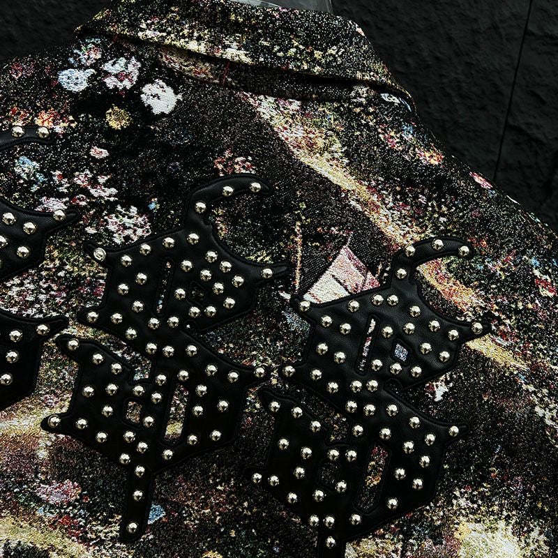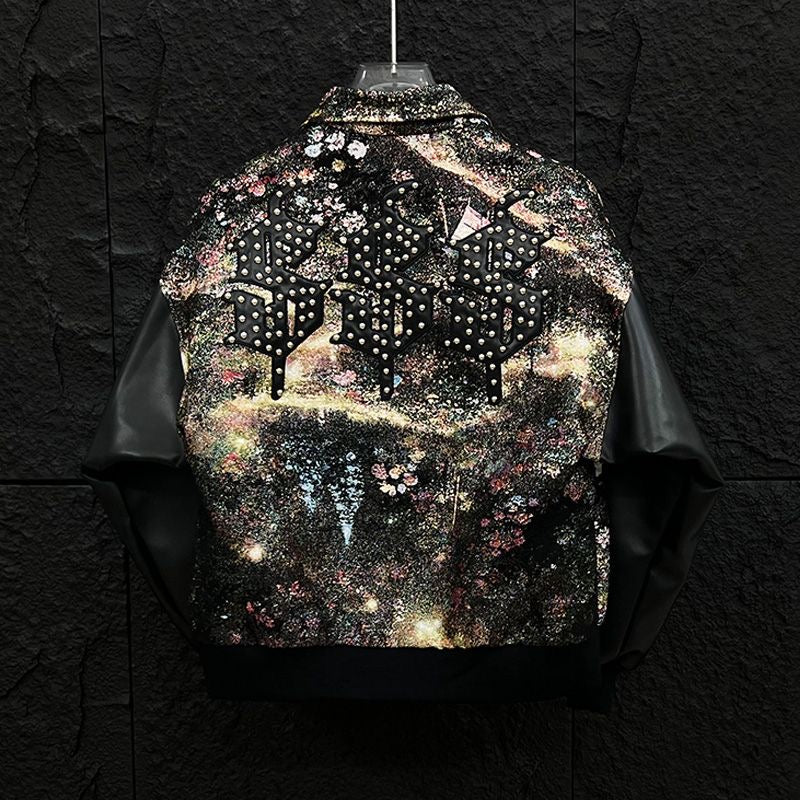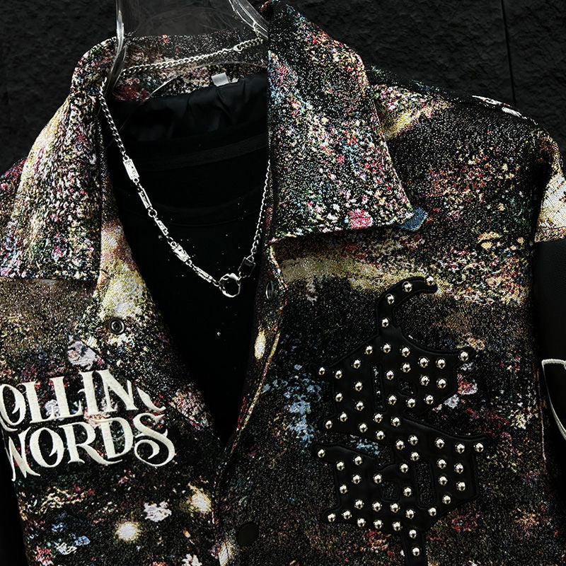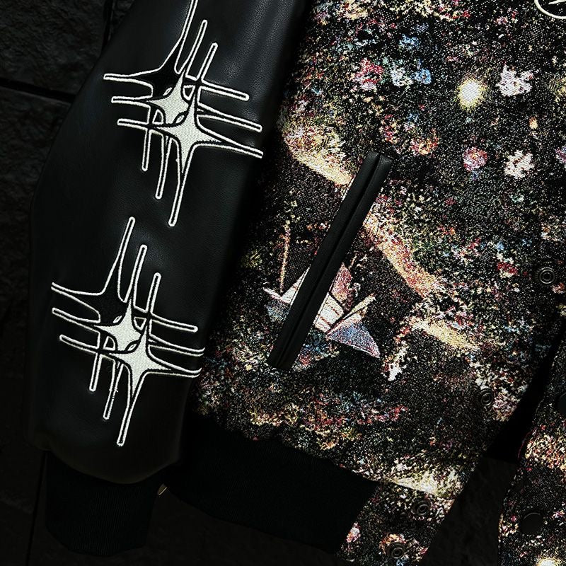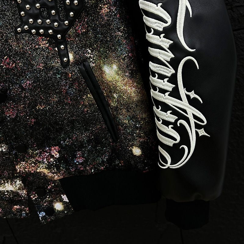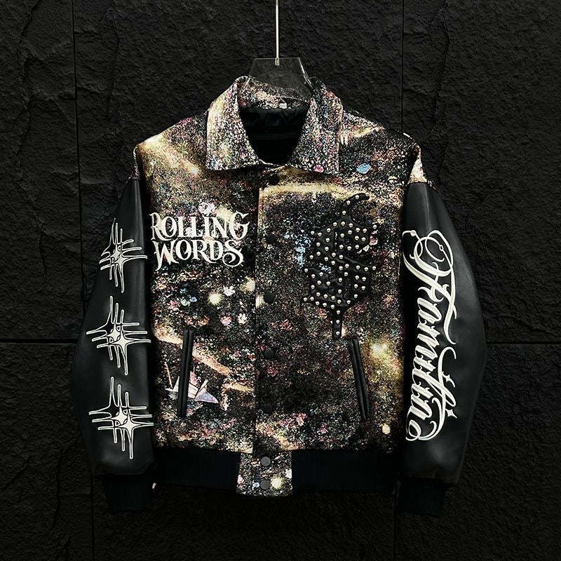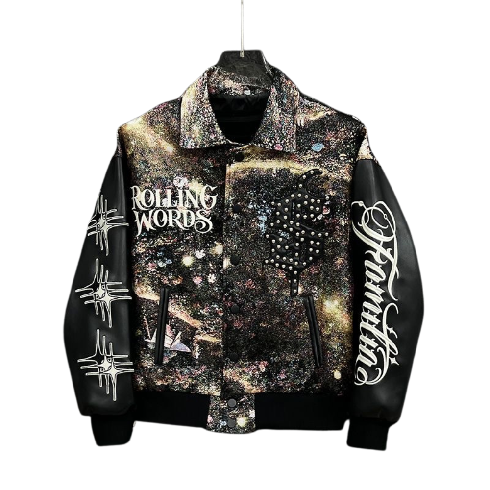Step into the cosmos with our Galactic Grit rhinestone varsity jacket. Featuring a bold, interstellar-inspired print and shimmering rhinestone detailing, this jacket is more than outerwear — it's a statement. The contrast leather sleeves bring a touch of rebellion, while the intricate embroidery like “Rolling Words” and celestial symbols reflect a streetwear aesthetic that's light-years ahead. Whether you're on the runway or sidewalk, let the stars be your spotlight.