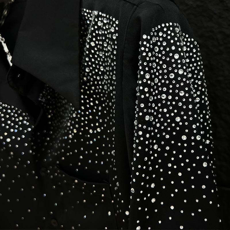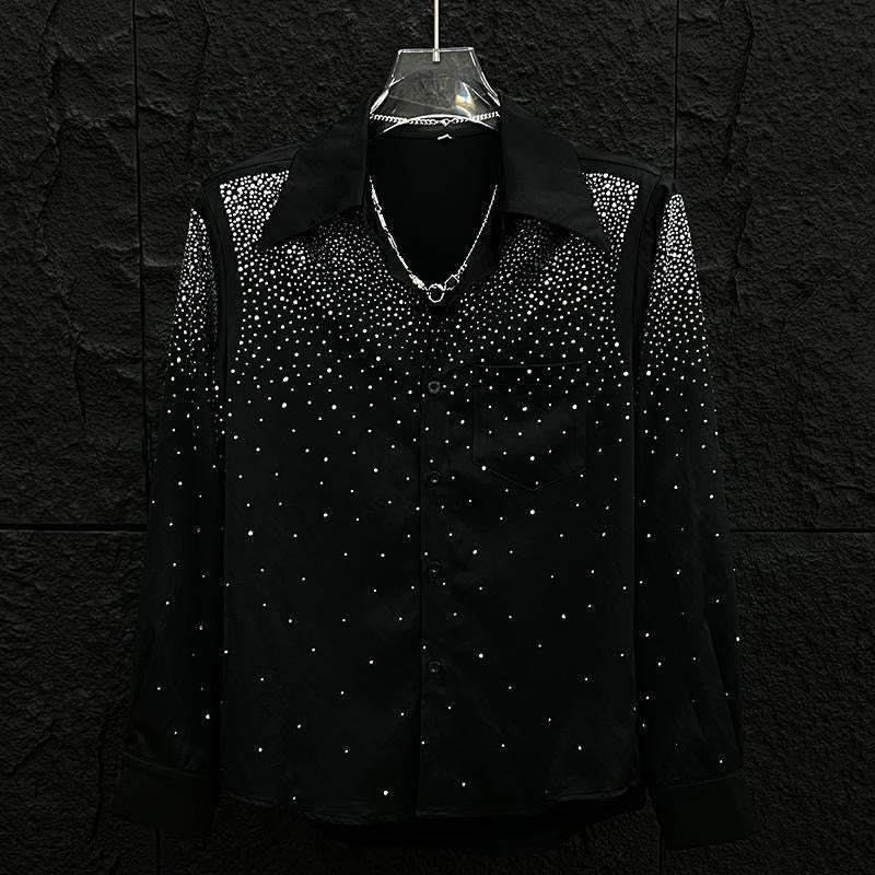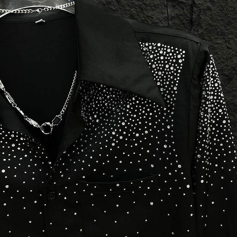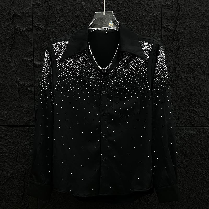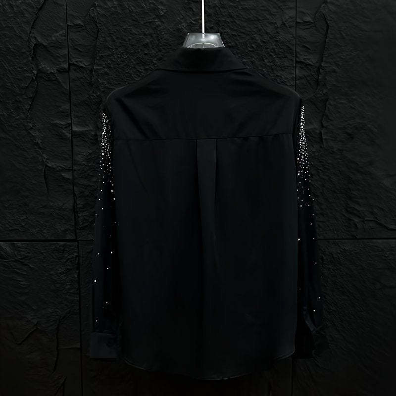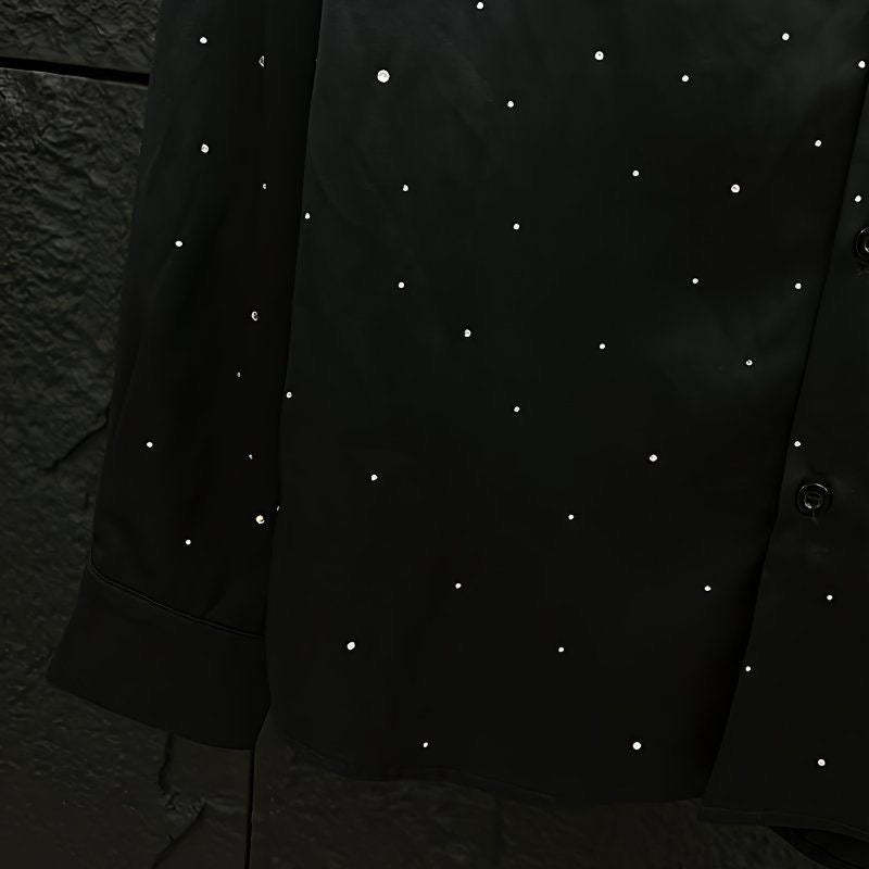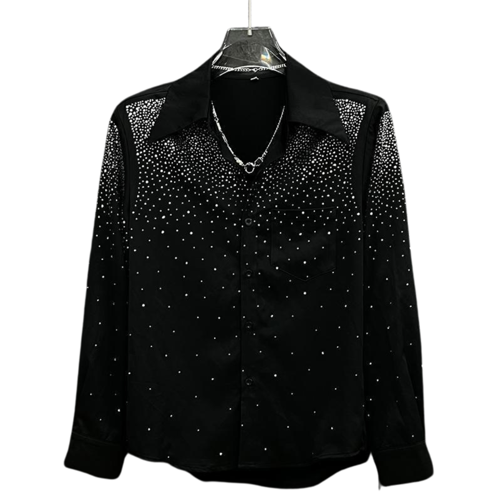 Step into the night like you were born to shine. Our Midnight Glimmer Shirt is a bold fusion of elegance and edge—crafted from a silky black fabric and covered in high-shine rhinestones that scatter like stars. Perfect for nights out or statement moments, it catches light with every move. Whether you're stepping on stage or into the crowd, this shirt says you didn’t come to blend in—you came to be unforgettable.